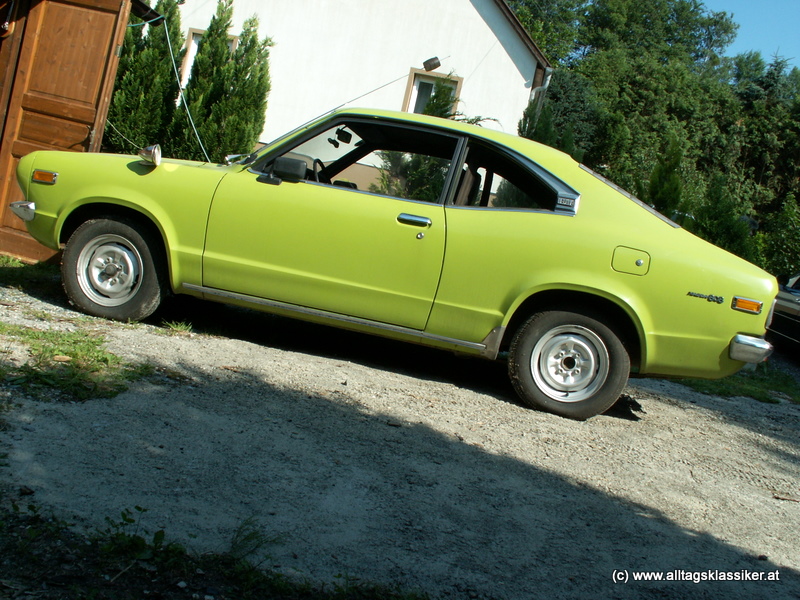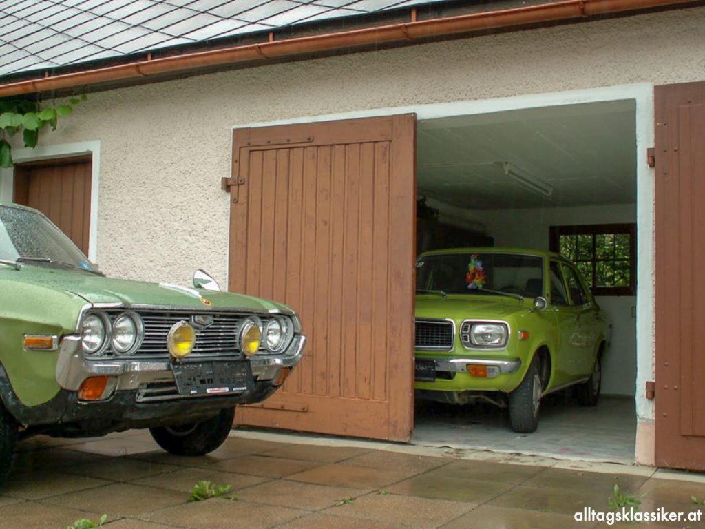 Und da stand sie dann vor der geräumigen Sammlergarage: Grün wie Mazda sie schuf! Alleine mit der Farbe hatte sie mich. Der Rest war nur noch Zubrot, wobei das auch nicht von schlechten Eltern war. Rund 91.000 km auf der Uhr, der fast unberührte Zustand, die Folien auf den hinteren Türverkleidungen die noch vom Werk drauf sind. Klar gab es auch Macken, aber bei einem 35 Jahre alten unrestaurierten Fahrzeug muss und kann man damit leben: Der Sprung im Armaturenbrett – ein altes Leiden bei Fahrzeugen aus den 70ern, die bereits genähte Sitzfläche am Fahrersitz, das schwarze Tigertape am Abschluss der Rückenlehne oben, die 2cm Nachlackierung entlang des unteren Karosserieendes, ein paar Rostbläschen unter der Frontstoßstange, der sichtbare Reparaturversuch am unteren Heckscheibenrahmen.