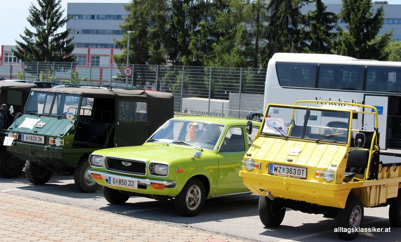 Bei der Gedenkfeier zum 100 jährigen Todestag des steirischen Mobilitätspioniers Johann Puch war ich mit der Erbse das Kuckucksei, im Nest der Produkte die einst die Werkshallen in Graz verlassen haben. Mangels Fahrzeug aus dem Hause Puch, wurde immerhin stilvoll mit einem Klassiker angereist.