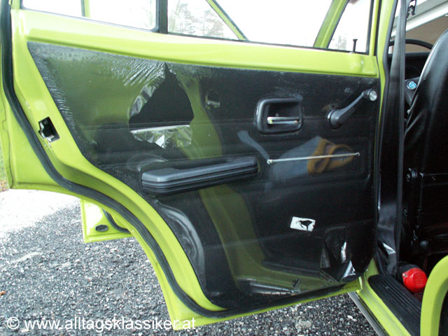 Die Kontaktaufnahme einer 818 Coupe Erbin weckte mein Interesse, denn sie bot ein ebenfalls erbsengrünes Coupe aus der ersten Serie ihres verstorbenen Vaters zum Kauf an und bot mich um meine Einschätzung des Zustandes. So bot der Trip ins Südburgenland mal die Chance ein Coupe aus nächster Nähe zu sehen, vor allem die Mehrausstattung die das Coupe hat war äußerst interessant. Auch hier fanden sich noch die Schutzfolien auf den Türverkleidungen vom Werk, die weder der Importeur noch der Besitzer entfernt hatte!