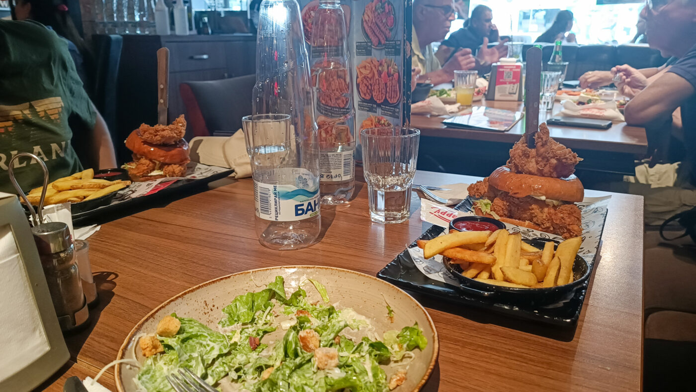Klar, wir hätten auf direktem Weg nach Rumänien fahren können, aber ich musste ja unbedingt Kassetten kaufen. Es war gleich klar, dass dieser Tag ein sehr heißer werden würde. In Ruse hatte es schon 37 Grad, und in Bukarest sollte es noch fast 40 Grad brutzelnd heiß werden. Eigentlich war der Plan, den Tag in Bukarest zu verbringen, aber es war kaum genug Energie für Kaufland da. Also haben wir ein letztes Mal bei einer Happy Bar gegessen und uns dazu entschieden, lieber an Land zu gewinnen, anstatt in Bukarest zu Spiegelei zu werden. Ruse selbst ist auch recht schön, bekannt für die ‚Wiener Architektur‘. Für uns, wo wir ja Graz gewohnt sind, war das natürlich viel weniger Attraktion als das kühle Restaurant.