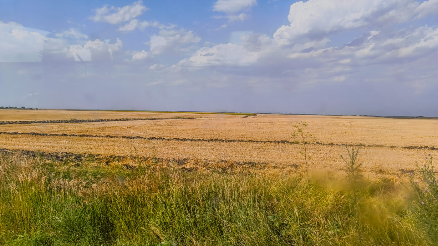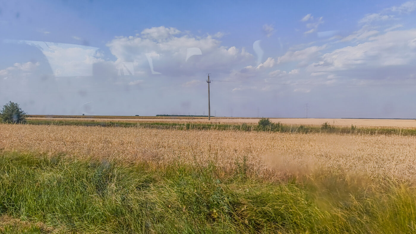 Jedenfalls haben wir an diesem Tag viel Zeit in unserer beheizten Jausenbox verbracht – alles ohne Klimaanlage. Inzwischen waren wir es schon gewohnt, ständig durchnässt zu sein und kochendes Wasser zu trinken. Der Kühlschrank war zwar eine tolle Idee, aber in der Praxis habe ich noch nie etwas Kühles rausgenommen, also war es wohl eher ein Wärmeschrank. Jenseits der Donau ändert sich die Gegend komplett: Weg sind die Berge und Hügel, und zurück bleibt… nichts. Viele Stunden gab es nichts zu sehen außer weites Nichts, flache Felder bis zum Horizont. Die Straßen waren zwar oft neu, aber einfach schlecht gemacht.