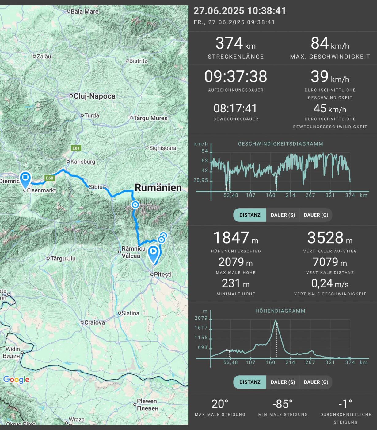 Insgesamt komme ich zu dem Schluss, dass Rumänien noch viel mehr Erkundung benötigt, um sich ein Bild machen zu können. Auf den ersten Blick scheint Rumänien komplett anders als die anderen Balkan-Länder und die Expertise in gewissen Dingen scheint recht gering zu sein, dafür scheint das Gebirge noch sehr viel mehr zu bieten. Das Fehlen jeglicher Stadtplanung in kleineren Orten war uns neu, gleich wie die welligen neuen Straßen und unser schiefes Apartment. Wie es tatsächlich ist, kann ich nicht beurteilen. Was ich aber beurteilen kann, ist deren Autogeschmack: Meistens sieht man Dacia, manchmal noch etwas Dacia, mit etwas Glück noch einen Dacia, und wenn man ganz genau hinschaut, den einen oder anderen ARO.