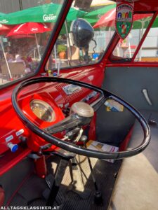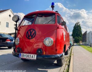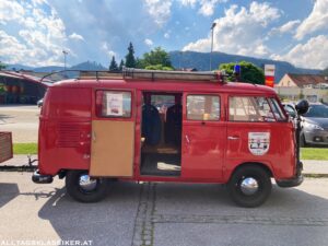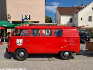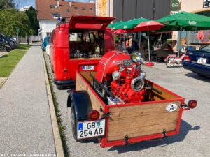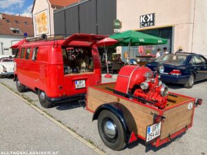 So auch am 16. Juli 2022, wo sich bei prächtigem Wetter wieder eine bunt gemischte Truppe einfand. Immer wieder für Staunen sorgen die Volkswagengespanne, egal ob Käfer oder T1 Bus mit zeitgenössischen Anhängern. So ein T1 in vollem Feuerwehrornat mit Pumpe am Hänger macht schon was her.