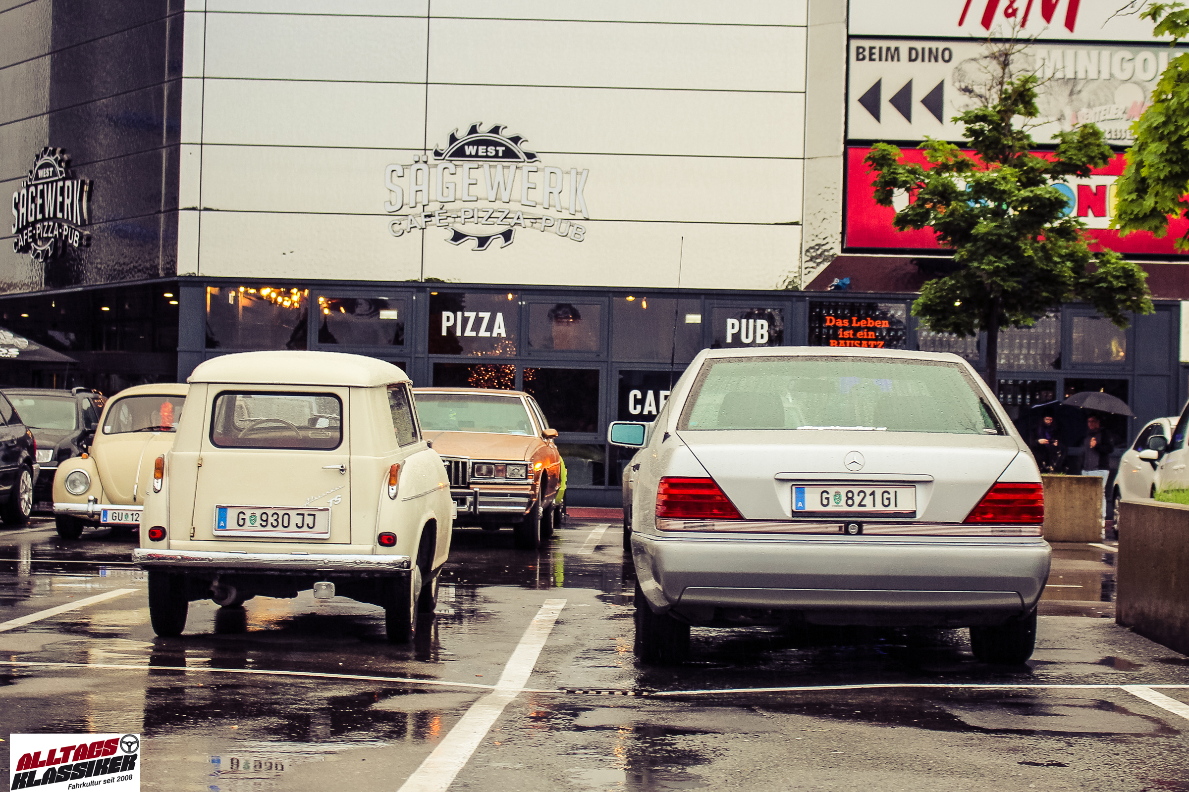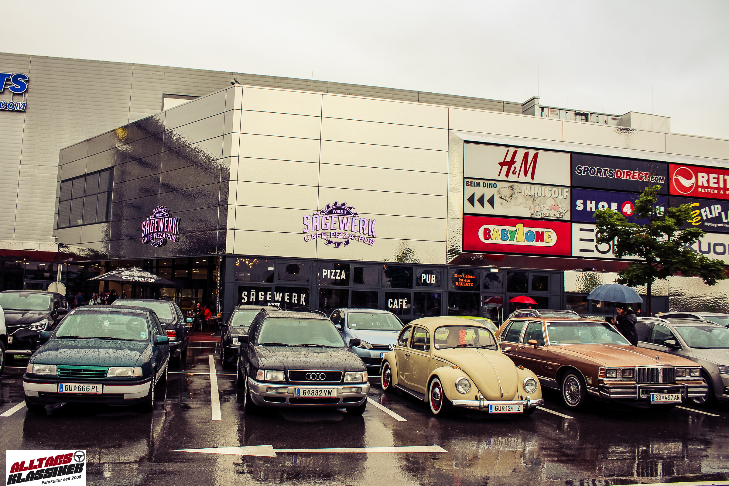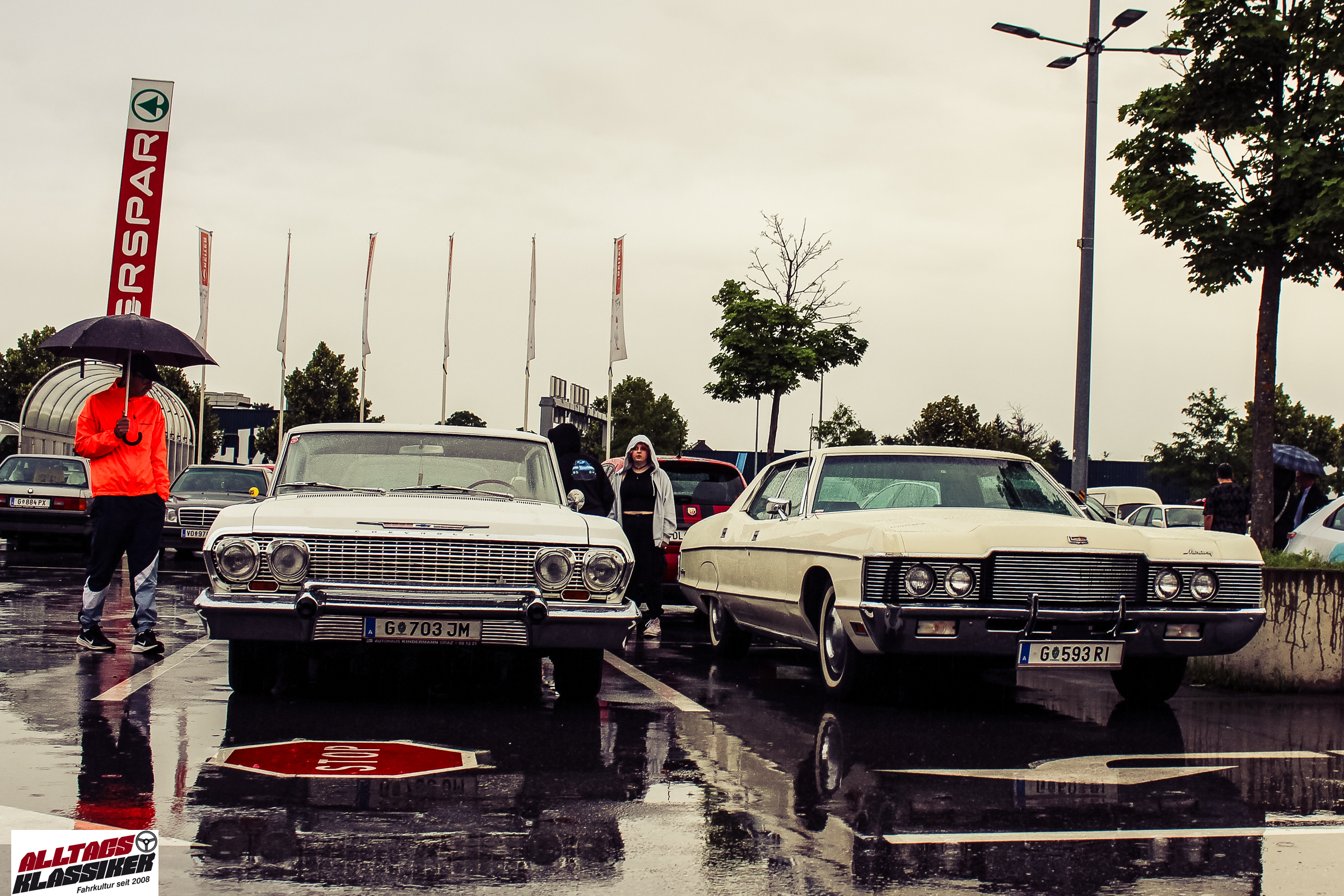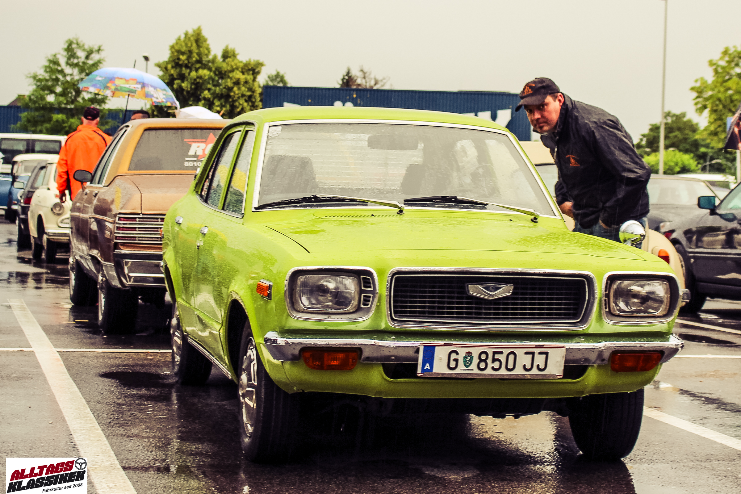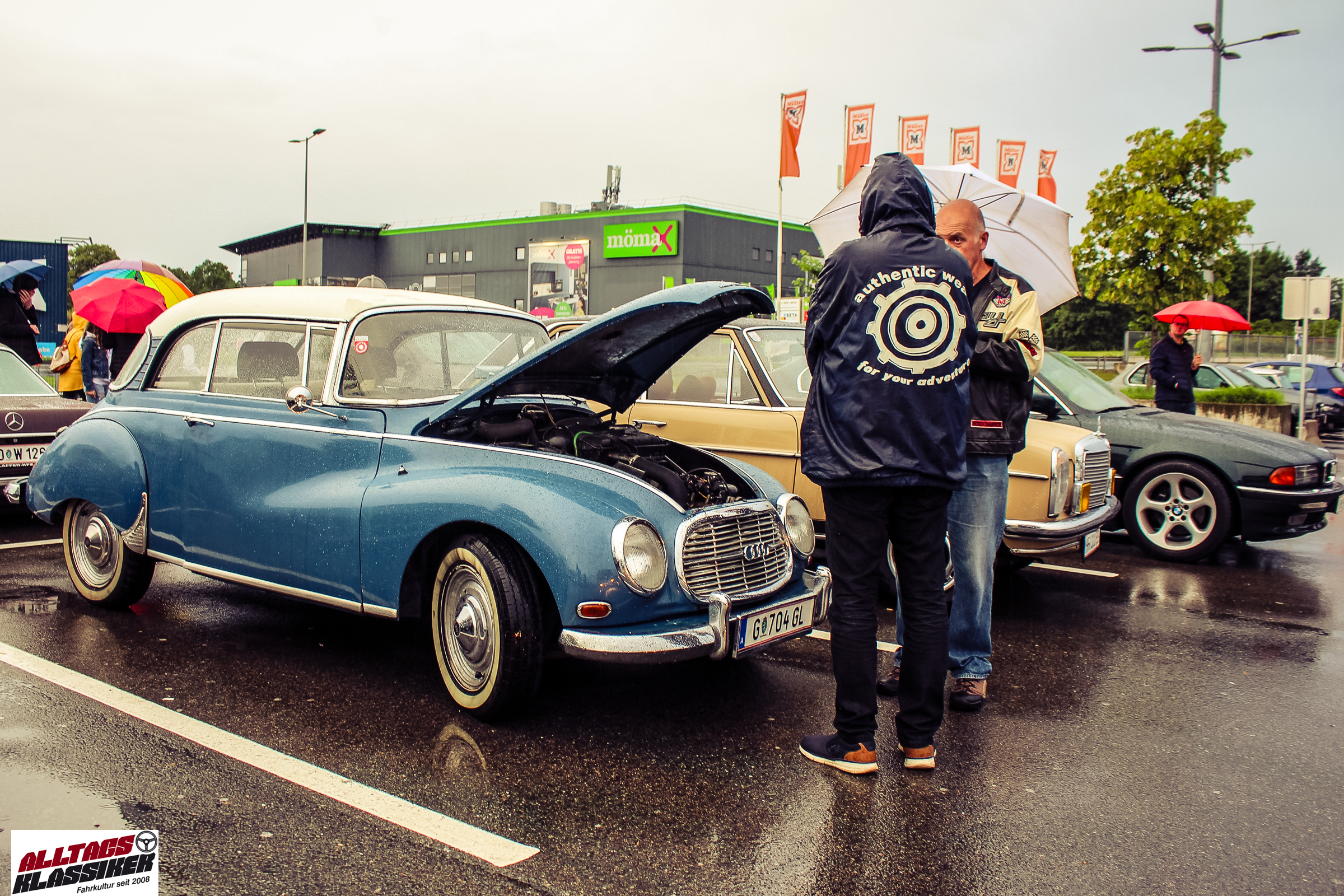 Aber gestandene Piloten von Oldtimern und Youngtimern hält ein wenig feuchte Luft nicht davon ab, am ersten Samstag des Monats nach Graz ins Center West zu cruisen. Regen hin oder her! Mit einer guten Regenjacke, einer Kappe, Regenschirm und wasserdichten Schuhen, konnte man gut stundenlang den Abend trotzdem draußen bei den Oldies verbringen.
