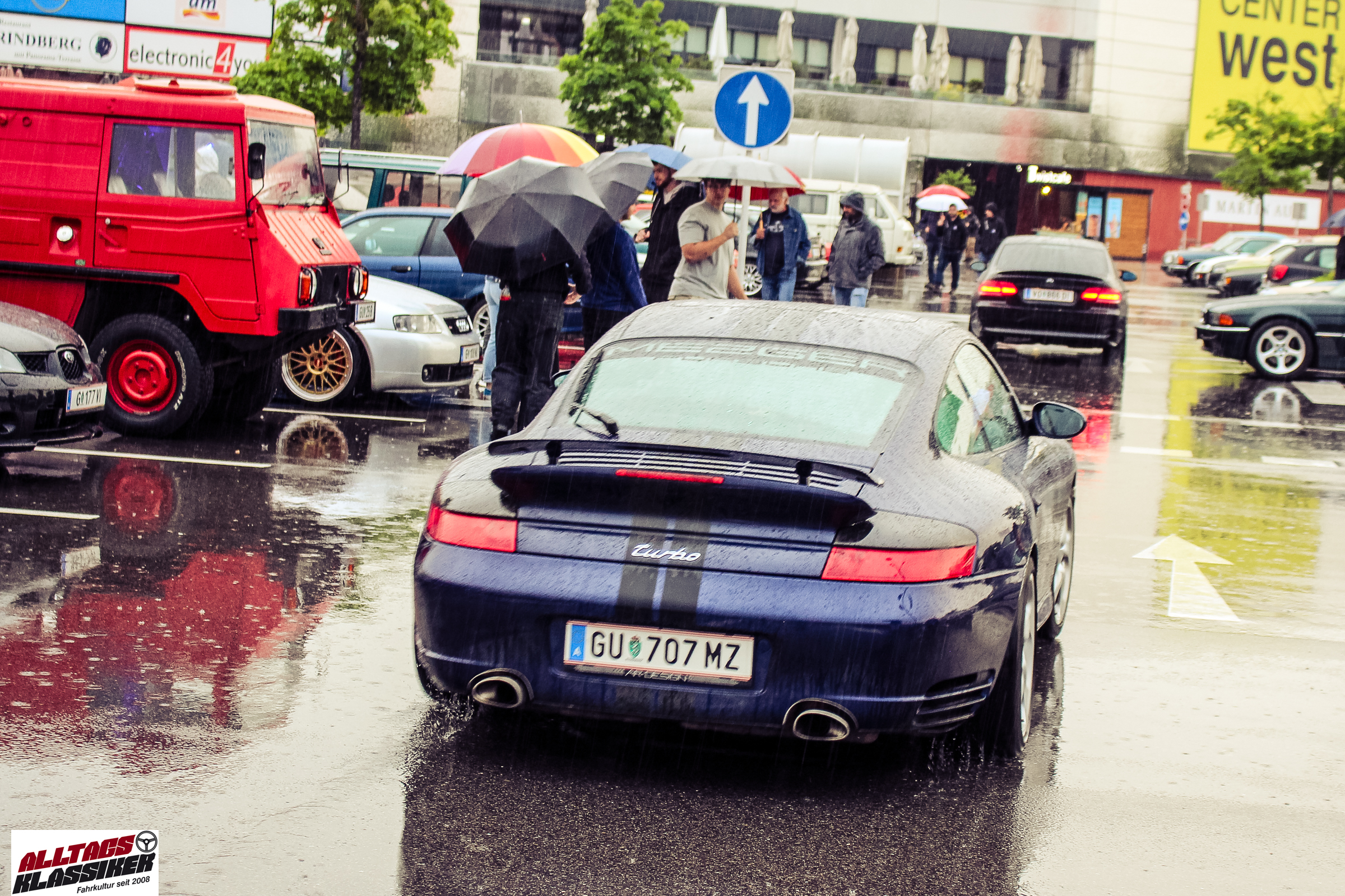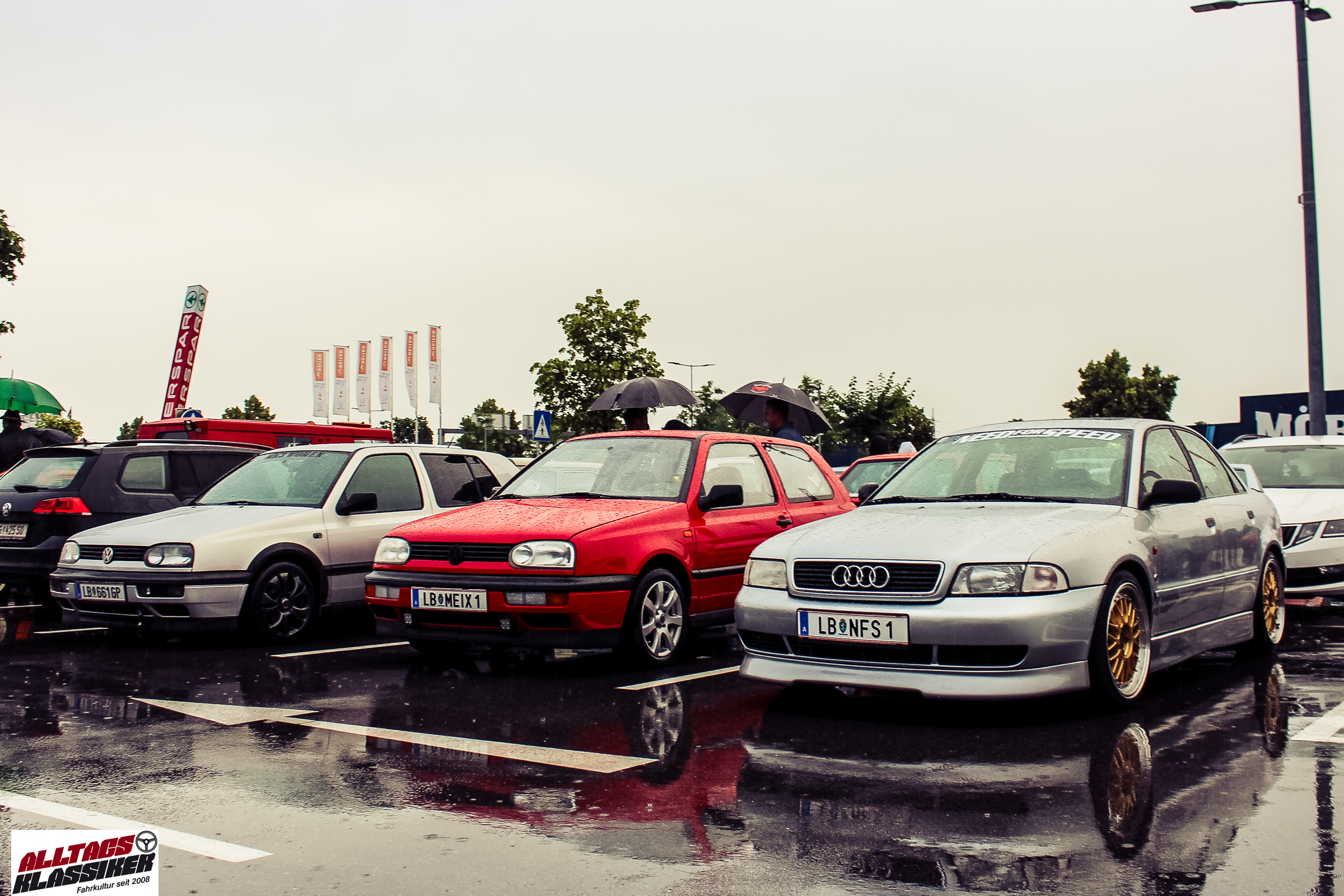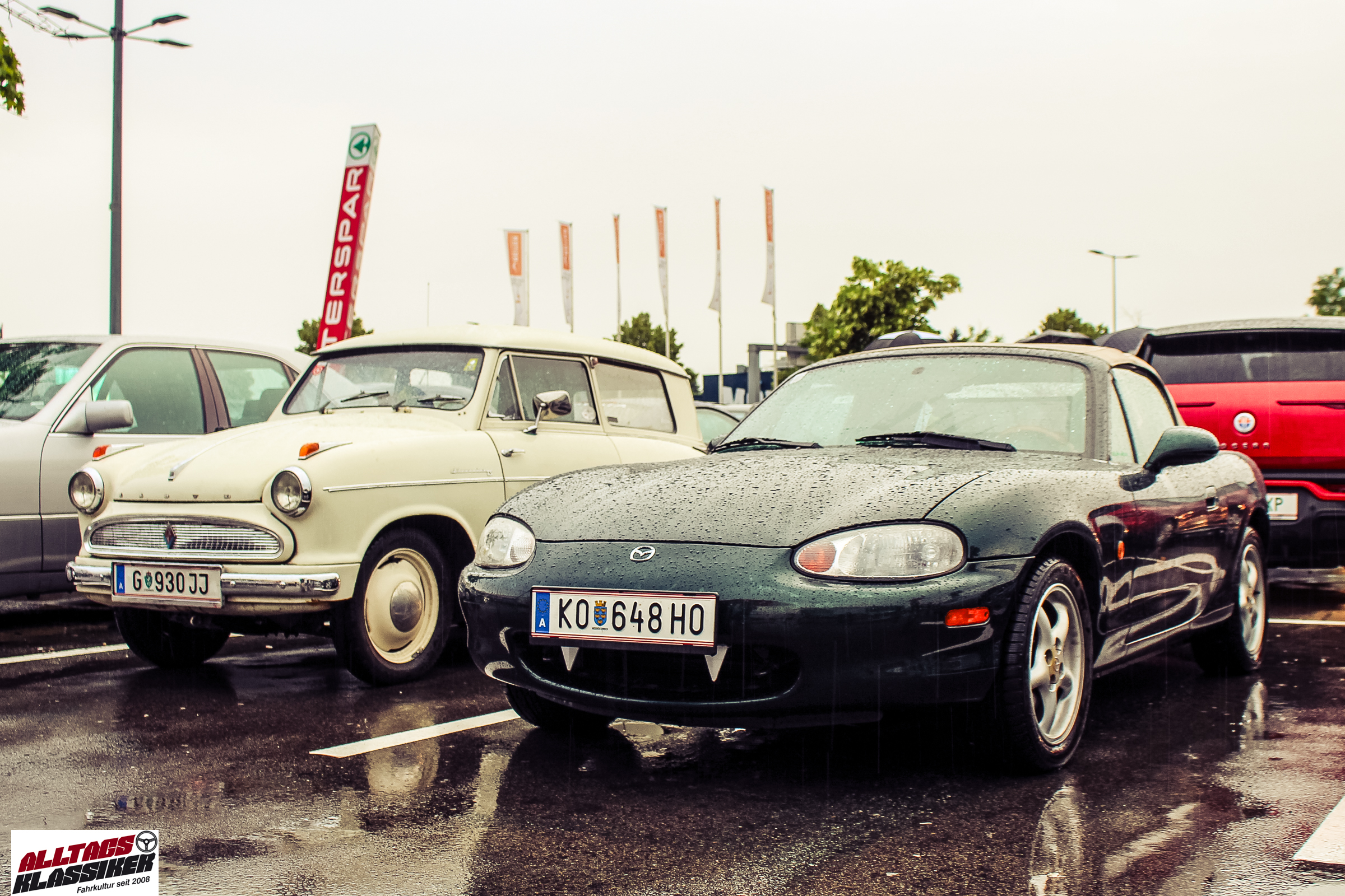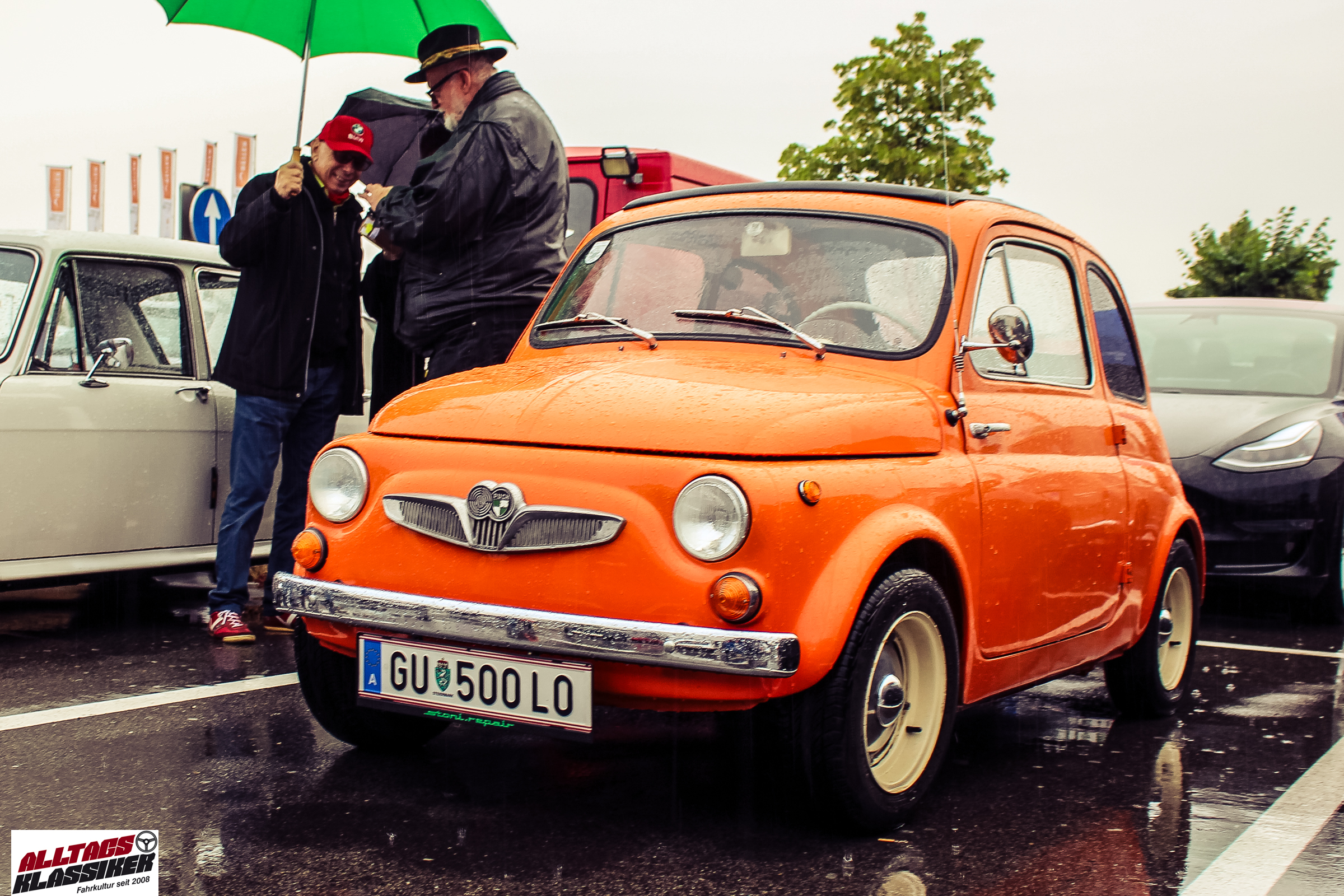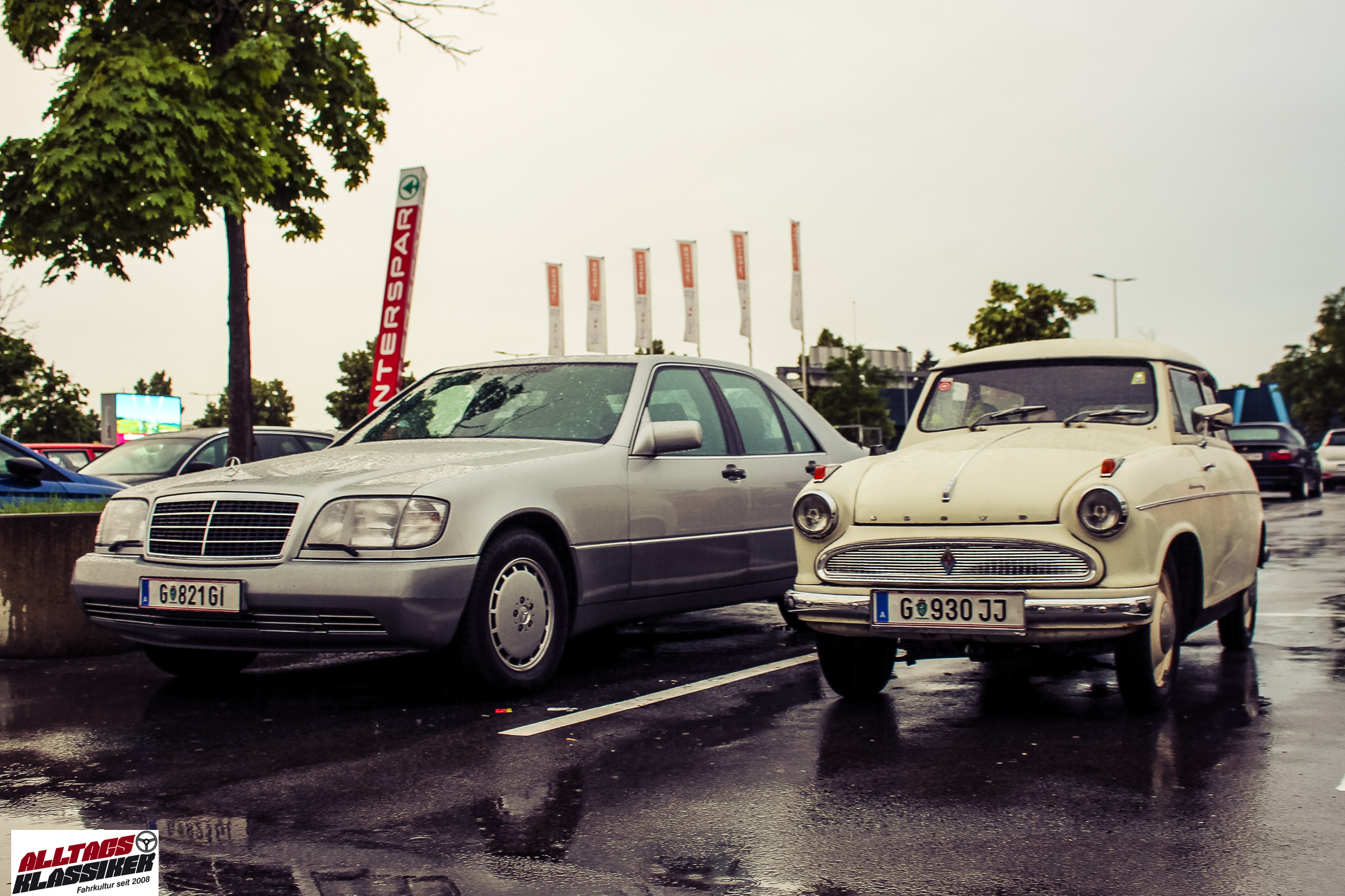 Aber gestandene Piloten von Oldtimern und Youngtimern hält ein wenig feuchte Luft nicht davon ab, am ersten Samstag des Monats nach Graz ins Center West zu cruisen. Regen hin oder her! Mit einer guten Regenjacke, einer Kappe, Regenschirm und wasserdichten Schuhen, konnte man gut stundenlang den Abend trotzdem draußen bei den Oldies verbringen.