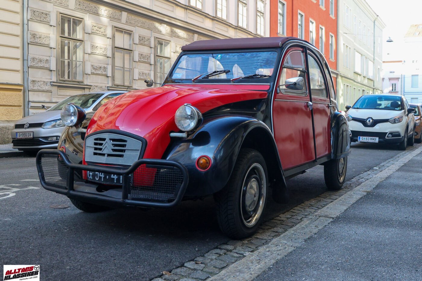 Zweimal rechts abgebogen ist einer der automobilen Leuchttürme dieses Viertels gottlob auch dieses Mal wieder anzutreffen: der schwarz-rote Citroën 2CV, aka die Ente. Hier verziert mit altem Grazer Schwarzblech, das durch massive Schutzbügel gesichert ist. Es ist immer wieder eine Wohltat, diesen Klassiker hier anzutreffen – er gehört einfach zum Viertel wie die namensgebende Kirche.