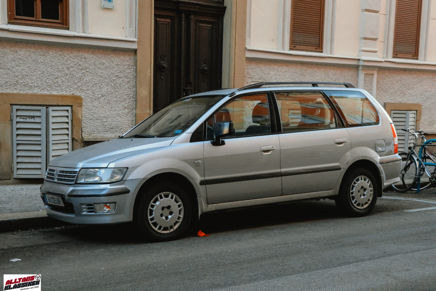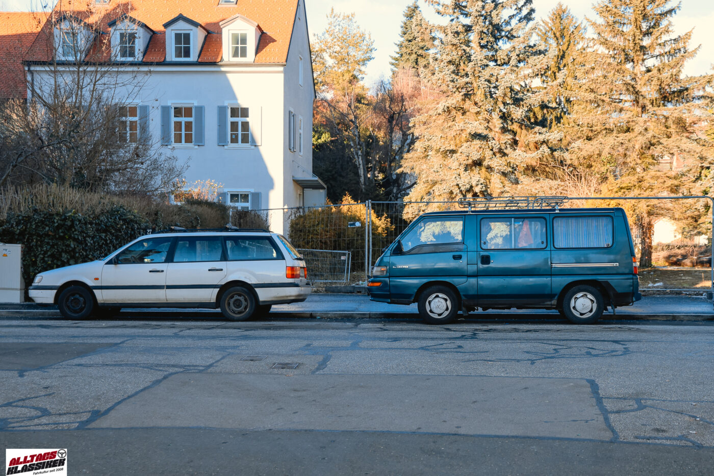Diese Entscheidung war goldrichtig, denn nicht nur ein grüner Kleinbus japanischer Provenienz präsentiert sich mittig auf der Querstraße, direkt davor parkt ein ebenfalls reifer Kombi aus Wolfsburg. Ein Mitsubishi L300 GLX 2.5D ist kein Fahrzeug, das man noch alltäglich auf unseren Straßen antrifft. Diesem Exemplar sieht man an, dass es reichlich benutzt wurde, wofür es gebaut wurde. Es wurde gefahren. Dellen und allerlei Macken zeugen von einem bewegten Autoleben. Die schwarz lackierten Todesstreifen zeugen von Kariesbefall, der zeitwertgerecht repariert wurde und wohl schon mehr als einmal über die nächste Pickerlüberprüfung geholfen hat.