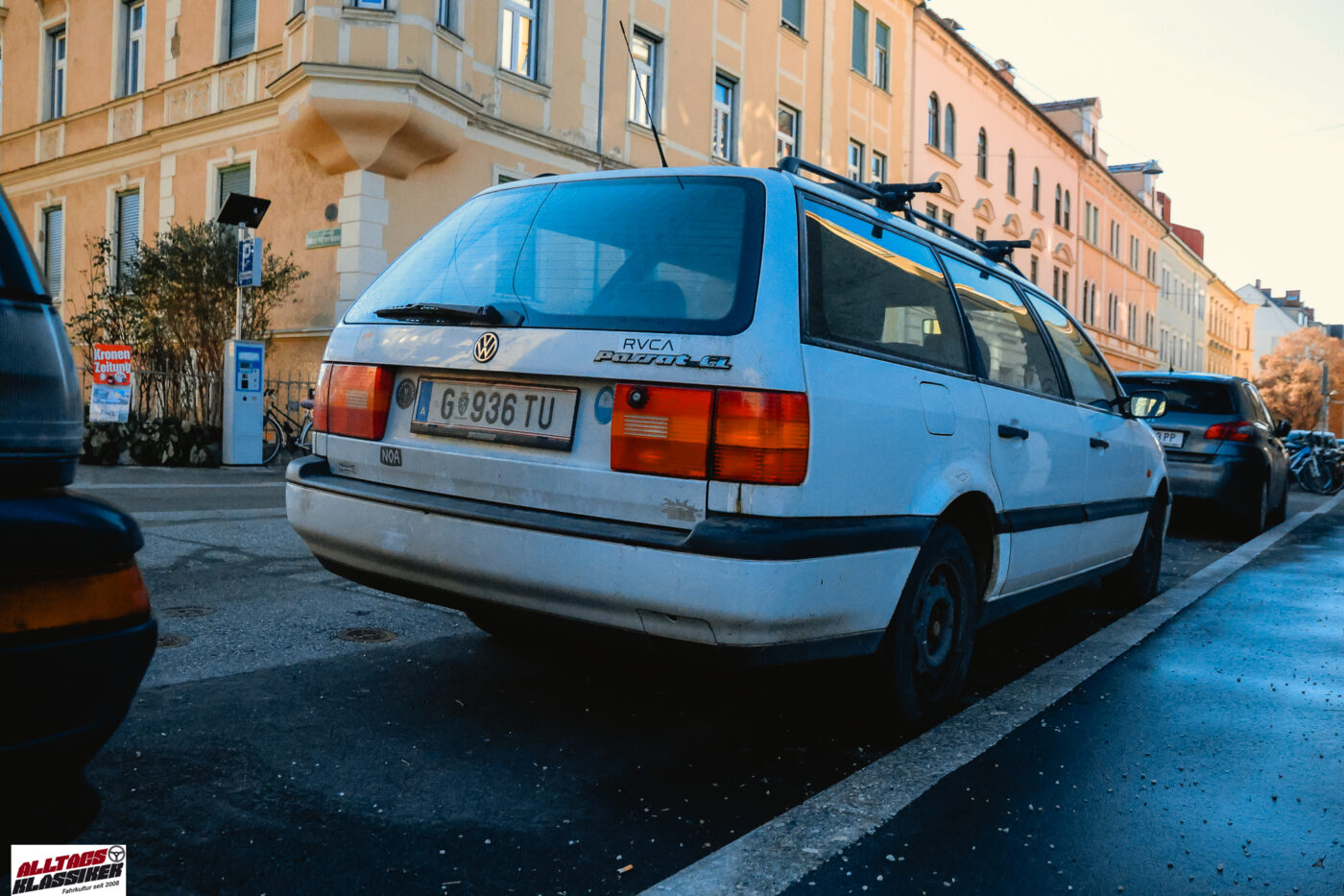 Klar, er hat auch schon bessere Zeiten gesehen, der VW Passat Variant der Baureihe B4. Auch er wird benutzt und legt keinen Wert mehr auf Schönheitswettbewerbe. Günstig von A nach B, dazu viel Nutzwert als Kombi, was auch der Dachträger bestätigt.