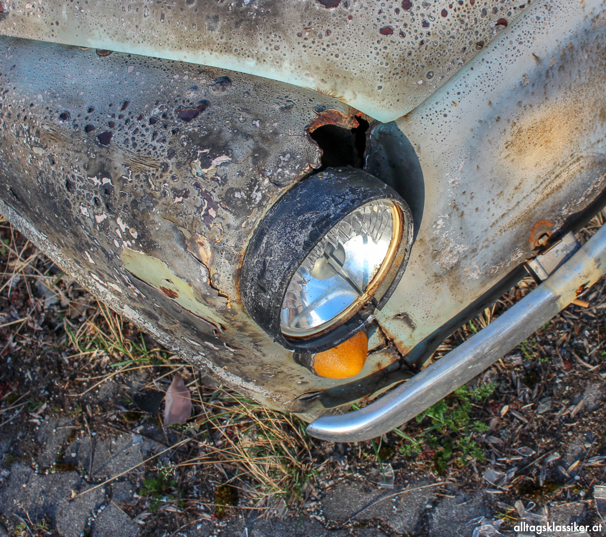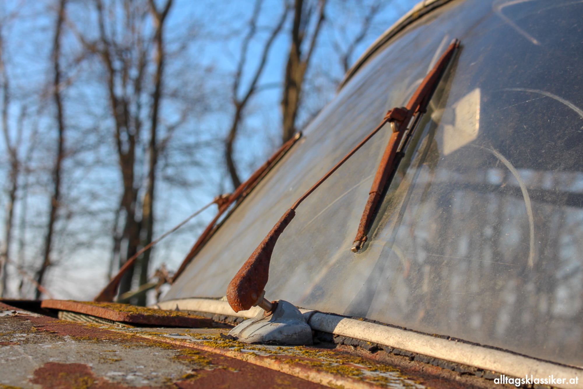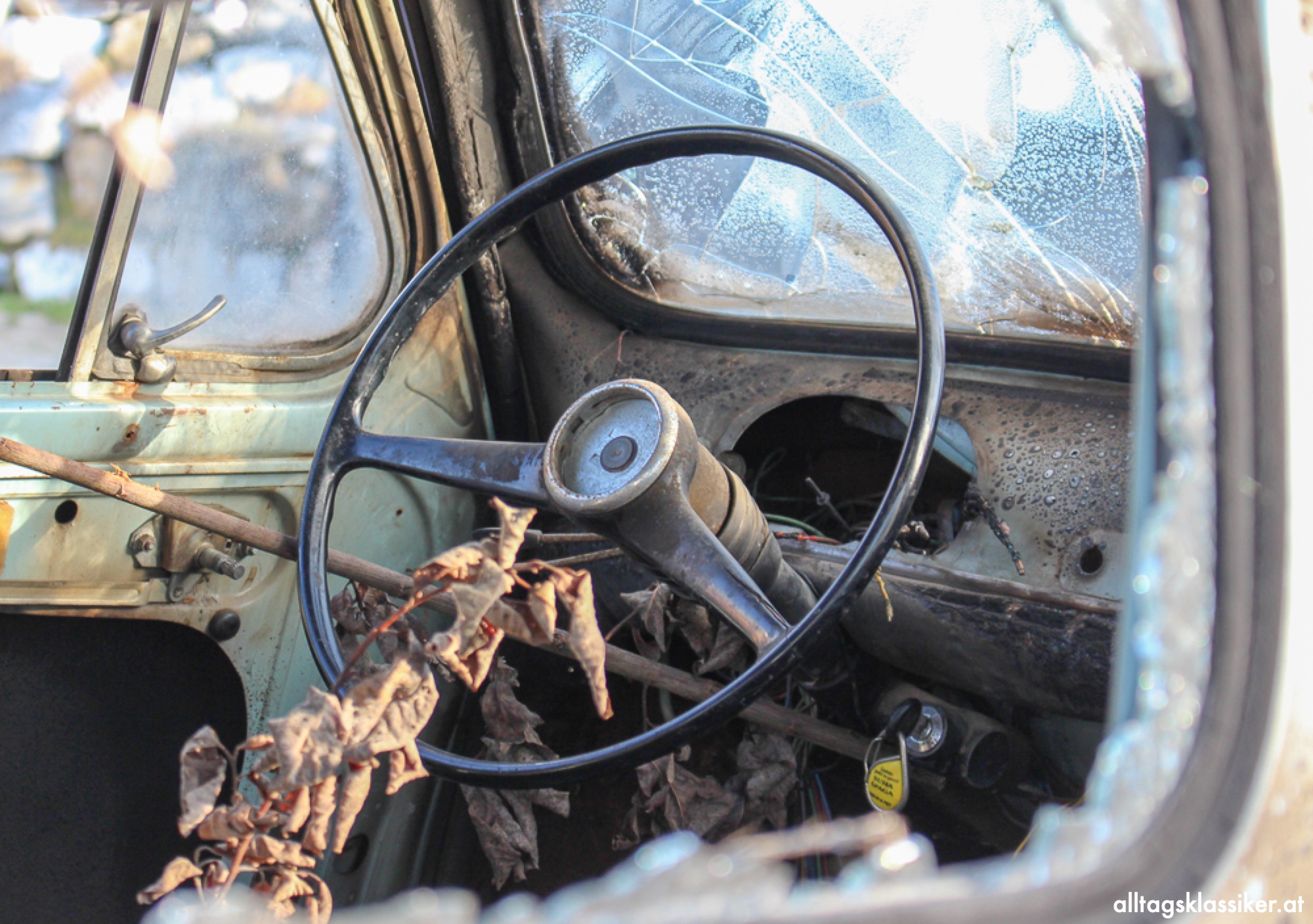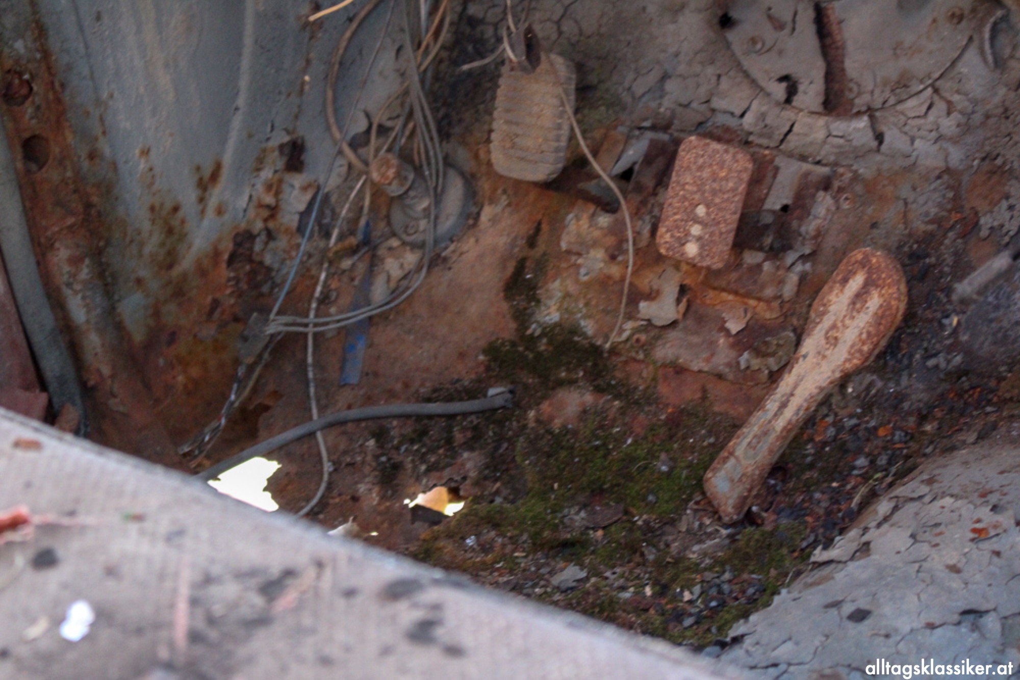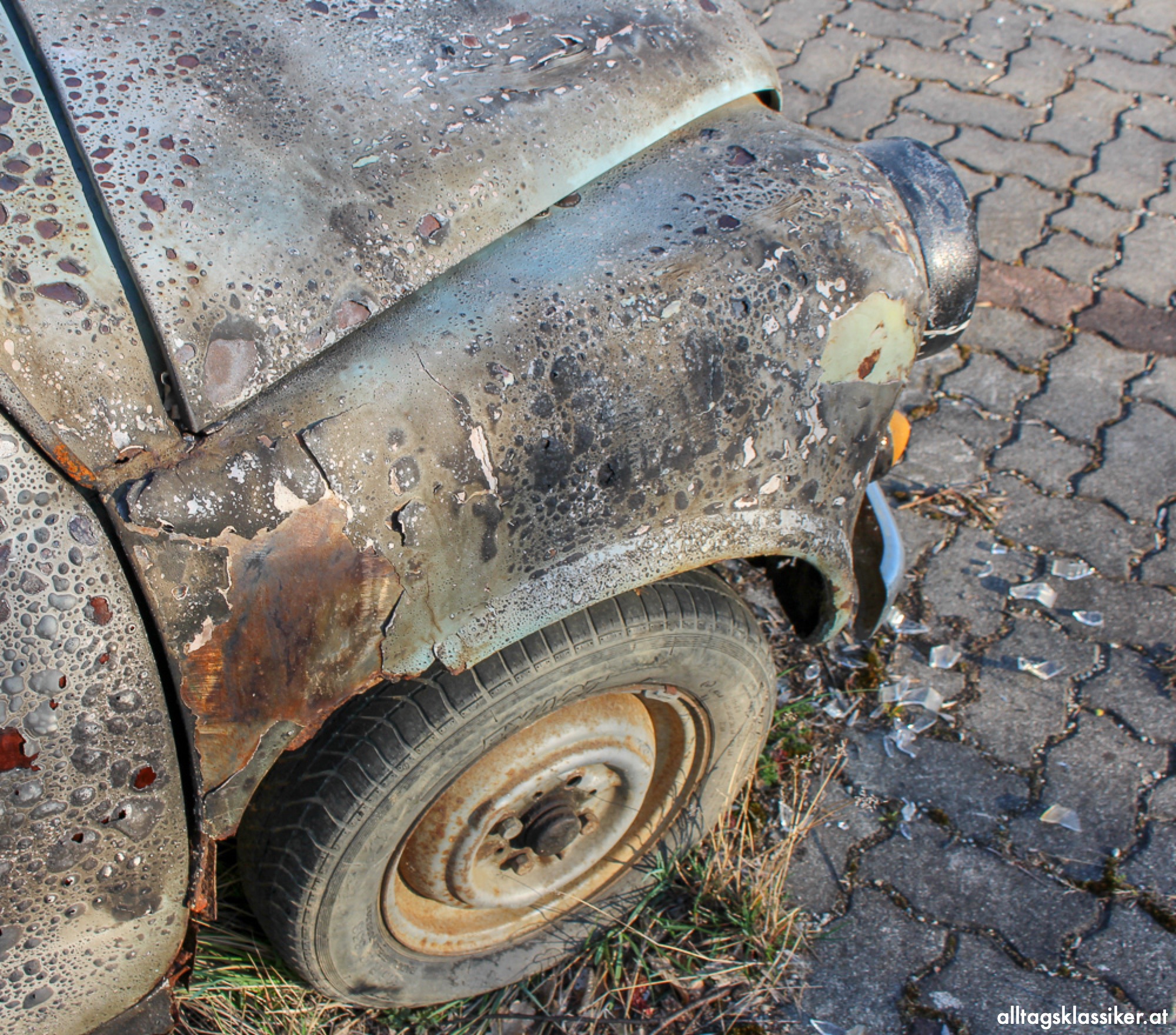 Dieses Exemplar hat wohl eine unfreiwillige nachträgliche Feuerverzinkung erfahren, wie man am Blasen werfenden Lackkleid ablesen kann. Die Scheiben sind teilweise geborsten, entweder durch die Hitzeentwicklung oder Vandalen. Der Rost nagt an der einen oder anderen Ecke, der Kitt splittert durch die Hitzeeinwirkung großflächig ab. Das Interieur ist ausgeräumt, außer dem Lenkrad und dem Schlüssel ist nichts mehr von der kargen Innenausstattung vorhanden.