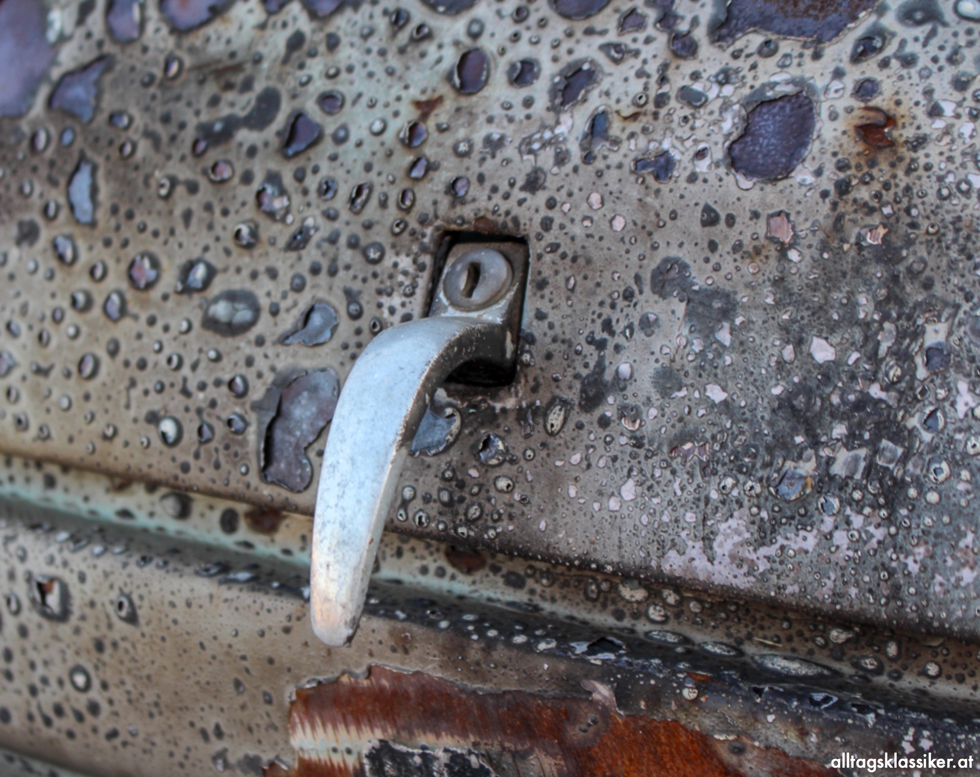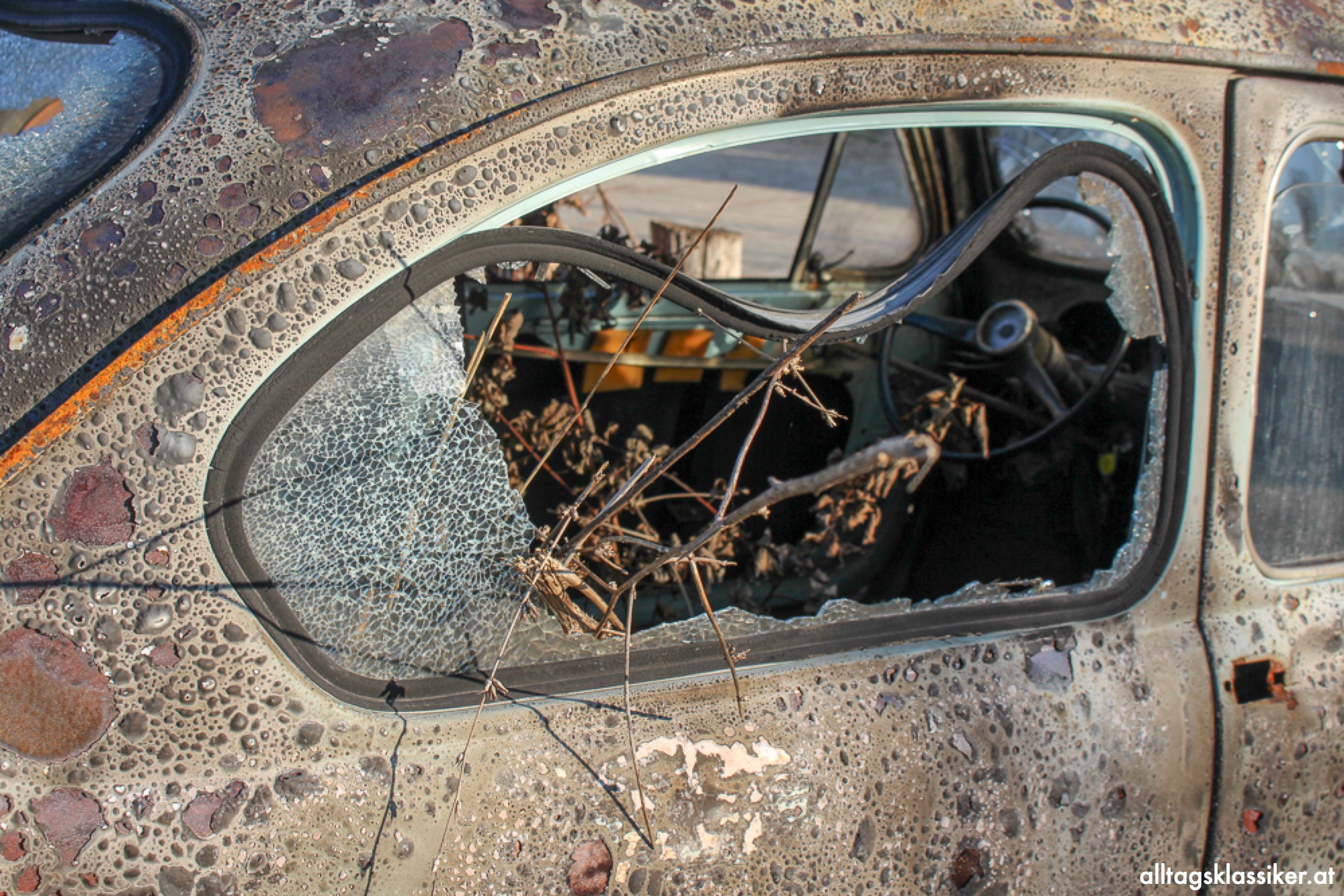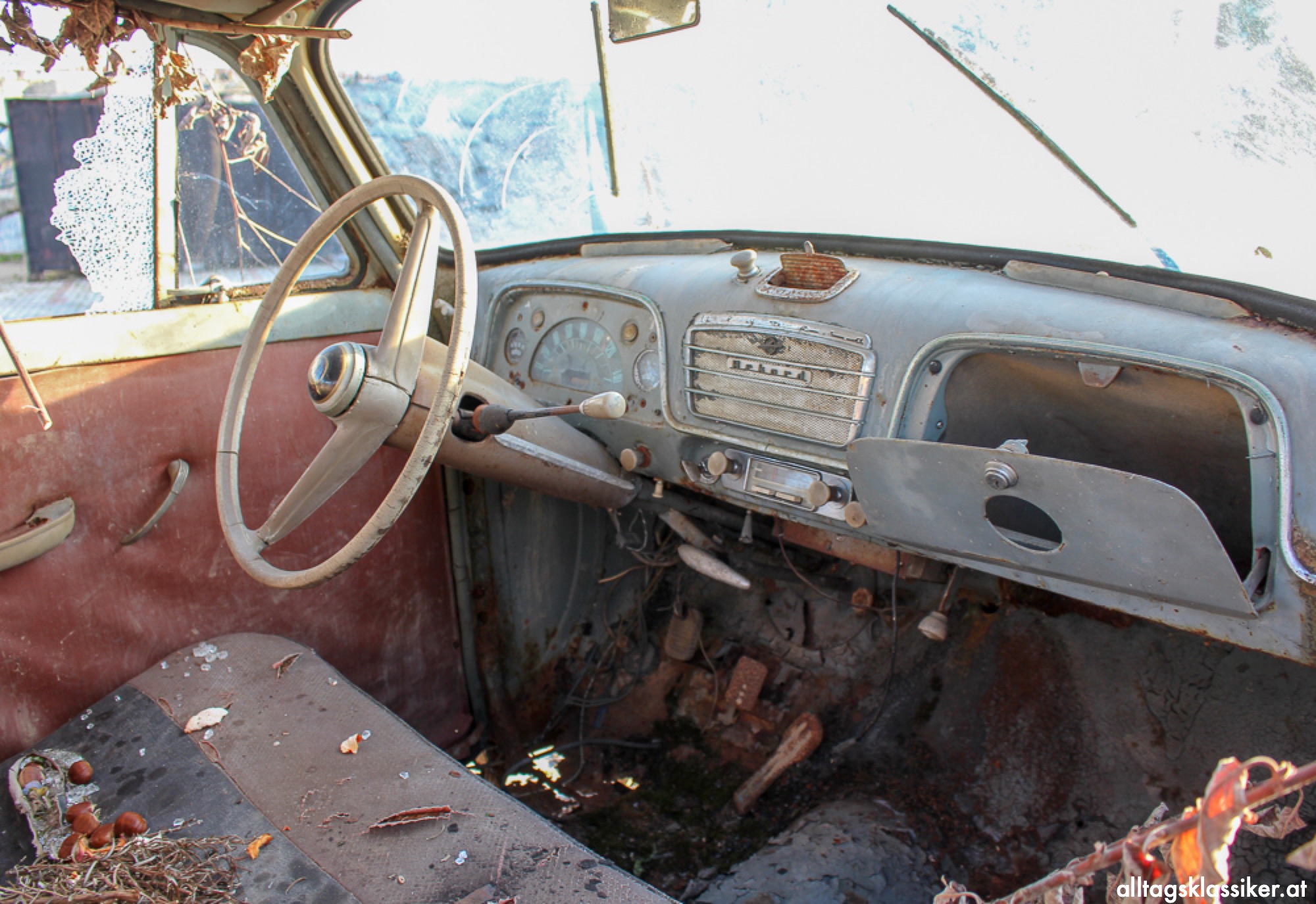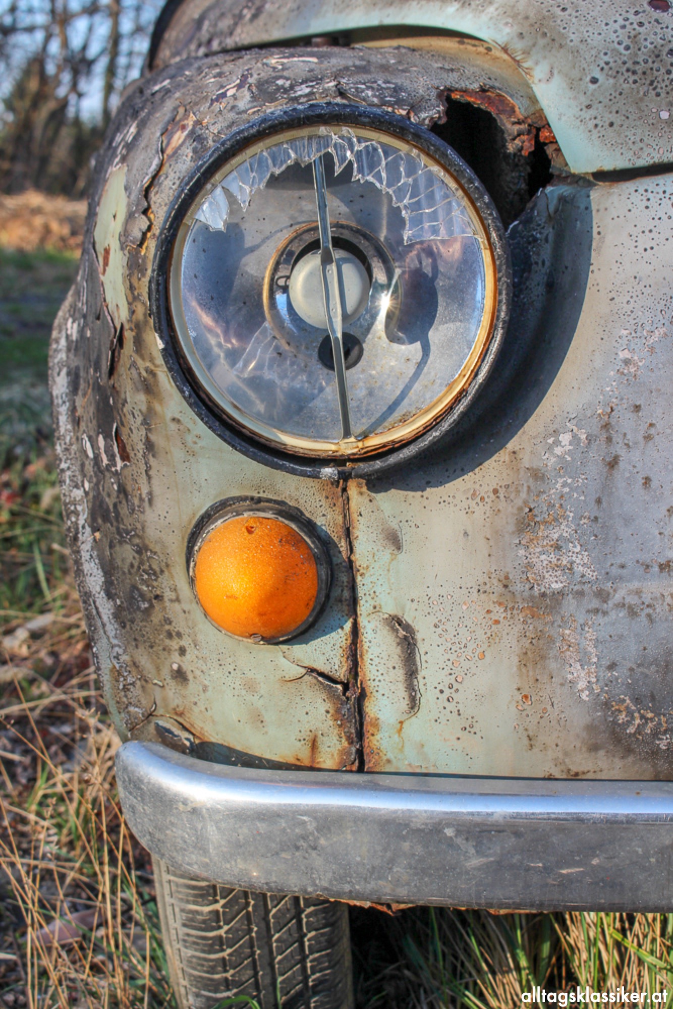 Dieses Exemplar hat wohl eine unfreiwillige nachträgliche Feuerverzinkung erfahren, wie man am Blasen werfenden Lackkleid ablesen kann. Die Scheiben sind teilweise geborsten, entweder durch die Hitzeentwicklung oder Vandalen. Der Rost nagt an der einen oder anderen Ecke, der Kitt splittert durch die Hitzeeinwirkung großflächig ab. Das Interieur ist ausgeräumt, außer dem Lenkrad und dem Schlüssel ist nichts mehr von der kargen Innenausstattung vorhanden.
