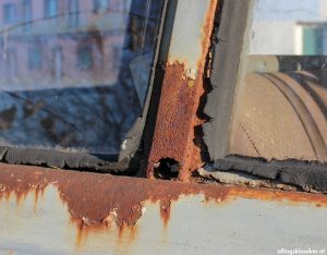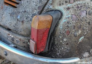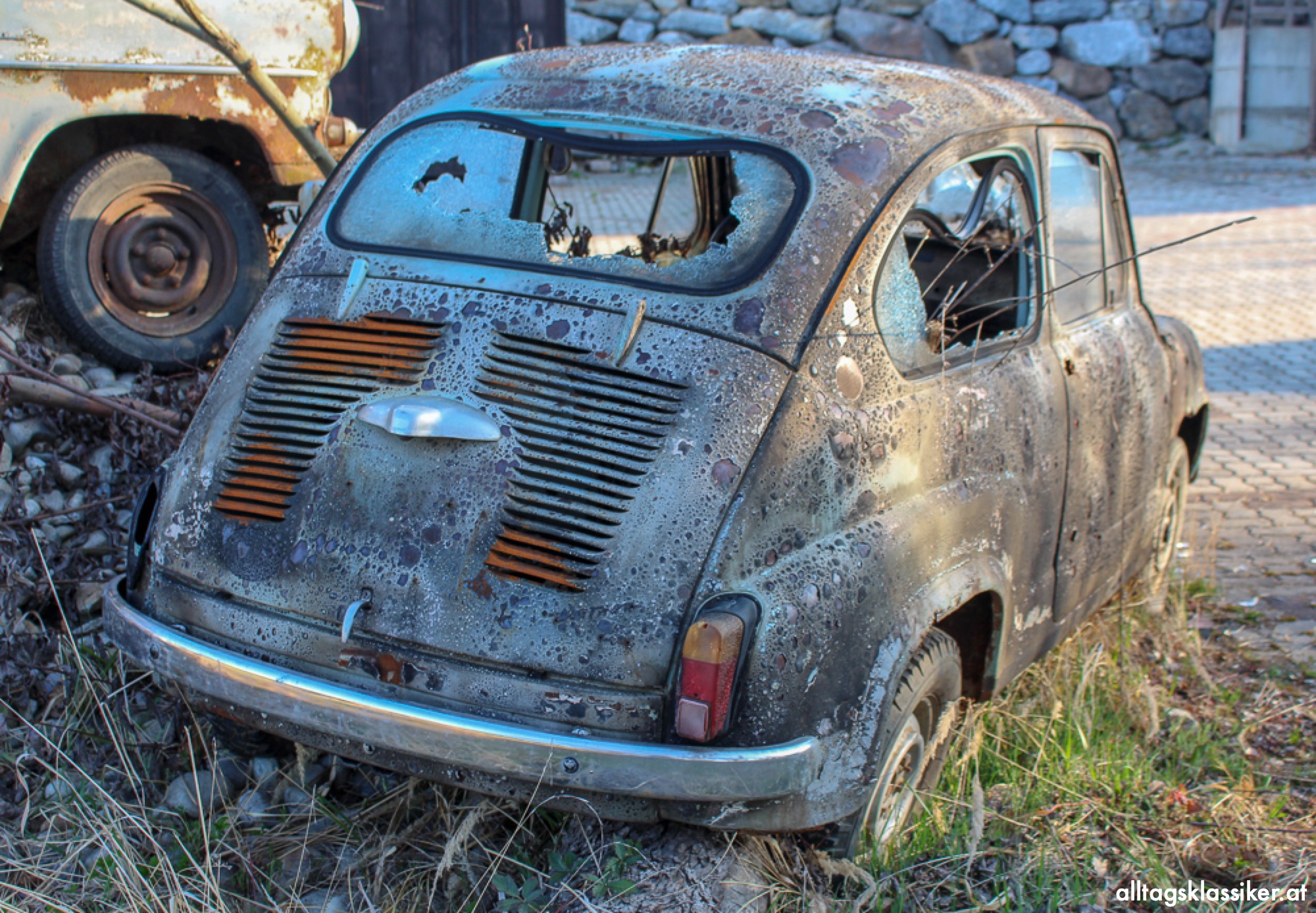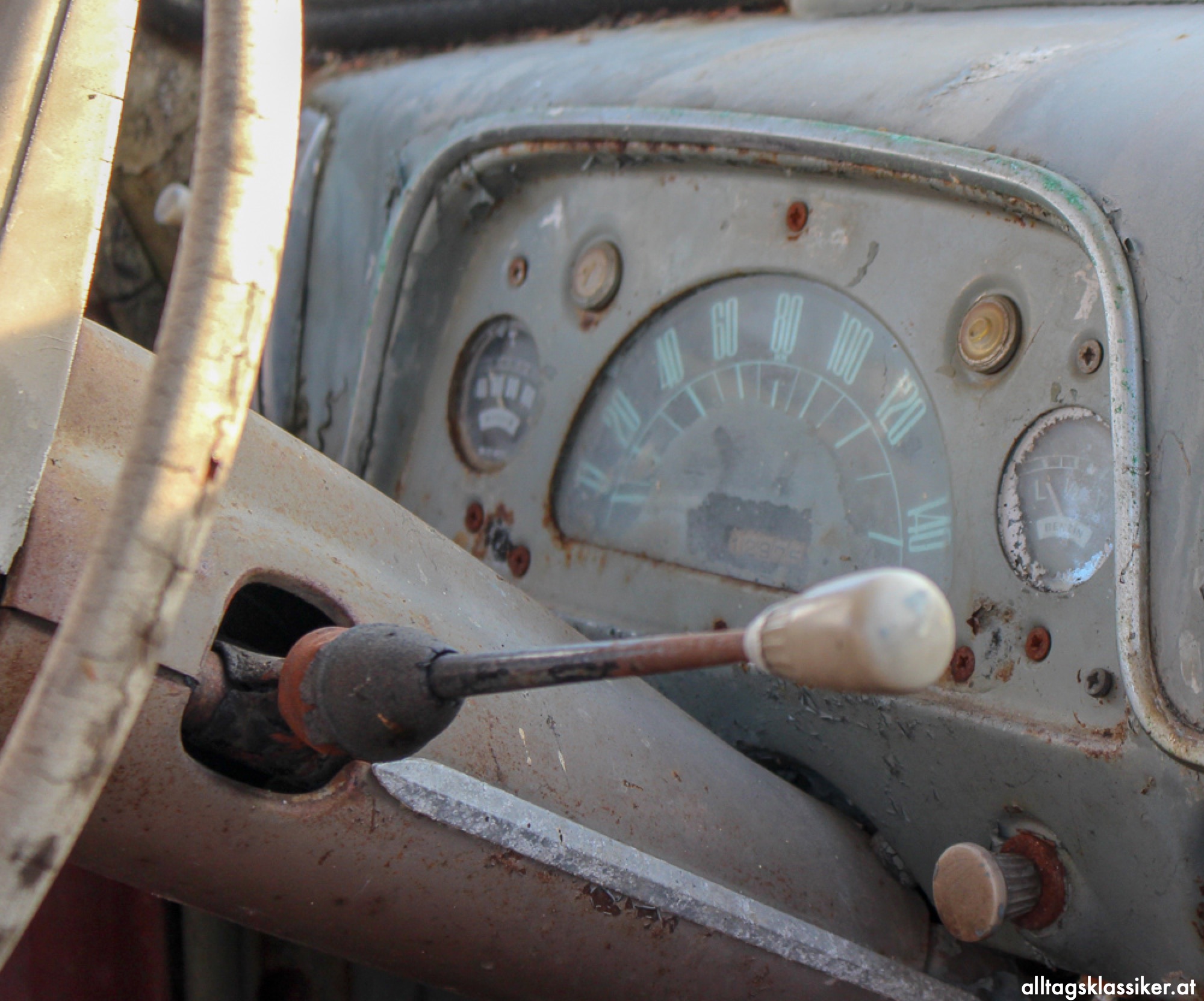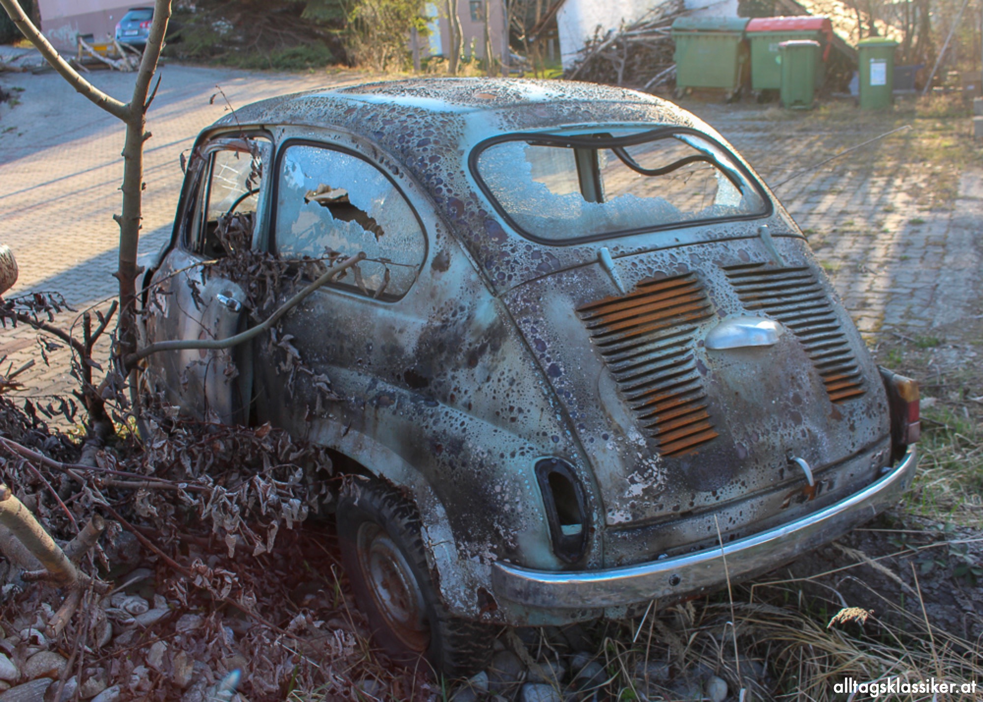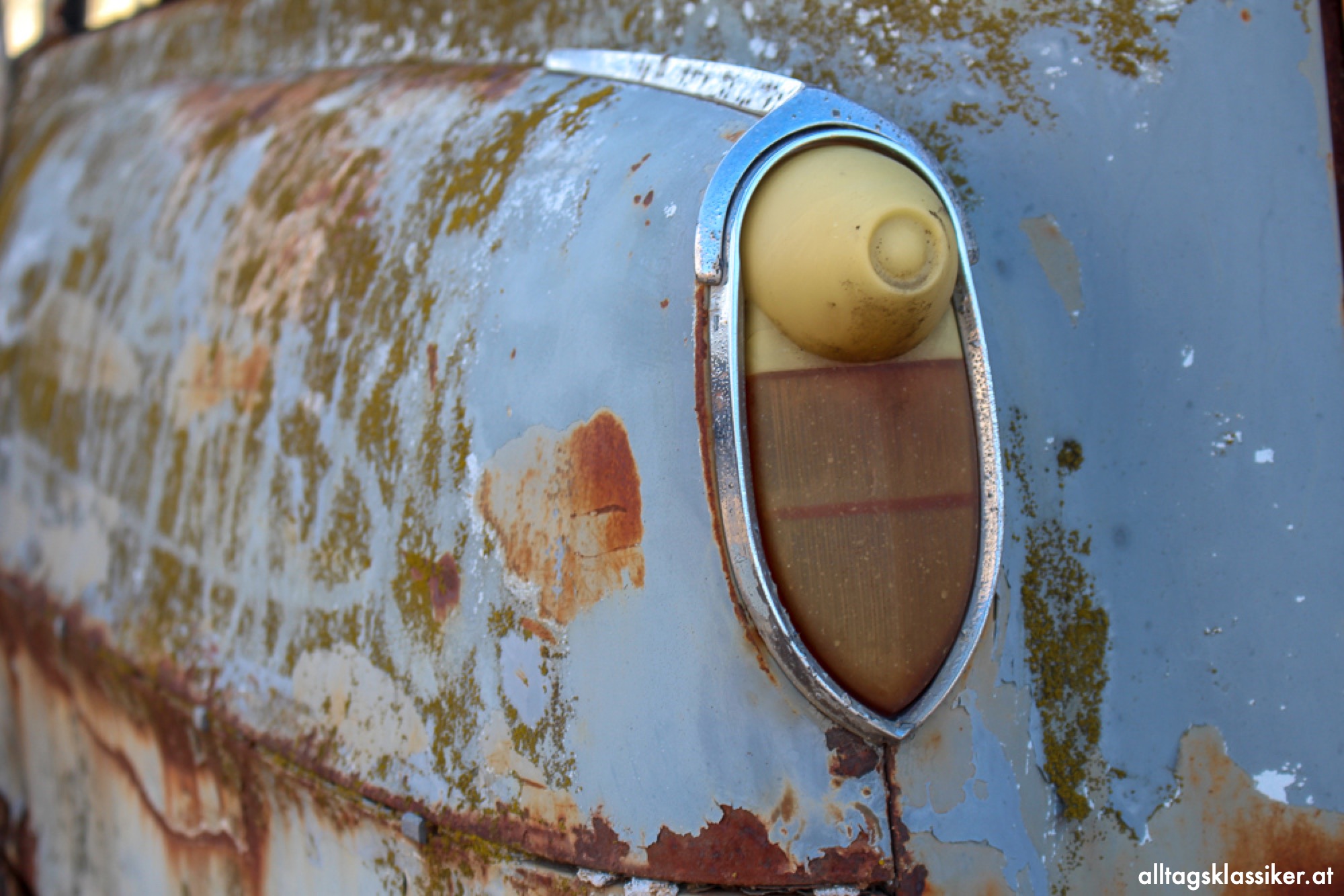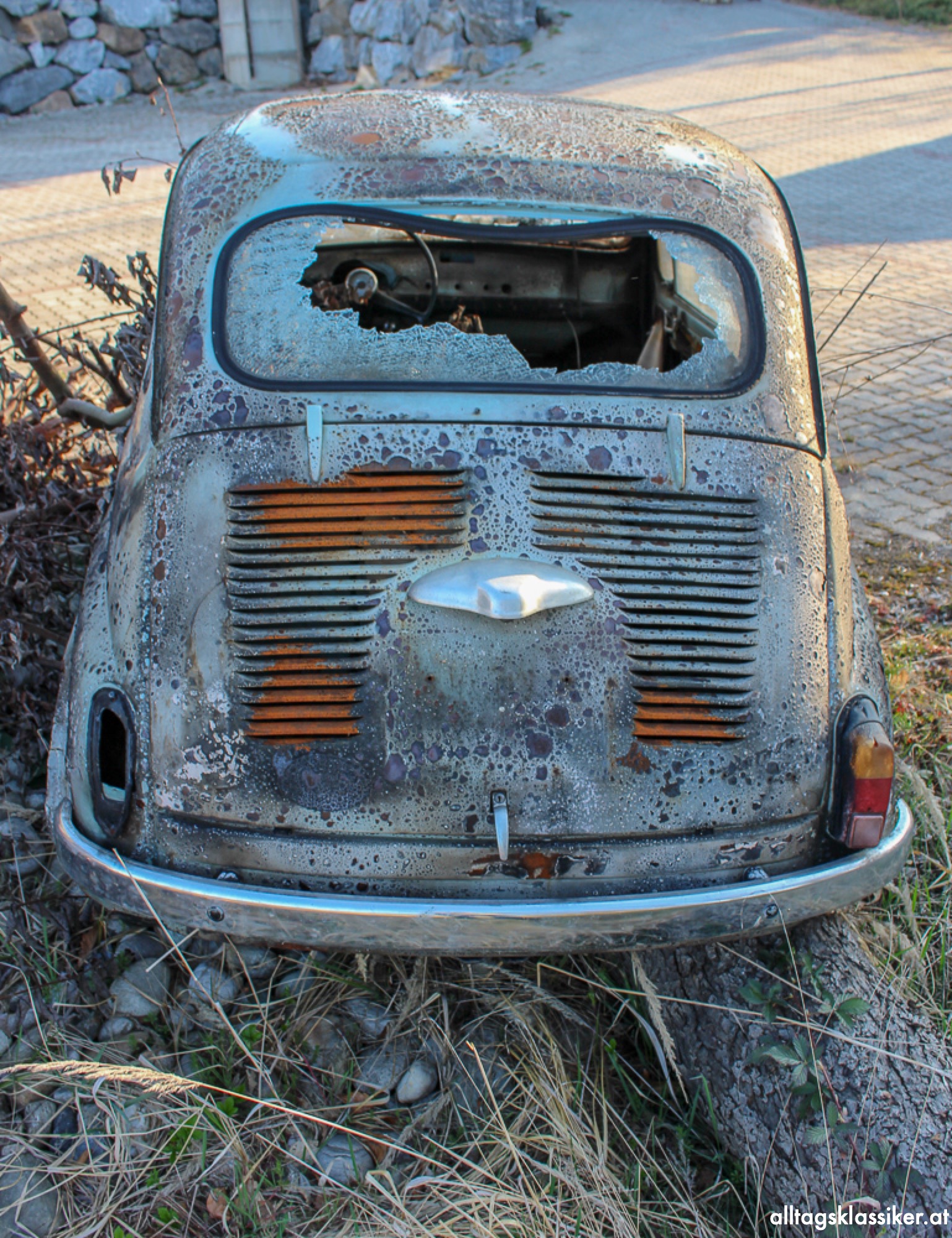 Dieses Exemplar hat wohl eine unfreiwillige nachträgliche Feuerverzinkung erfahren, wie man am Blasen werfenden Lackkleid ablesen kann. Die Scheiben sind teilweise geborsten, entweder durch die Hitzeentwicklung oder Vandalen. Der Rost nagt an der einen oder anderen Ecke, der Kitt splittert durch die Hitzeeinwirkung großflächig ab. Das Interieur ist ausgeräumt, außer dem Lenkrad und dem Schlüssel ist nichts mehr von der kargen Innenausstattung vorhanden.
