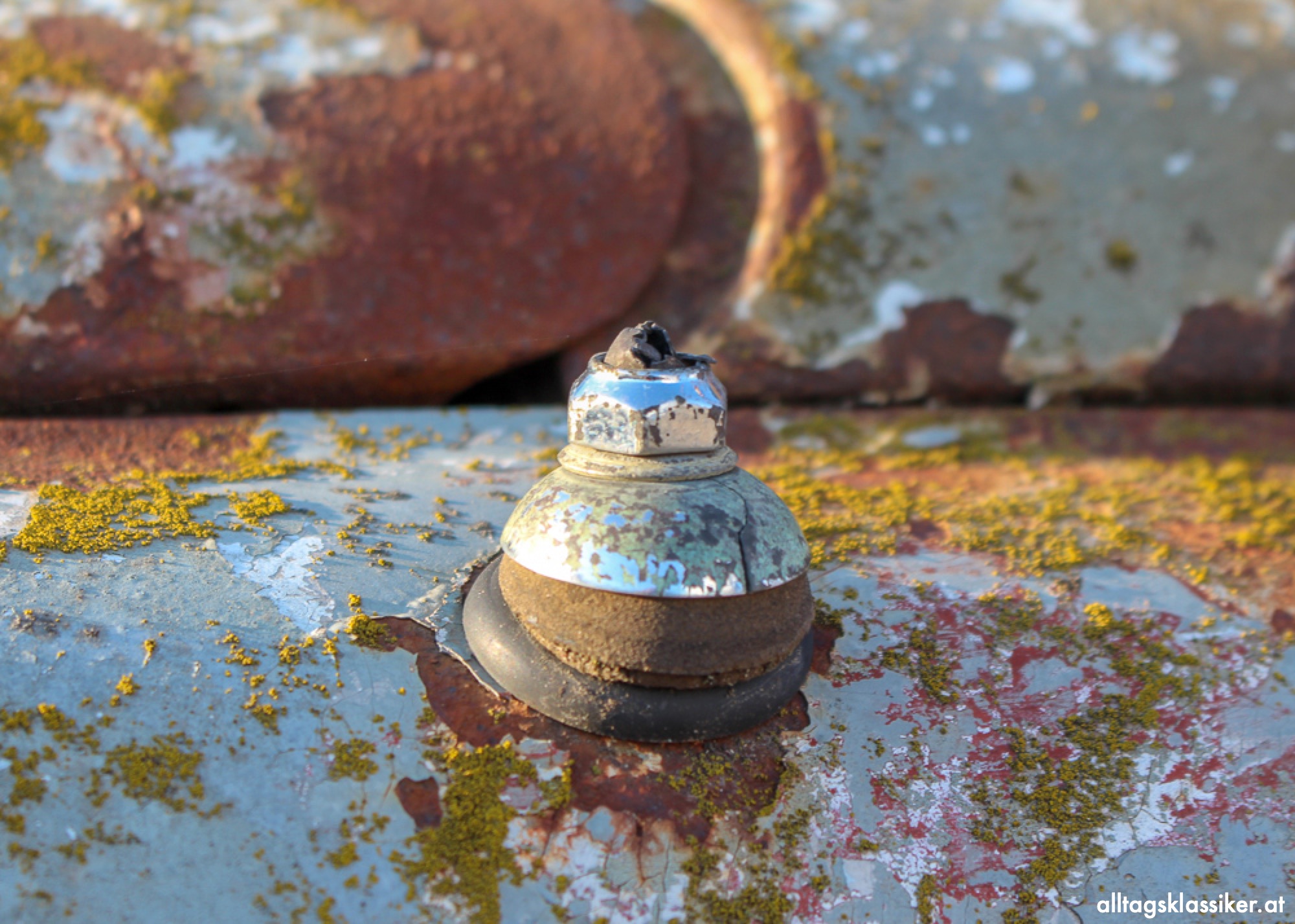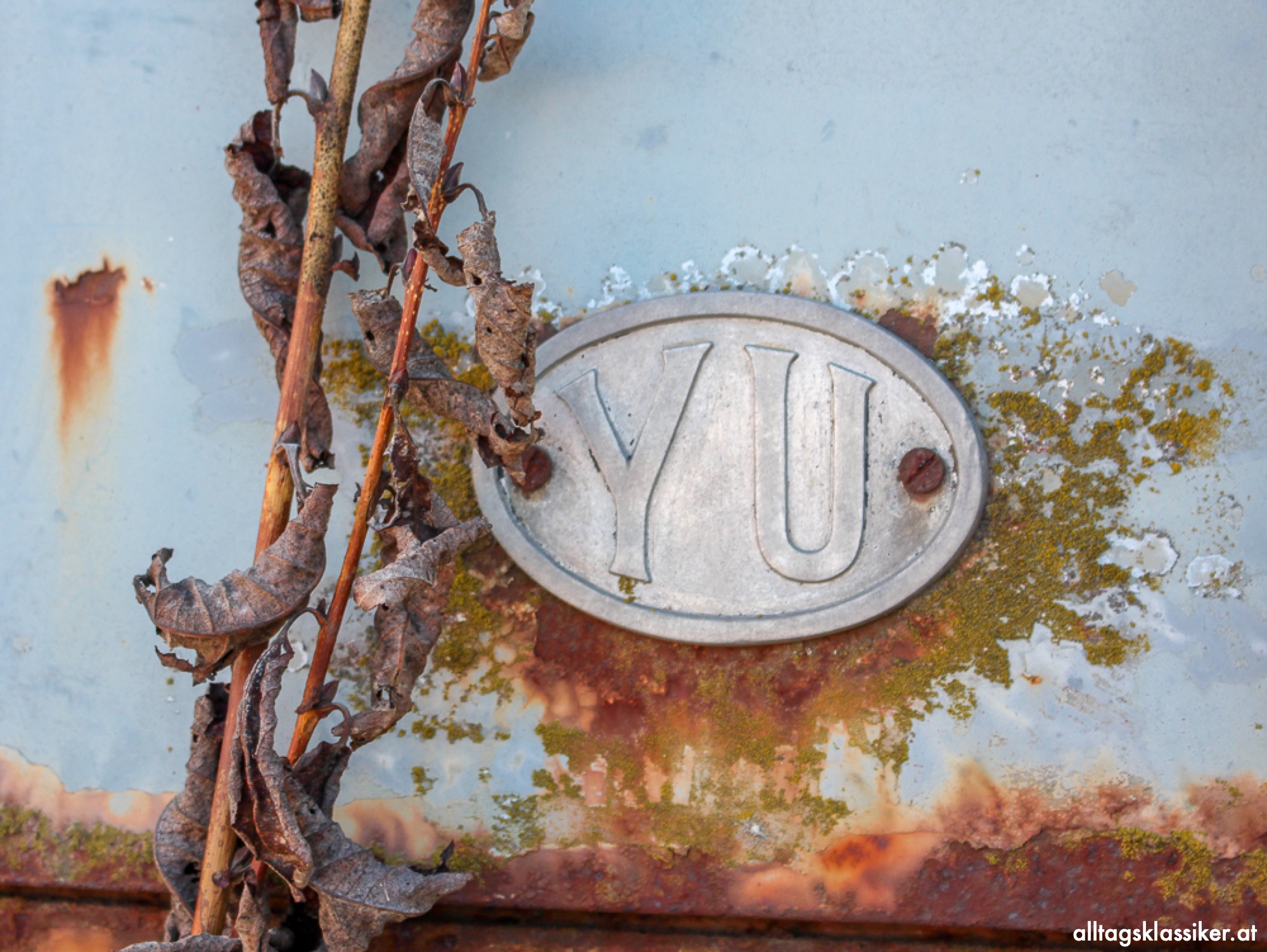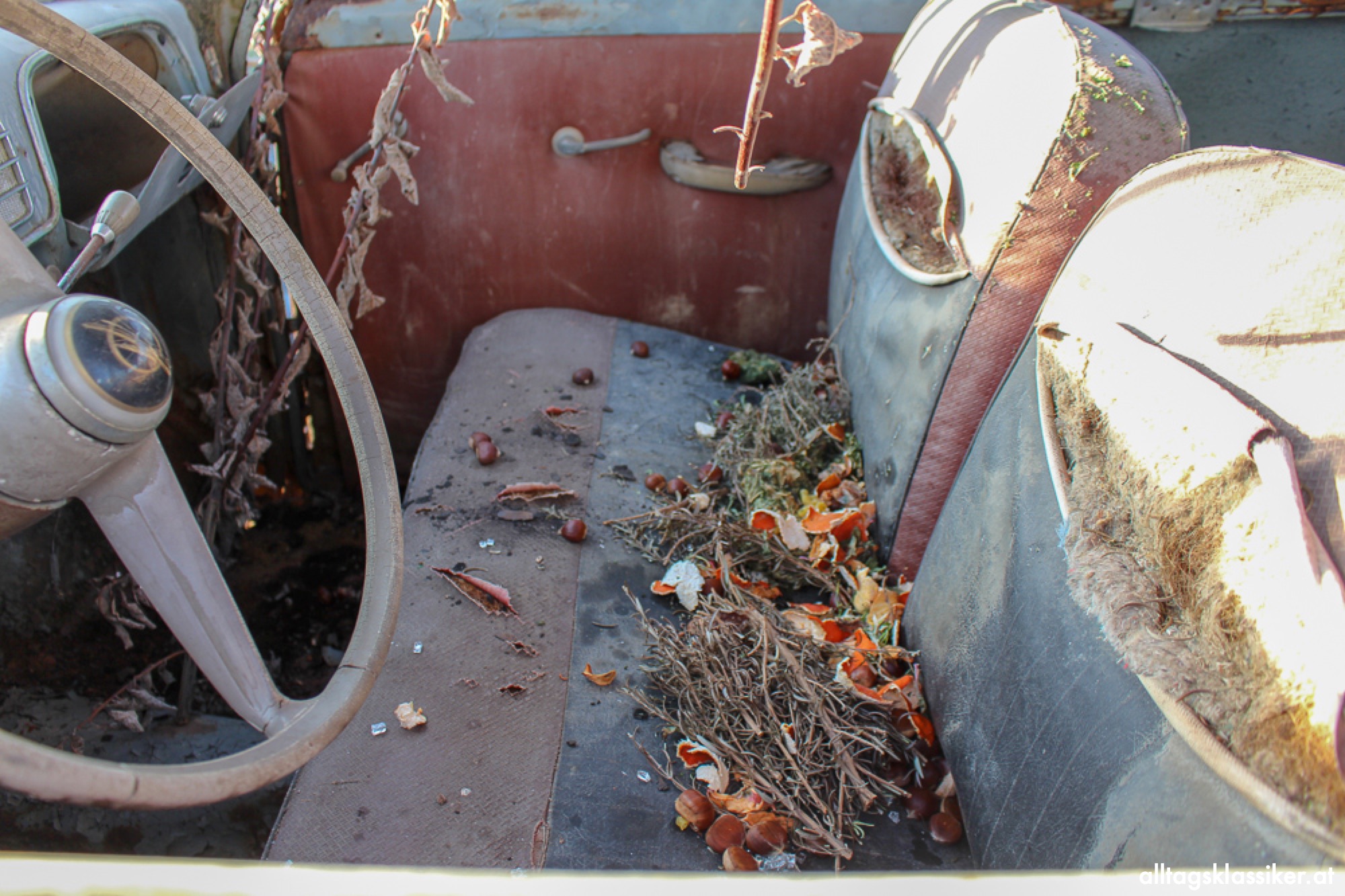 Ein Design, das nach dem Vorbild des amerikanischen Mutterkonzerns GM jährlich modifiziert wurde. Der 55er bekam ein Luftleitblech in den Kühlergrill und entschärfte somit das aggressiv wirkende Haifischmaul. Dem in Blech ausgeführten Länderkennzeichen nach (YU), lief auch dieser Wagen im ehemaligen Jugoslawien. Der Opel ist vollständiger erhalten als der Fico, vor allem innen gibt es da deutlich mehr patinierte Details zu erkunden. Auch für eine ausreichende Luftzufuhr ist durch das eingeschlagene Fenster, die aus den Angeln hängende Türe, aber auch durch die Durchrostungen im Bodenblech, gesorgt. Dort wo sich kein Rost findet, hat sich Moos breit gemacht, das eine schließt das andere aber nicht aus – Platz ist genügend für beides vorhanden.