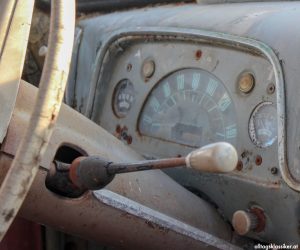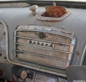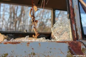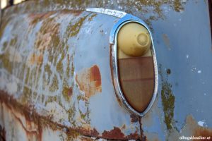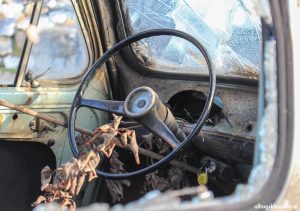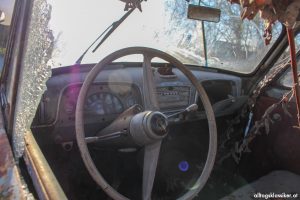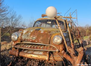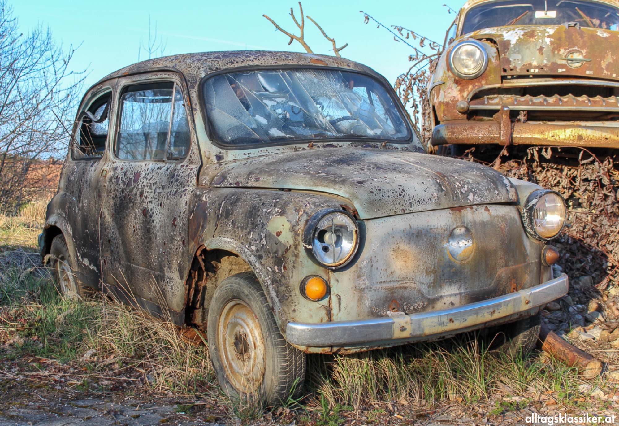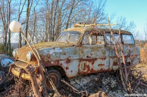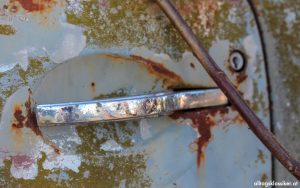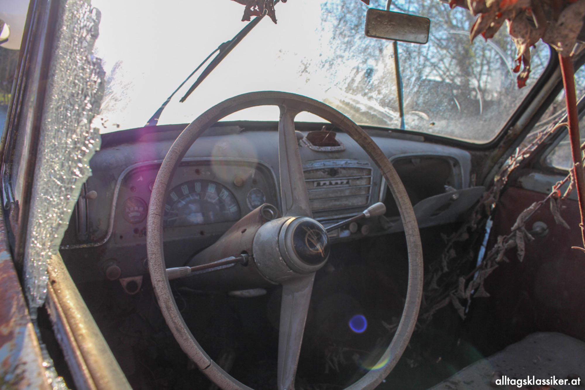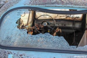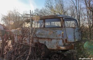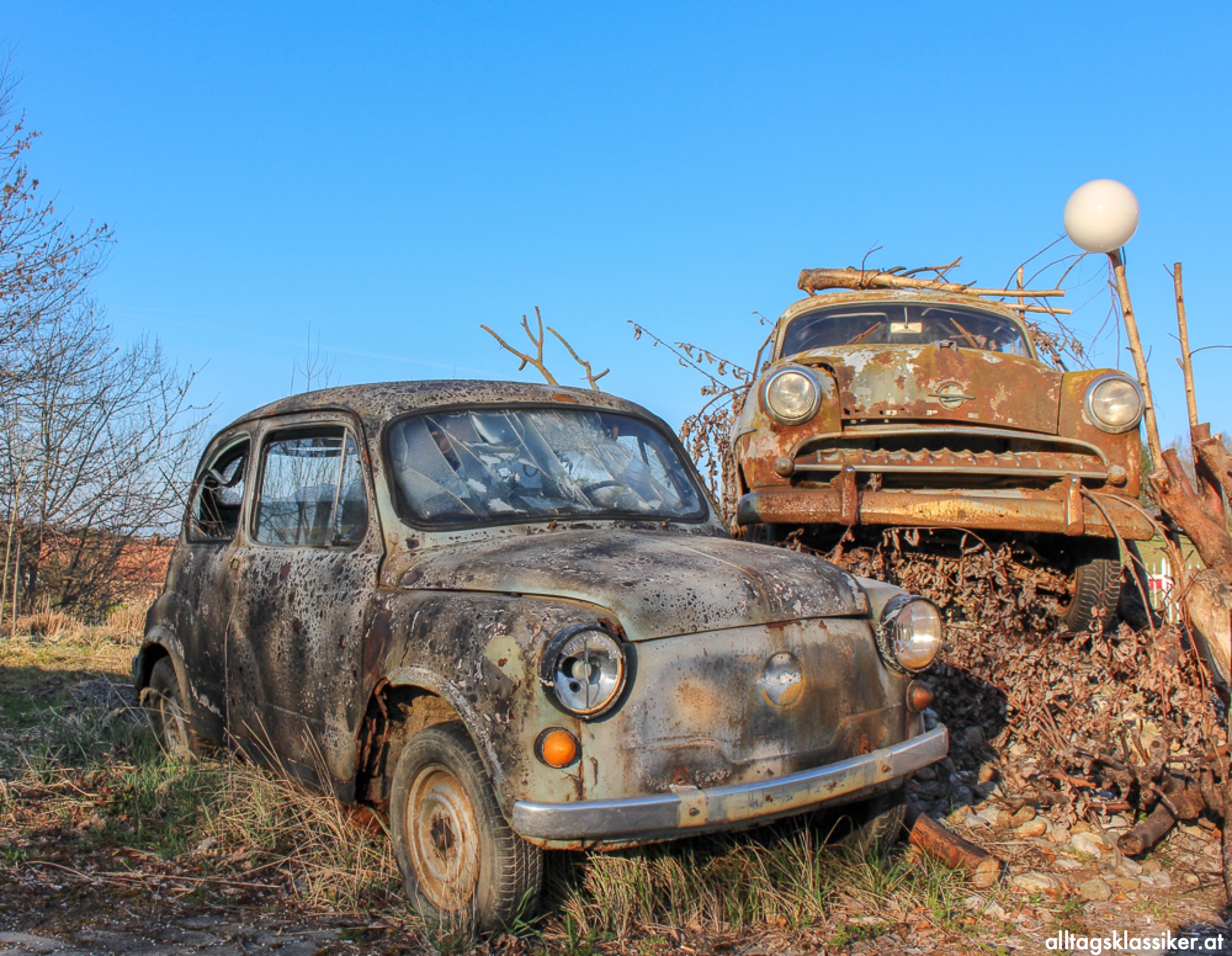 Ein Design, das nach dem Vorbild des amerikanischen Mutterkonzerns GM jährlich modifiziert wurde. Der 55er bekam ein Luftleitblech in den Kühlergrill und entschärfte somit das aggressiv wirkende Haifischmaul. Dem in Blech ausgeführten Länderkennzeichen nach (YU), lief auch dieser Wagen im ehemaligen Jugoslawien. Der Opel ist vollständiger erhalten als der Fico, vor allem innen gibt es da deutlich mehr patinierte Details zu erkunden. Auch für eine ausreichende Luftzufuhr ist durch das eingeschlagene Fenster, die aus den Angeln hängende Türe, aber auch durch die Durchrostungen im Bodenblech, gesorgt. Dort wo sich kein Rost findet, hat sich Moos breit gemacht, das eine schließt das andere aber nicht aus – Platz ist genügend für beides vorhanden.