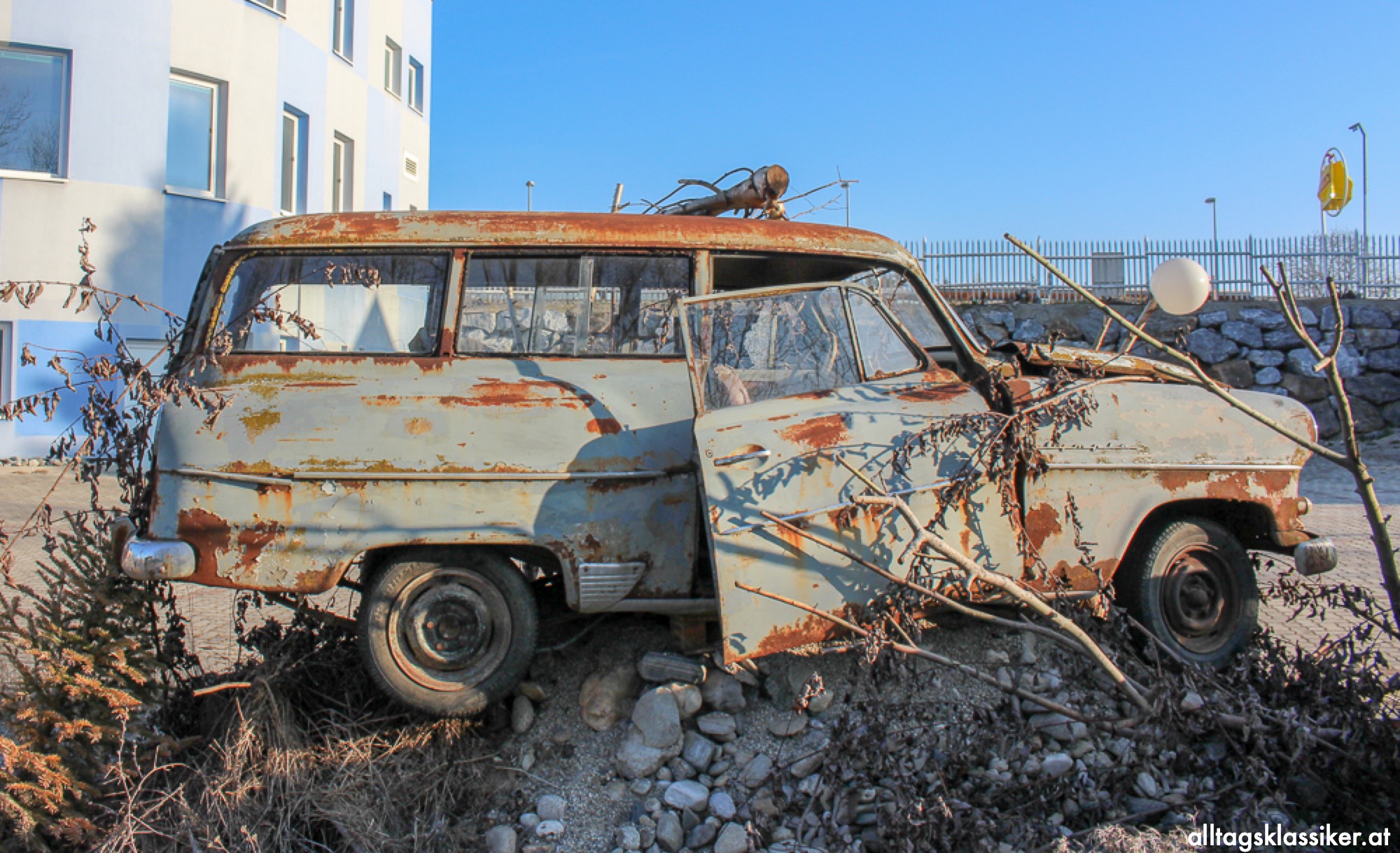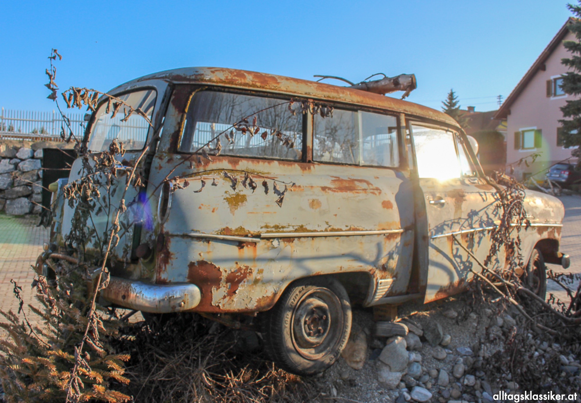 Das zweite Objekt vor der Kamera ist ein Opel Olympia Rekord CarAvan, der auf einem Sockel hoch über dem Zastava thront. Dieser Olympia Rekord ’55 stammt aus dem Modelljahr 1955 und ist somit das erste Facelift des 1953 präsentierten Nachfolgers des Olympia. Typisch für diese Modellgeneration ist seine Pontonkarosserie mit deutlichen amerikanischen Designanklängen.