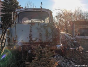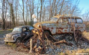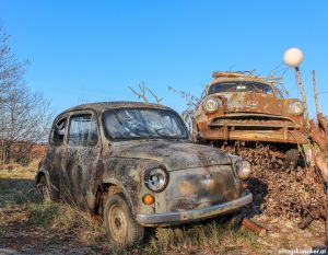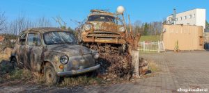 Was leider nicht geklärt werden konnte, ist warum diese beiden Autos mit Migrationsvordergrund gerade in diesem Hinterhof gestrandet sind. Wenn du Lust auf weitere Fahrzeuge hast, die irgendwo vor sich hin gammeln, dann besuche die Rubrik Lost Places.