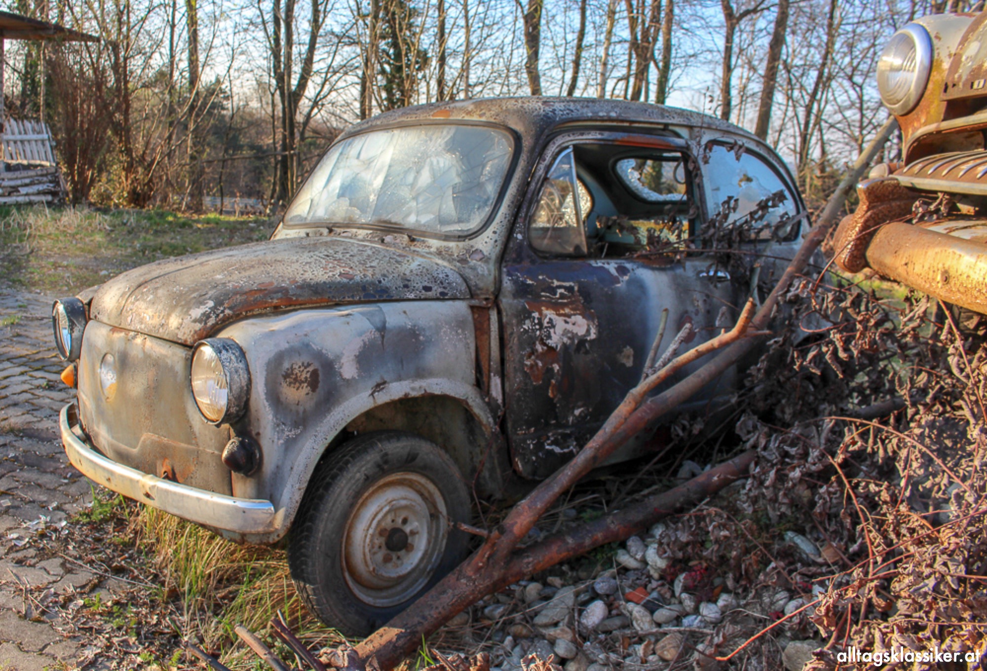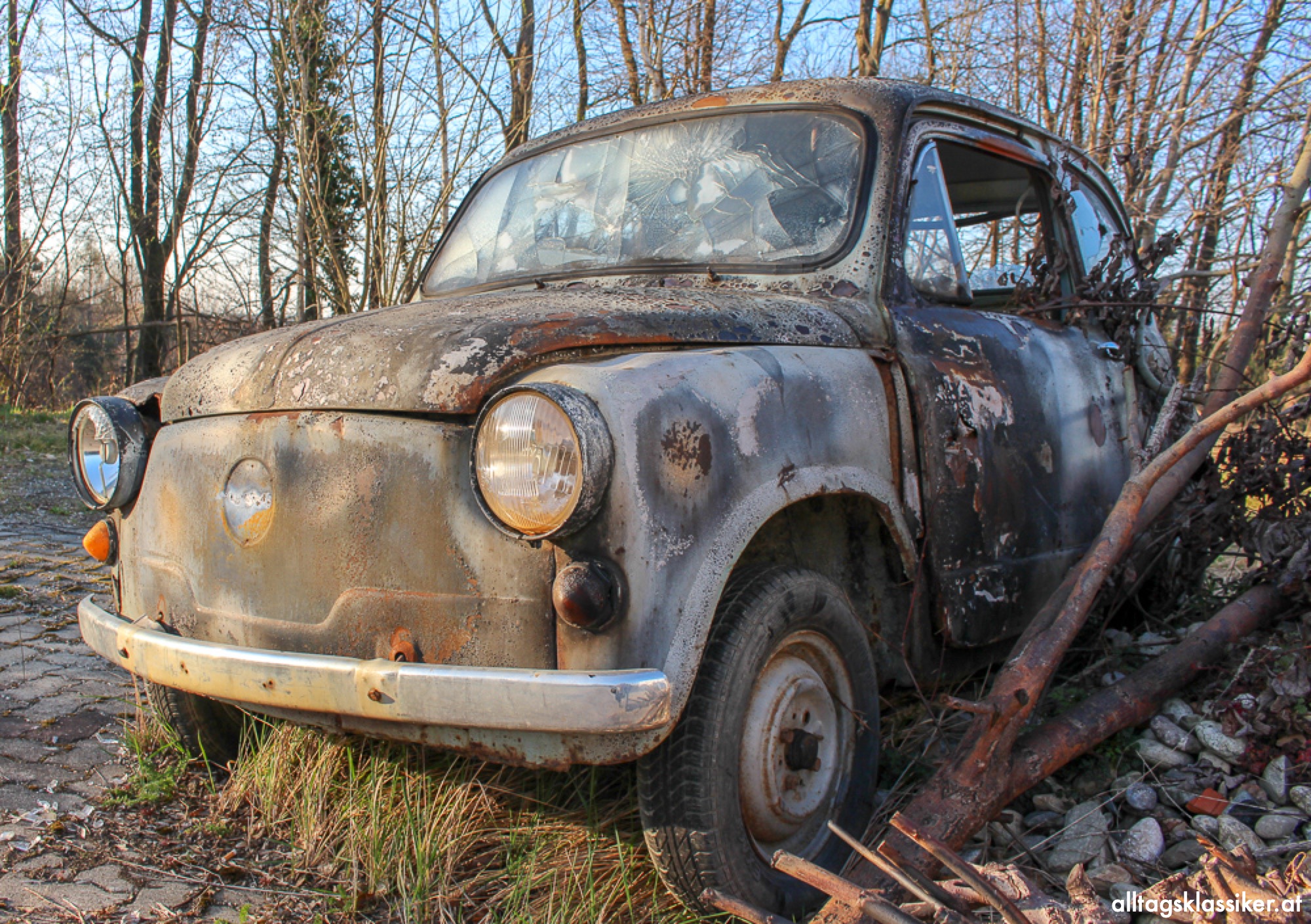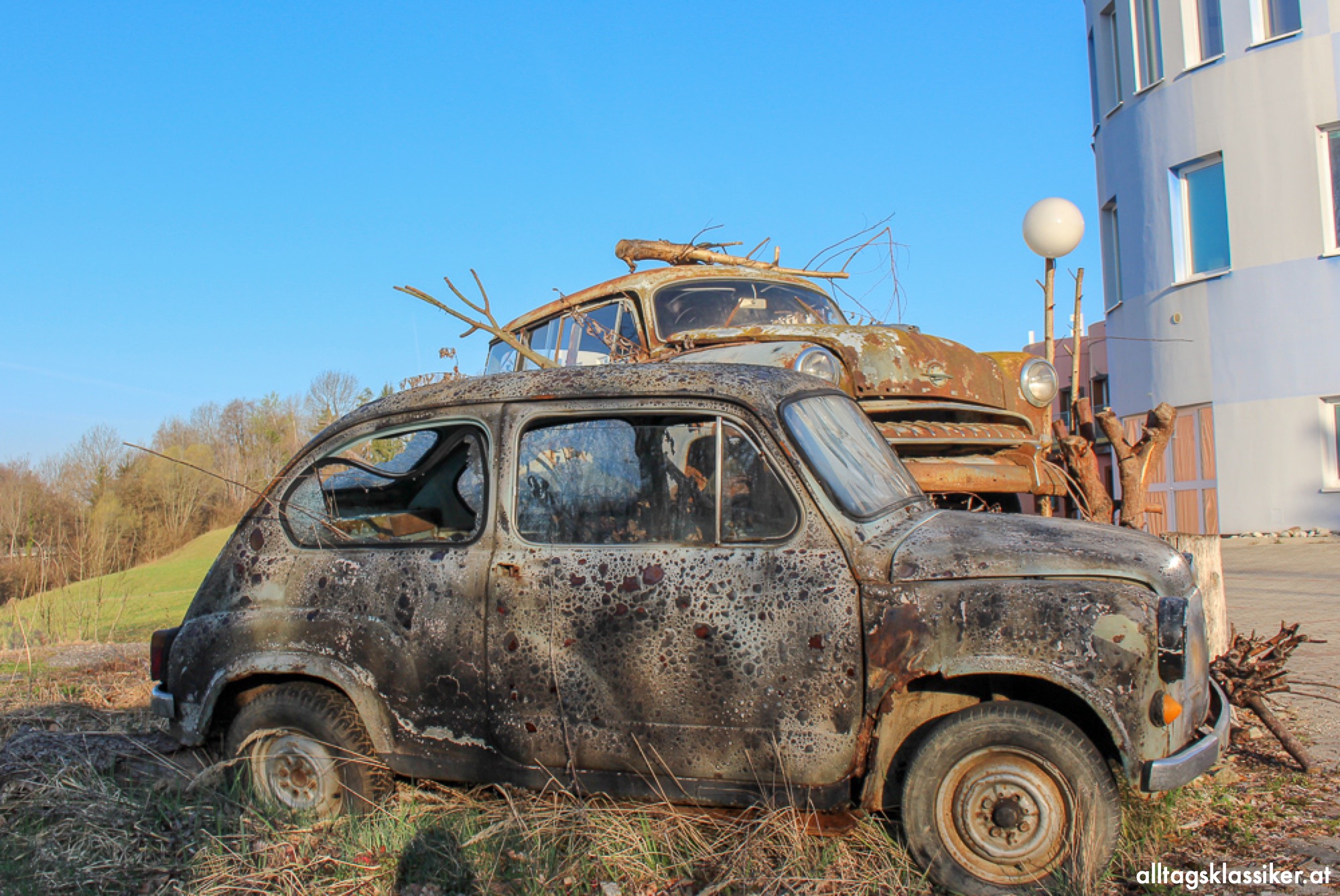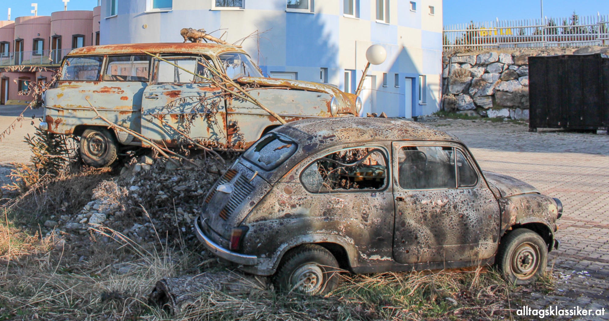 Da haben wir zuerst einmal einen Zastava 750, laut Auskunft vom Experten Marko (Fico Club Austria), sollte es sich um ein Modell aus den frühen 1970ern handeln, wobei auch einige Teile beim Exterieur von anderen Baujahren stammen dürften. Zastava hat von 1955 bis 2008 im einst jugoslawischen Kragujevac, nach Auflösung des Staatenbundes zu Serbien gehörend, bis 2008 Fahrzeuge in Lizenz oder auf Basis von Fiat-PKW produziert. Der Zastava 750 war ein Lizenzbau des Fiat 600, etwas länger als das Basismodell und mit kräftigerem Motor versehen. Während der dreißigjährigen Bauzeit gab es diverse Modifikationen, darunter ein stärkerer Motor mit 850 ccm der im Heck des Fico einzog. Eine rührige, gut vernetzte Szene kümmert sich liebevoll um den Erhalt des kleinen Ex-Jugoslawen – siehe auch meinen Bericht vom Treffen des Fico Club Austria aus dem Jahr 2017.