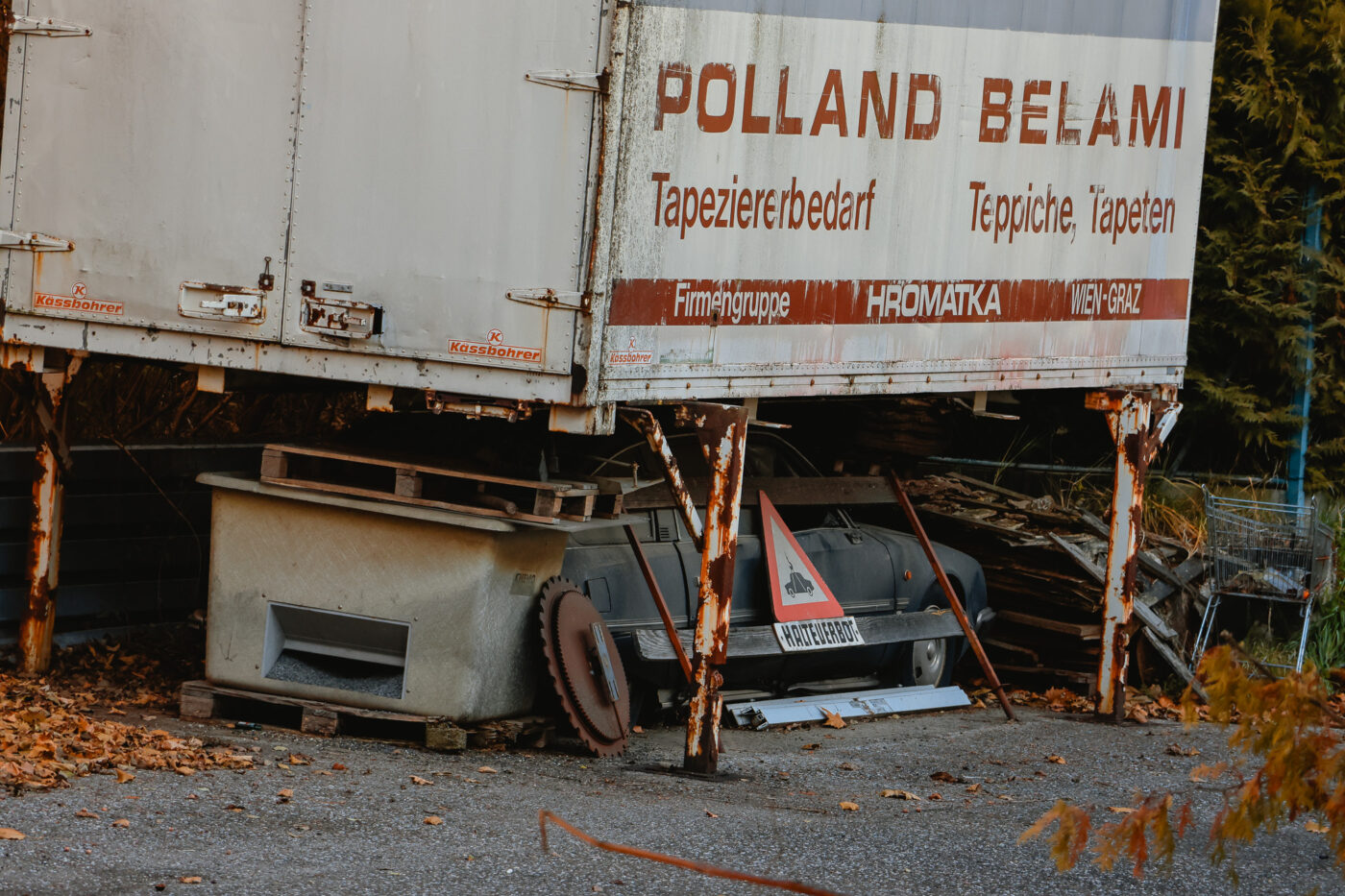 Kurz davor befindet sich ein Raumausstatter-Großhandel, und plötzlich werden Erinnerungen wach. Da habe ich doch mal den eingangs erwähnten Citroën abgelichtet. Gut, den Raumausstatter gibt es nicht mehr. Das große Einfahrtstor ist verschlossen, die großen Fenster sind zugeklebt, und entlang des Gebäudes wuchert das Unkraut. Irgendwann zwischen Juni 2019 und Jänner 2021 wurde der jahrzehntelang dort ansässige Betrieb geschlossen – soweit meine Erkundungen aus den Aufnahmen von Google Street View.