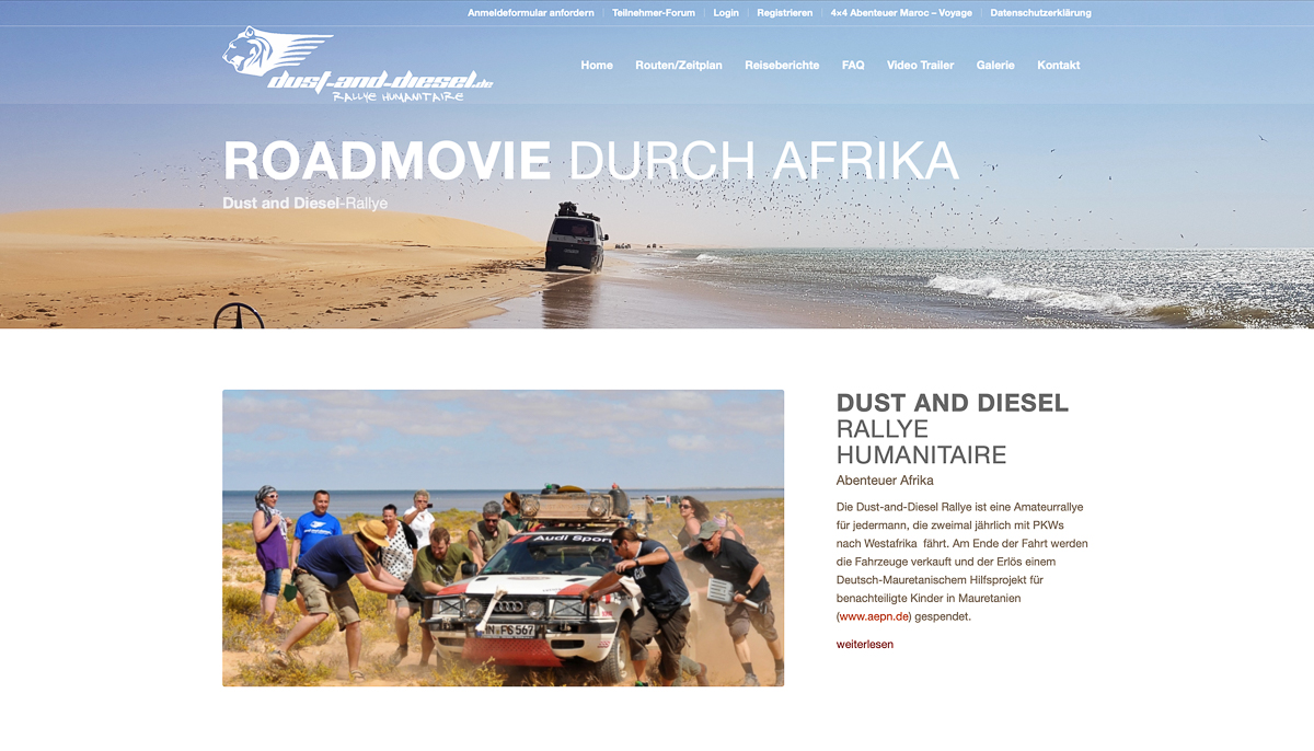 Als Amateurrallye für jedermann bezeichnet sich die Dust and Diesel. Auf den Spuren der legendären Rallye Paris-Dakar geht es von Deutschland in das westafrikanische Senegal. In kleinen Gruppen mit maximal 25 Teams, begleitet von erfahrenen Afrikaexperten und einem Rallyemechaniker geht es gen Süden.