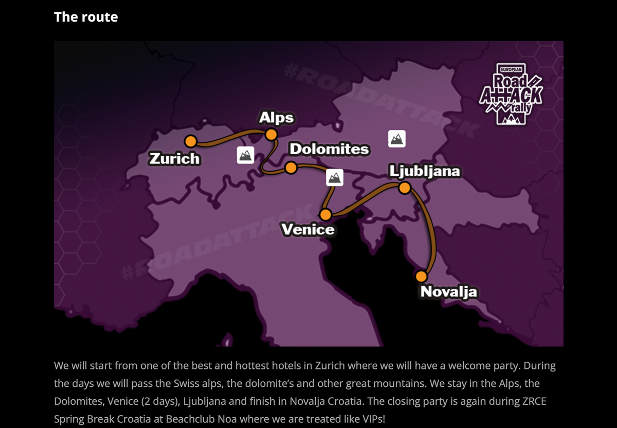 Von der Schweiz geht es über die Dolomiten zum Ruhetag nach Venedig, weiter über Laibach zum Zielort Novalja in Kroatien. Dort erwartet dich die Abschlussparty im Rahmen des ZRCE Spring Break Croatia im Club Noa.