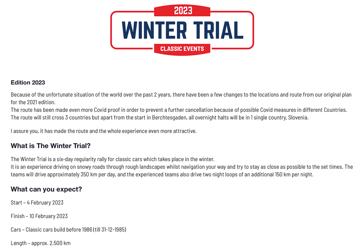 Das Winter Trial ist eine sechstägige Gleichmäßigkeitsrallye für Oldtimer, die im Winter stattfindet.