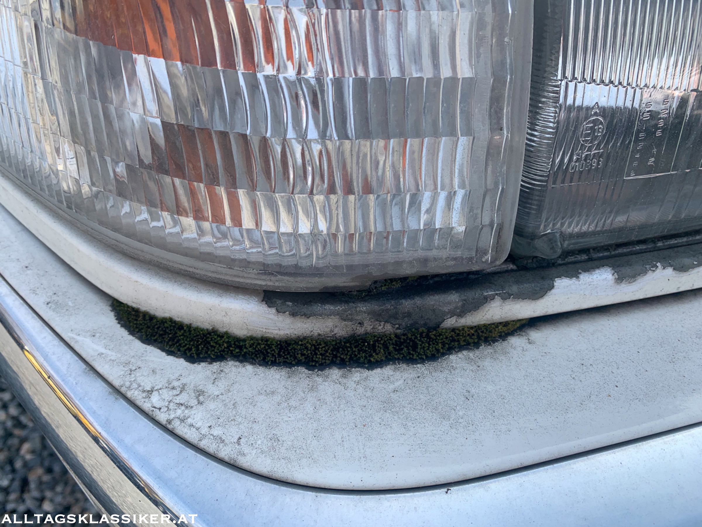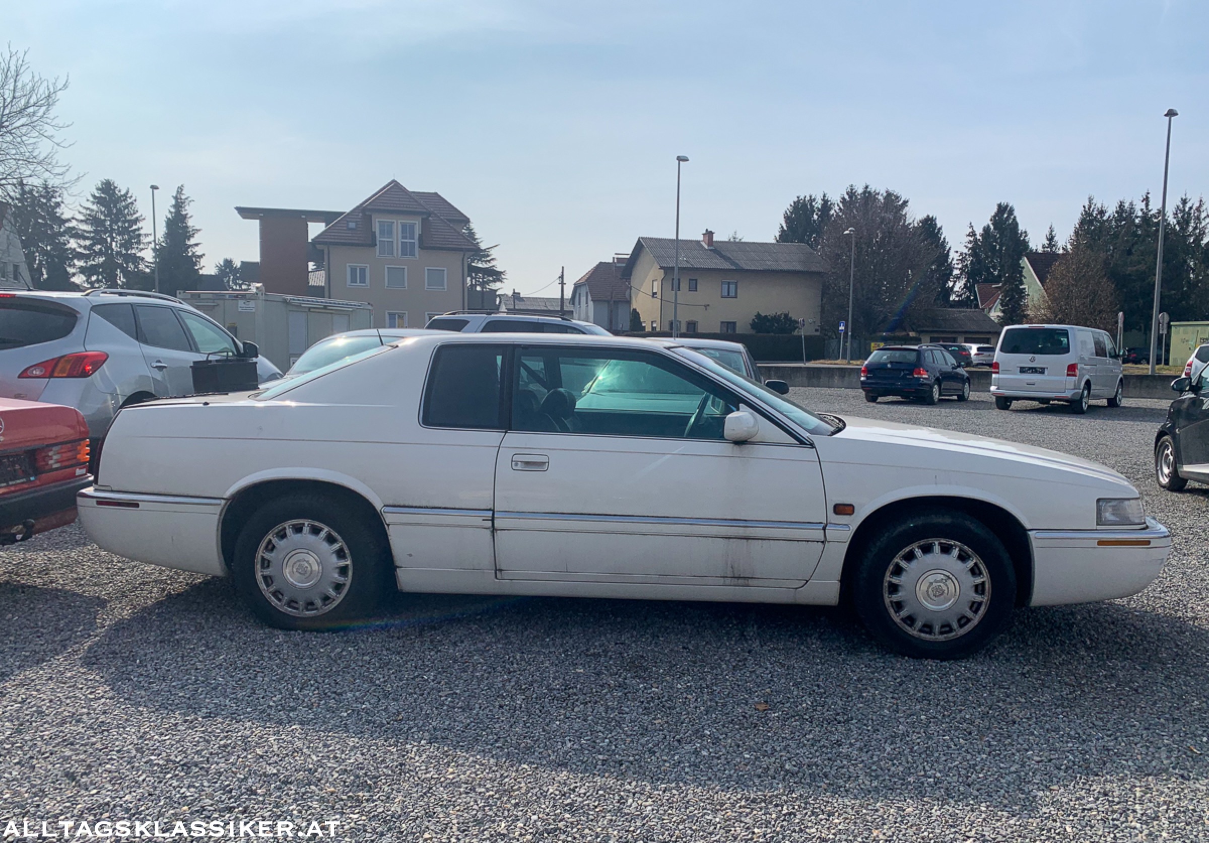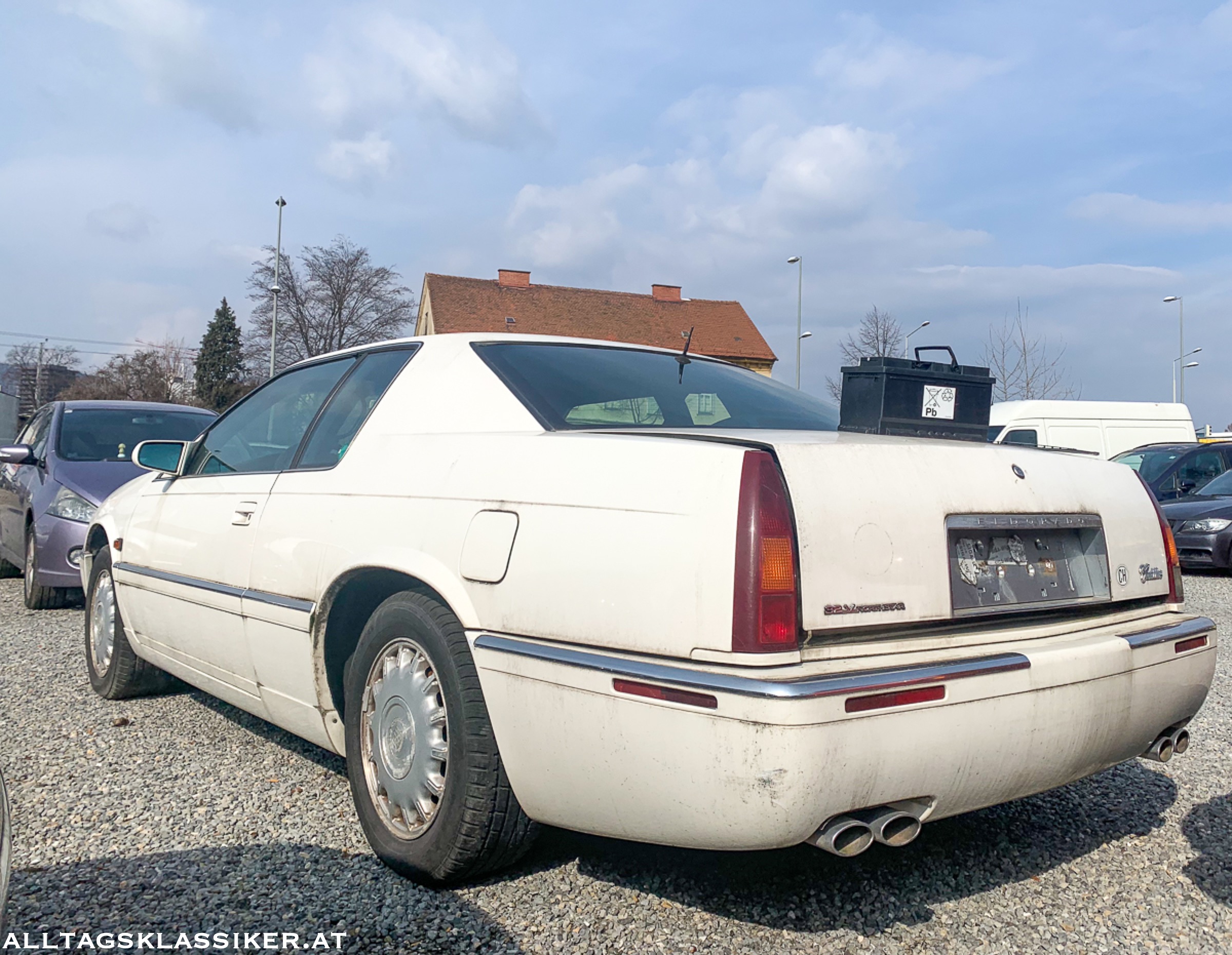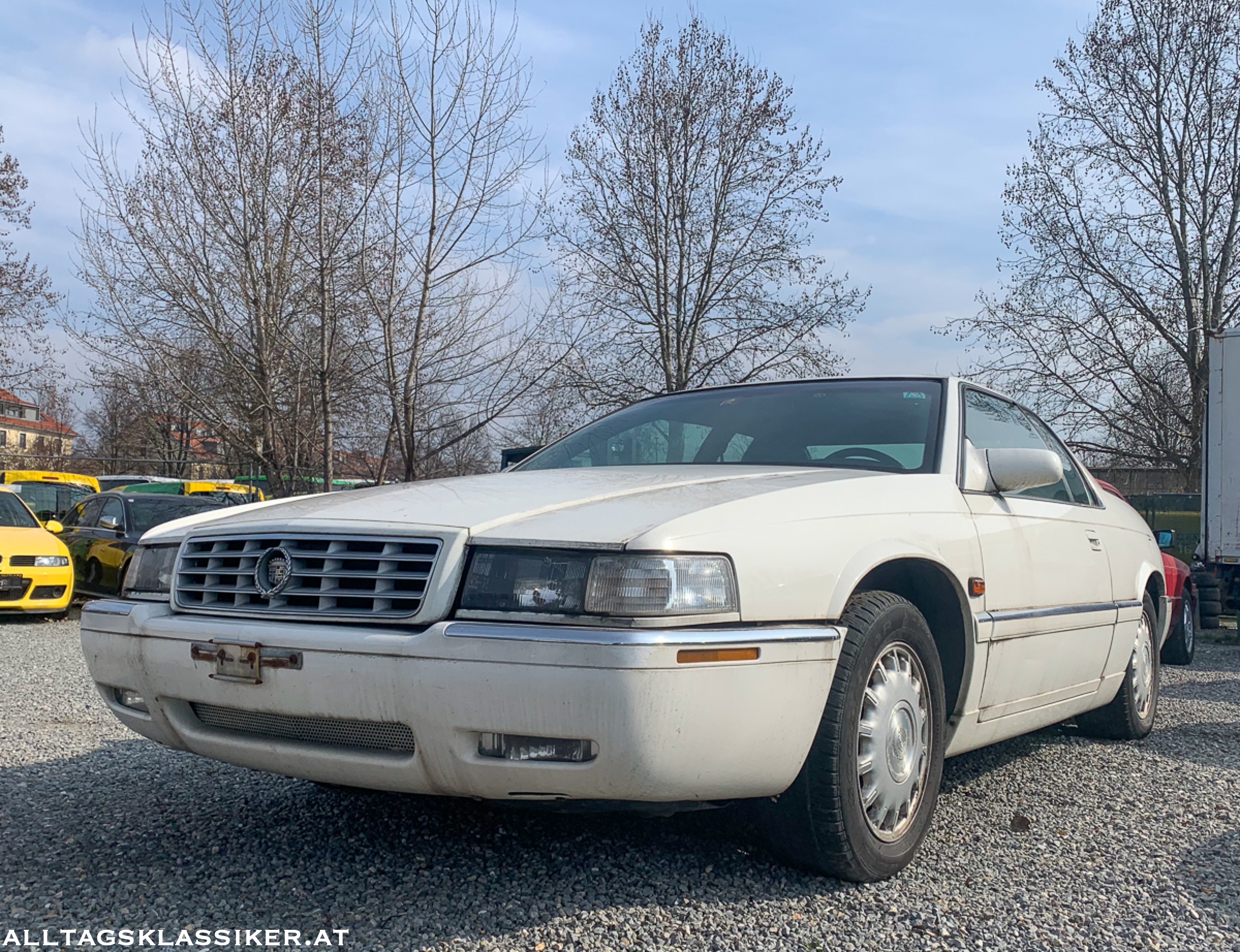 Mein persönliches Highlight am Platz ist aber der weiße waidwunde Cadillac Eldorado, mit dem 32V Northstar V8 Motor. Auch dessen beste Zeiten sind schon lange vorüber, Moos hat sich an so mancher Ecke angesetzt und die Schmutzschlieren, die sich ringsum finden, lassen auf eine längere Standzeit schließen. Ob aus den vier Auspuffrohren jemals wieder der V8-Sound erklingen wird, will ich hoffen, aber nicht so recht glauben.