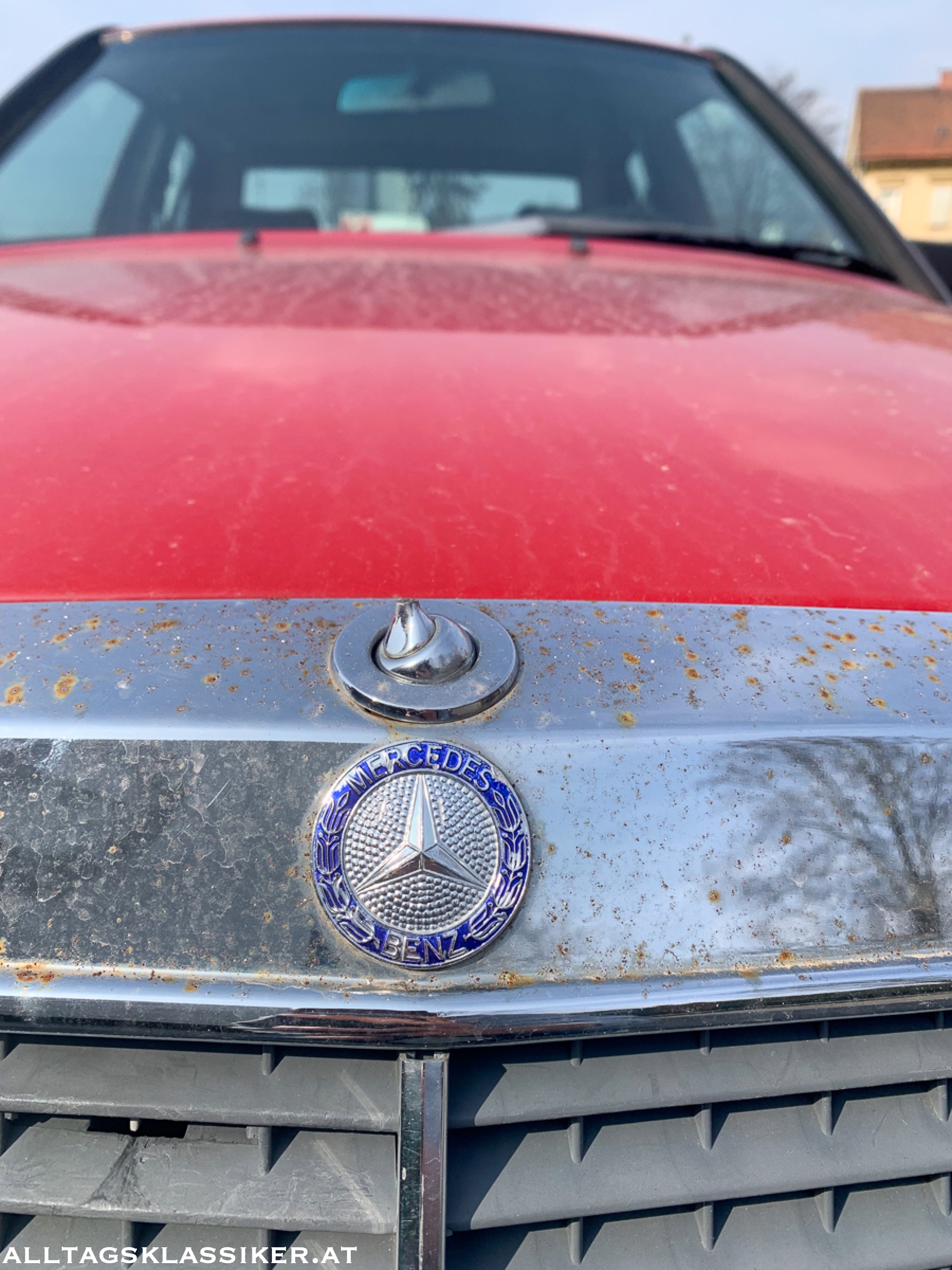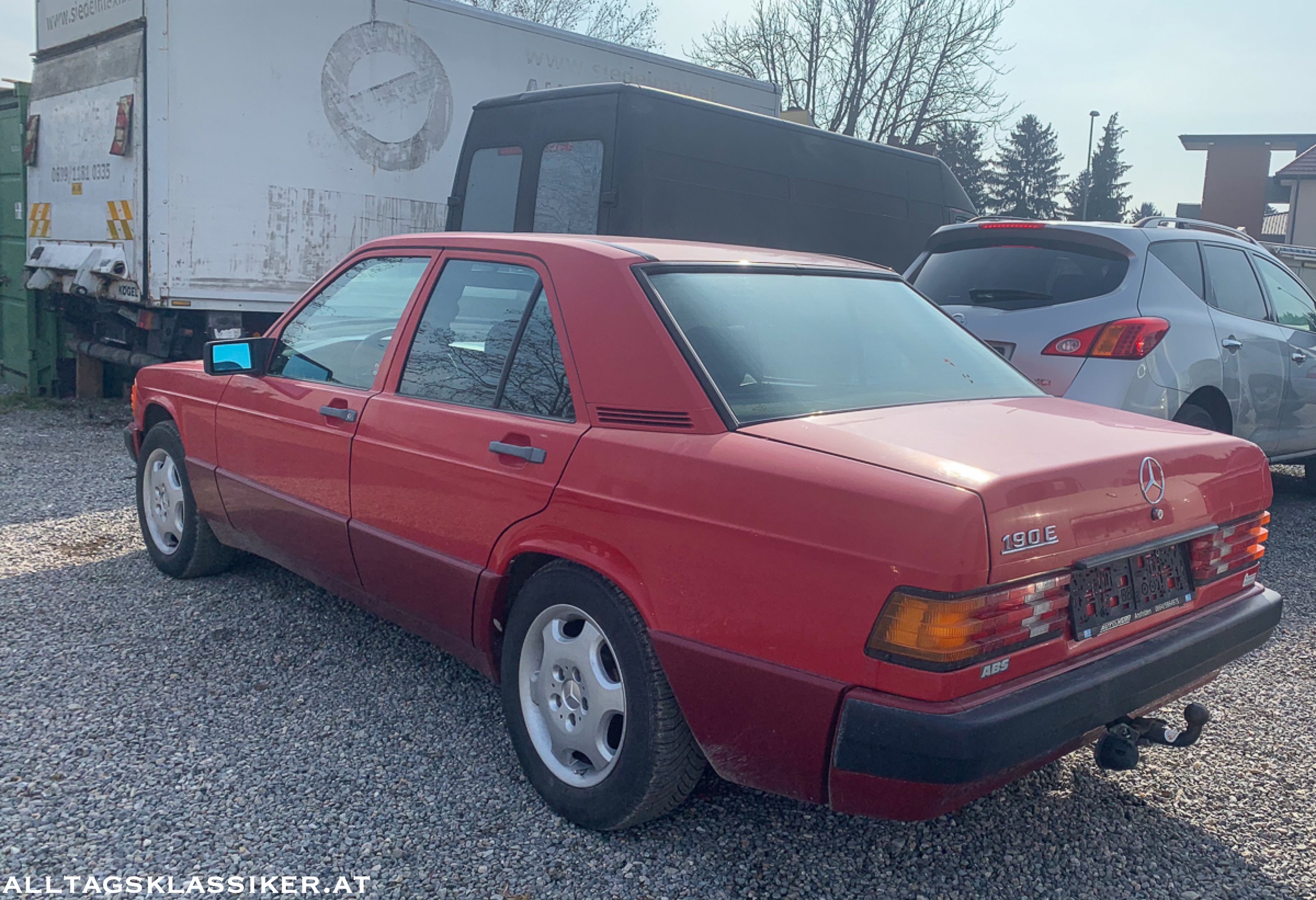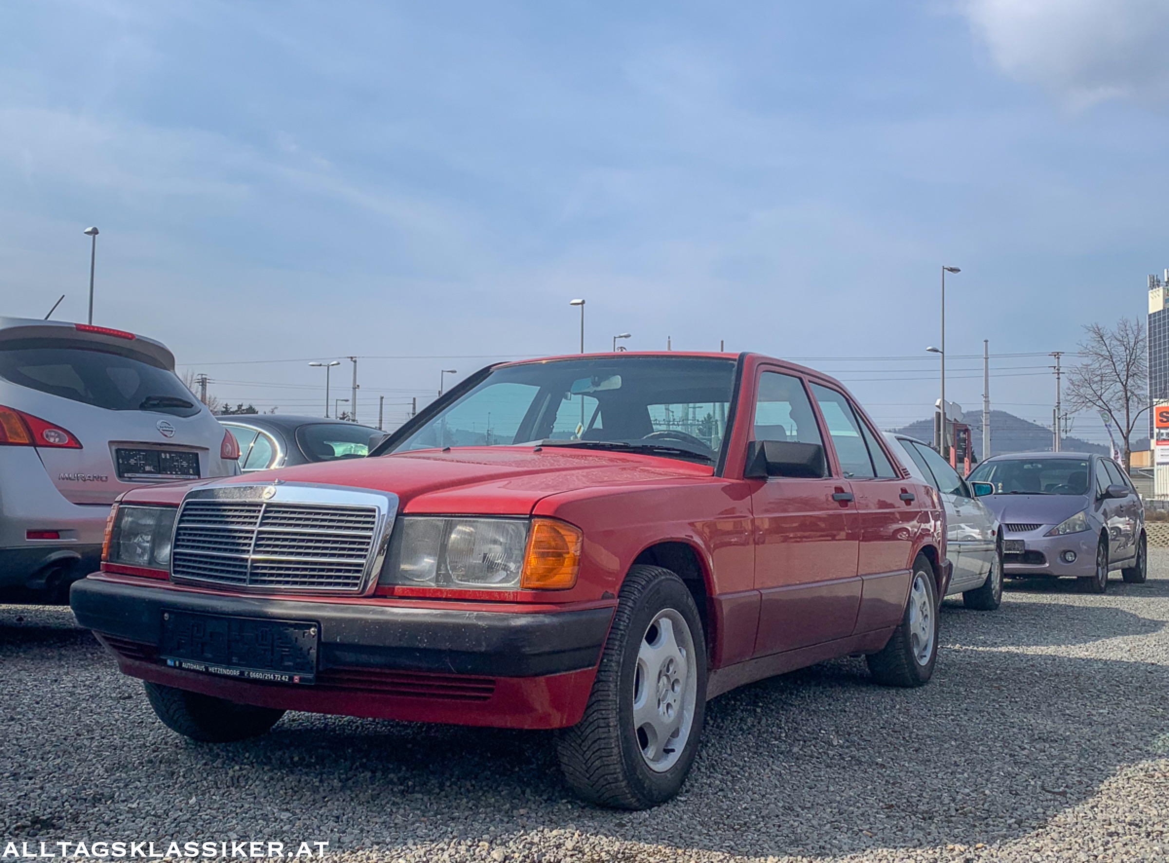 Ein signalroter Mercedes 190E mit Rost am verchromten Kühlergrill und verlustig gegangenem Stern wartet auf einen Retter. Preiszettel? Fehlanzeige.
