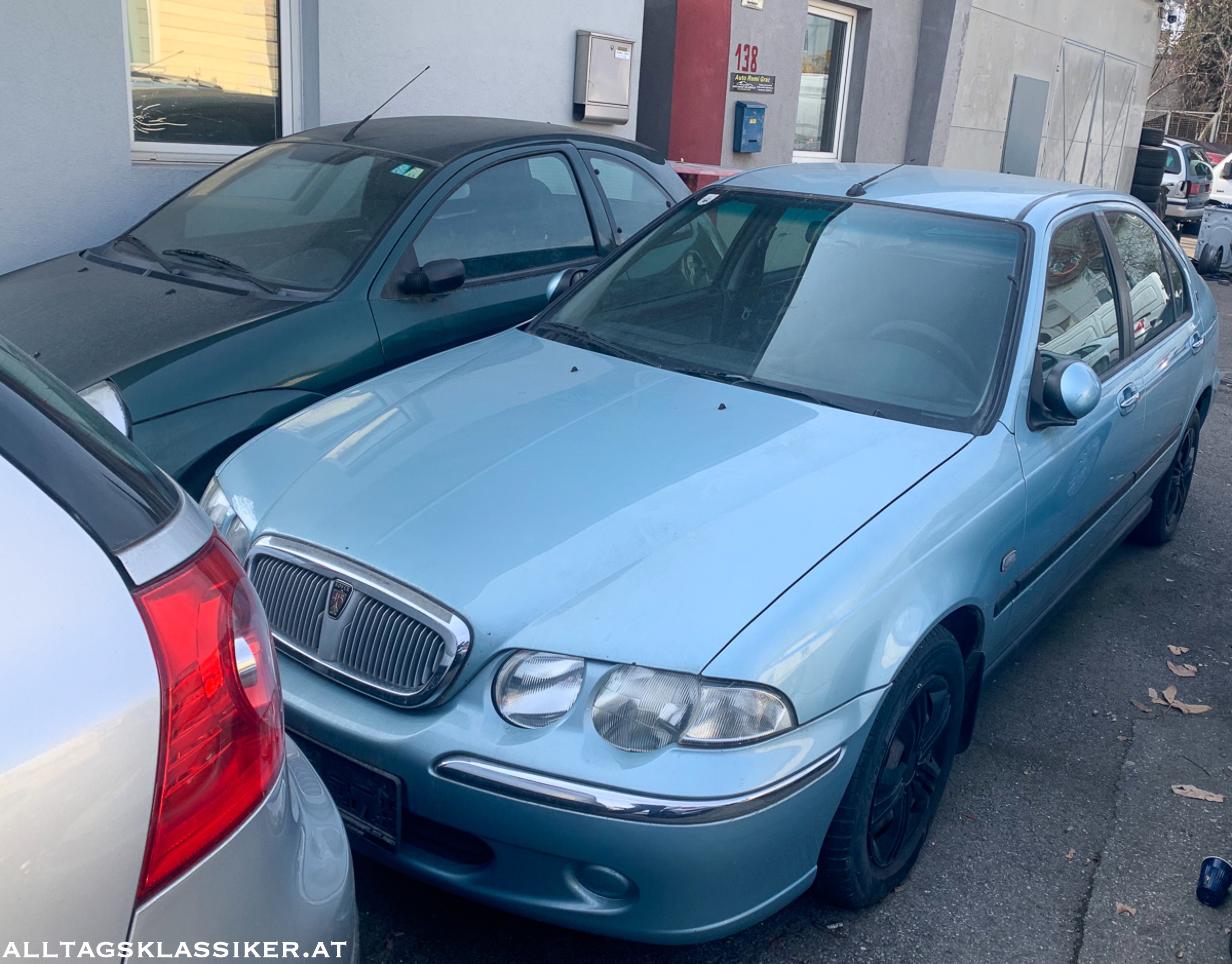 Gleich daneben findet sich ein Rover 45. Wieder einer der Rovers, dessen Ende erst mit dem Untergang des MG-Rover-Konzerns besiegelt war. Seinen Ursprung hat der 45 im fünftürigen Honda Civic aus den frühen 90ern. Mit allerlei Modellpflegen wurde aus dem Rover 400 über die Jahre der 45, der optisch dem größeren 75er angeglichen wurde.