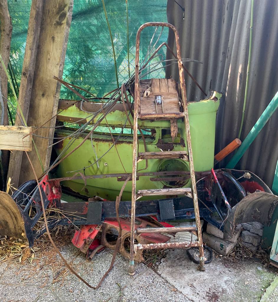 Und dann geschah nichts! Die Denkpause dauerte etwas länger und aus irgendeinem, heute nicht mehr ersichtlichen Grund, wanderte die Busfront, neben die neu zu errichtende Werkstatt, wo sie unter einem natürlichen Bambusdach bald Gesellschaft von einem abgesäbelten Dodge Polara Heck, einem halb geschlachteten-Maxi Moped und einem Knudsen Taunus Heckdeckel vor sich hin vegetierte. Scherzhaft wurde diese Ecke des Gartens „Boulevard of broken dreams“ tituliert, so Unrecht hatte derjenige gar nicht, der hier unfreiwillig zum Poeten wurde.