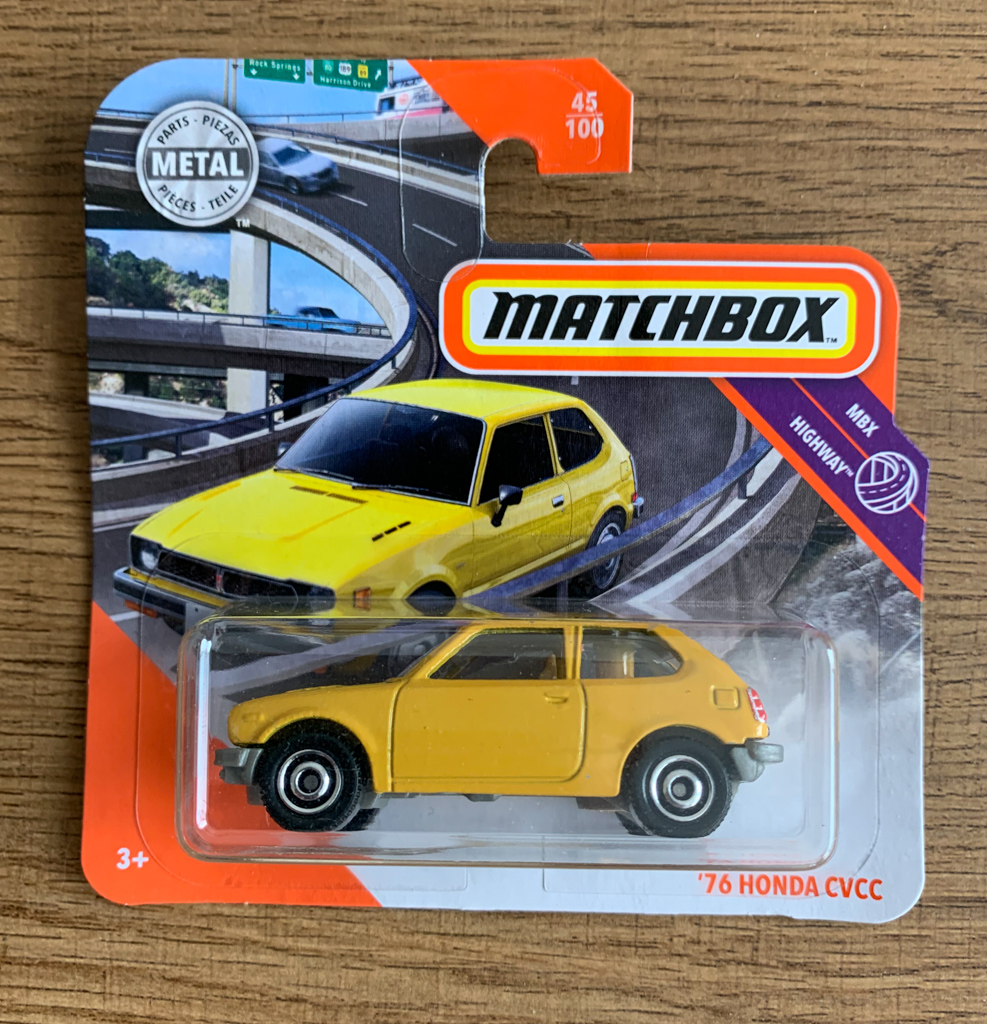 Um so mehr hat es mich gefreut, als ich heuer im Frühjahr bei einem Autohändler in der Weststeiermark, einen solchen Honda Civic der ersten Modellgeneration entdeckt habe. Der ist zwar hellblau metallic und nicht orange, aber ebenfalls mit Hondamatic ausgestattet, wenig Kilometer gelaufen und hat auch diesen „Nimm mich mit und hab mich lieb“ Blick drauf. Da könnte man direkt schwach werden, wenn man nicht schon einen zu großen Fuhrpark hat, der zu wenig bewegt wird. Und nachdem es schon 1994 nicht sein hat sollen, muss man das Glück kein zweites Mal herausfordern. Kurze Zeit später kam im Frühjahr 2020 von Matchbox genau diese erste Civic-Modellgeneration in gelb auf den Markt, so steht er eben etwas kleiner und fast in der selben Farbe in der Vitrine.