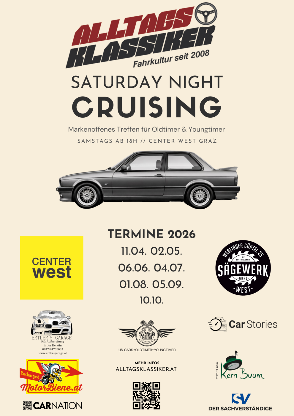 Wir treffen uns wie gewohnt an einem Samstag im Monat – von April bis Oktober, ab 18 Uhr am Parkplatz des Center West. Komm vorbei, mit deinem Youngtimer oder Oldtimer bis Baujahr 2000 – Hauptsache, du hast Freude an der Sache!