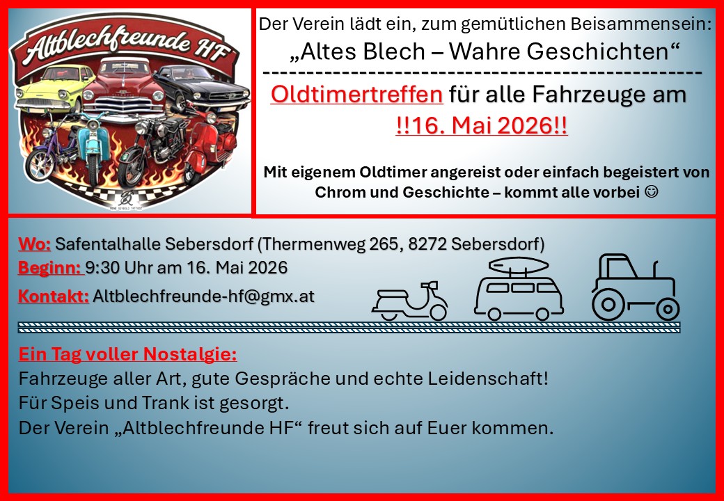 „Altes Blech – Wahre Geschichten“ Oldtimertreffen am 16. Mai 2026 in Sebersdorf des Vereins Altblechfreunde HF.