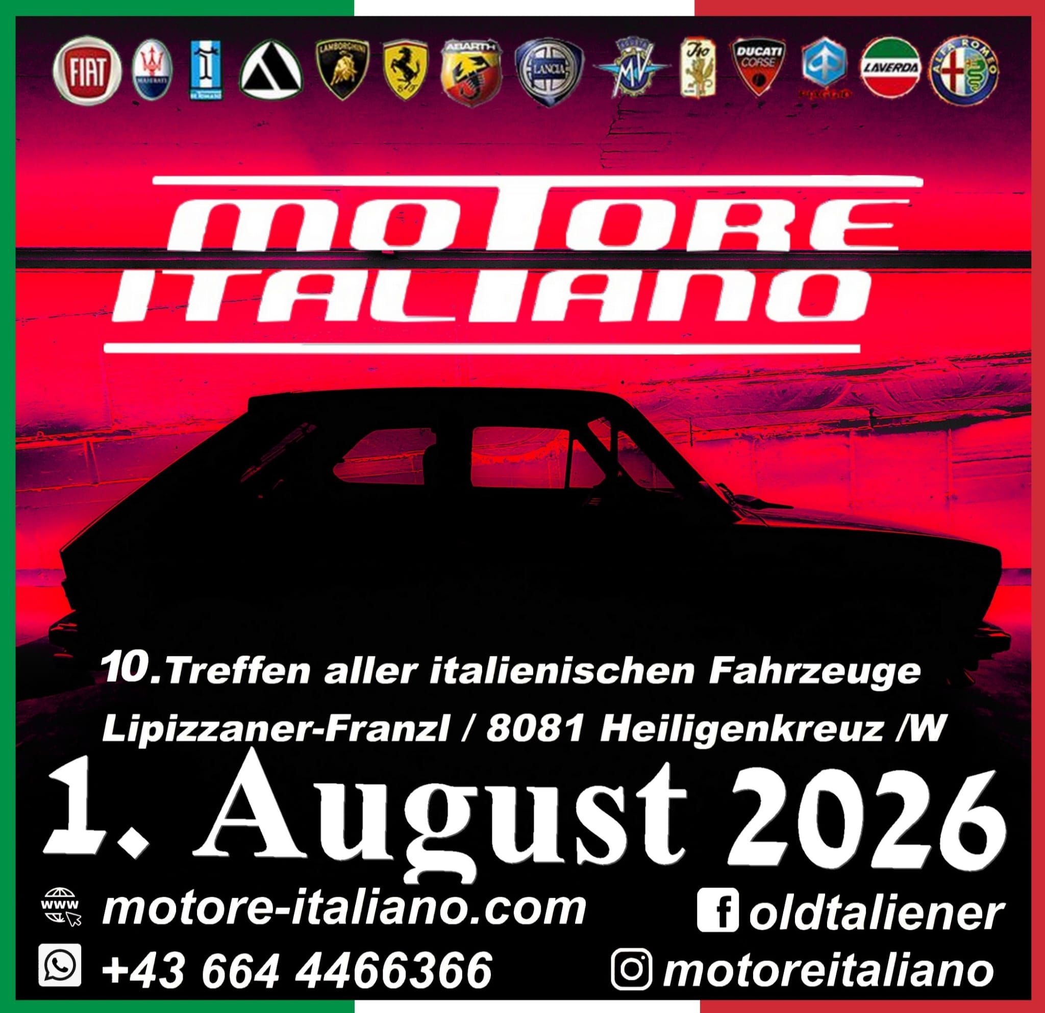 Motore Italiano - Treffen für Italienische Fahrzeuge beim Lipizzanerfranzl in Heiligenkreuz am Waasen Die„MotorNights“ finden in den Sommermonaten Mai – September statt, jeweils am ersten Samstag im Monat ab 18:00 Uhr Wir freuen uns wieder sehr auf Euer zahlreiches kommen! Die „MotorNights“ sind sozusagen der „Clubabend“ der... |