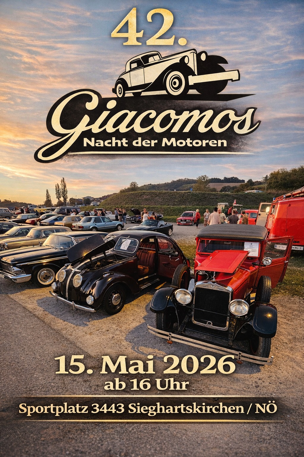 „GIACOMOS NACHT DER MOTOREN“ Oldtimertreffen in Sieghartskirchen am Freitag, 15.5.2026 ab 16 Uhr Nach dem fulminanten Saisonstart im April geht das monatliche Oldtimertreffen „Giacomos Nacht der Motoren“ am Fenstertag nach Christi Himmelfahrt, Freitag, 15....