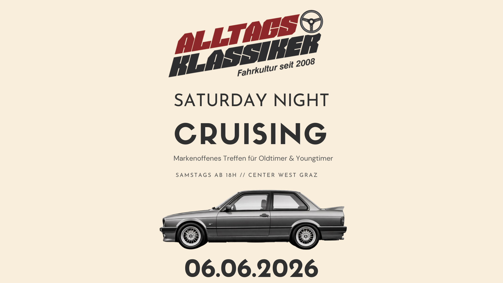 Das Alltagsklassiker Saturday Night Cruising geht 2026 in seine 15. Saison. Auch wenn sich über die vielen Jahre der Ort oder der Wochentag geändert haben, eines ist immer gleich geblieben: Es erwartet dich ein... Die„MotorNights“ finden in den Sommermonaten Mai – September statt, jeweils am ersten Samstag im Monat ab 18:00 Uhr Wir freuen uns wieder sehr auf Euer zahlreiches kommen! Die „MotorNights“ sind sozusagen der „Clubabend“ der... Die CultFriends - ein Verein zur Förderung von Motorsport und Erhaltung von Oldtimern - veranstaltet bereits zum 6. Mal das beliebte SprintRace. Eckdaten: 04.07.2026 Beginn: 09:00 Uhr Beschleunigungsrennen auf 1/16 Meile Bracket Race eigene... Diese Genuss-Tour wird als gesellige und touristische Veranstaltung für klassische Automobile aller Marken bis Baujahr 1997 abgehalten. Zu absolvieren sind zahlreiche Sonderprüfungen mit Wissens- & Schätzaufgaben sowie Geschicklichkeitsübungen mit dem Fahrzeug als auch Zeit-... |