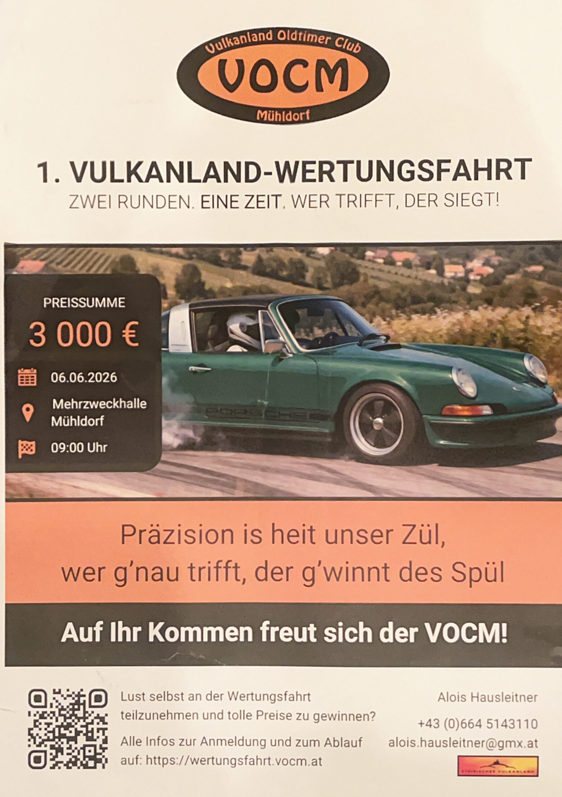 11 Veranstaltungen,Oldtimertreffen Schönegg bei Pöllau des Oldtimerclubs Pöllauertal ab 9h Starten werden wir gemeinsam mit dem Pothole Rodeo an einem geheimen Ort, verstreuen uns dann aber sofort am Morgen in verschiedene Himmelsrichtungen. Von dort schrauben wir uns nach der Durchquerung von ungefähr 122 unterschiedlichen... Ausfahrt der steirischen Oldtimer Freunde im Juni, Treffpunkt in Schemmerlhöhe am Hofer-Parkplatz Nach gleich zwei legendären Ausgaben im Jahr 2025 ist klar: Die Baja Alpina ist mehr als nur eine Rallye – sie ist ein Erlebnis für alle Sinne! Sechs Tage, rund 250 Kilometer täglich, hohe... Oldtimertreffen Semriach "Ein Fest wie damals" bei der Festhalle Semriach ab 10h Die Herausforderung besteht darin, mit einer alten Karre eine großartige fünftägige Tour quer durch Europa zu fahren – über 2.000 Kilometer! Beim Carbage run geht es nicht um Geschwindigkeit oder Zeit, sondern um Kreativität,...