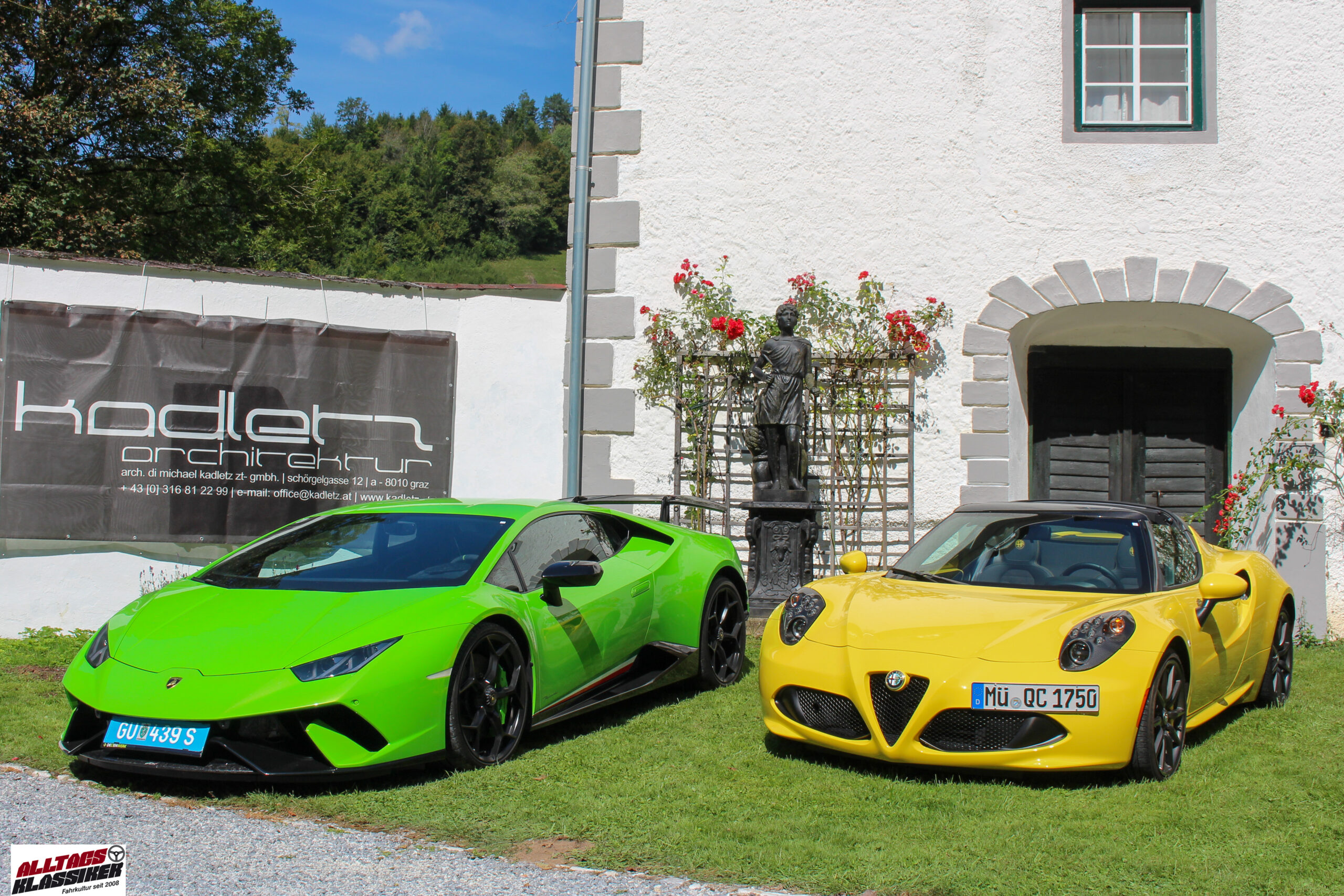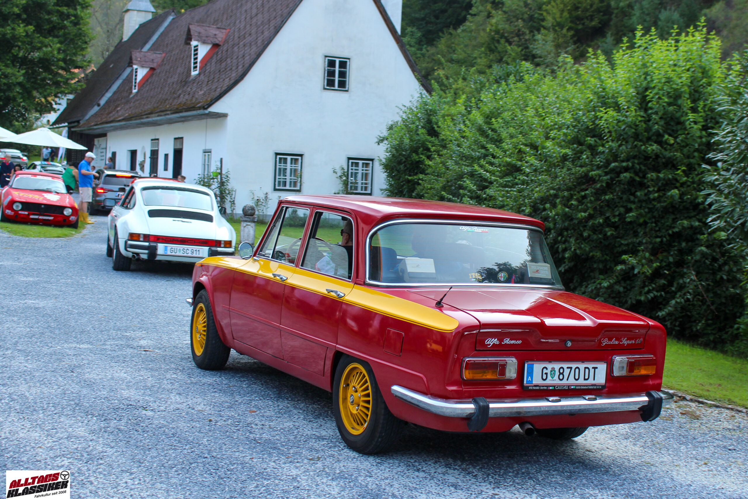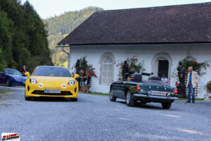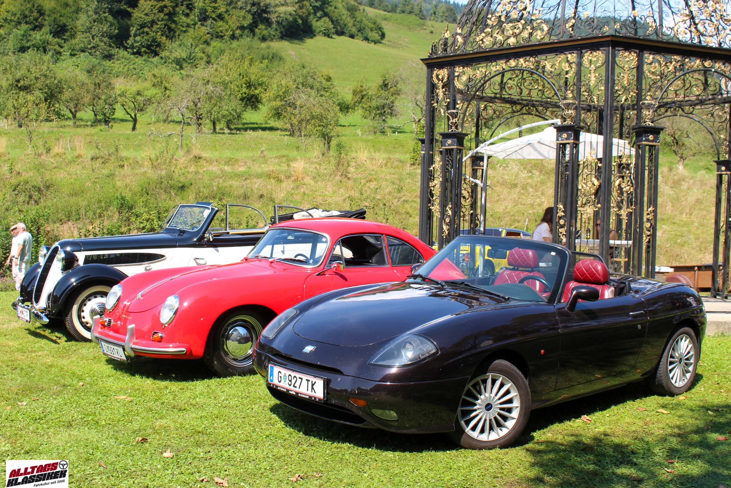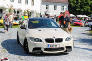 Ich war als Fotograf des Hauses im Dienst, was eine zeitige Anreise erforderte. Kühle Temperaturen am Morgen und reichlich Morgentau auf dem englischen Rasen des Gutes – noch kein Sonnenstrahl hatte sich in den Talkessel im wilden Westen der Steiermark verirrt. Doch diese unterkühlte Stimmung verflog, sobald sich die ersten Klassiker auf dem weißen Kies vor dem Herrenhaus zeigten.