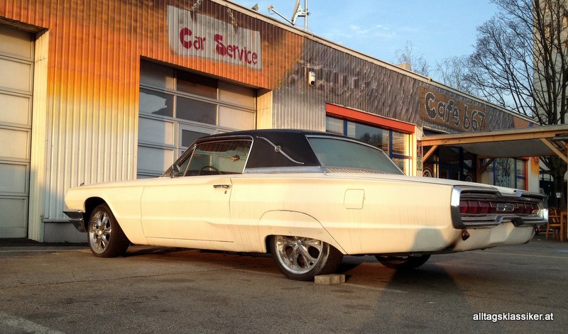 schon ein mächtiges ding dieses thunderbird coupe aus den 60er jahren, wenn ich nicht ganz irre ein 64er, aber ich lasse mich gerne eines besseren belehren, das mir da neulich in graz vor einer werkstatt mit angeschlossenem cafe (oder ist es doch umgekehrt) untergekommen ist.