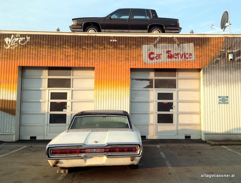 vor dieser werkstatt sieht man vermehrt klassische fahrzeuge, meist aus den vereinigten staaten. so auch diesen t-bird, der aus der vierten modellgeneration stammt und den „flair birds“ zuzuordnen ist.
