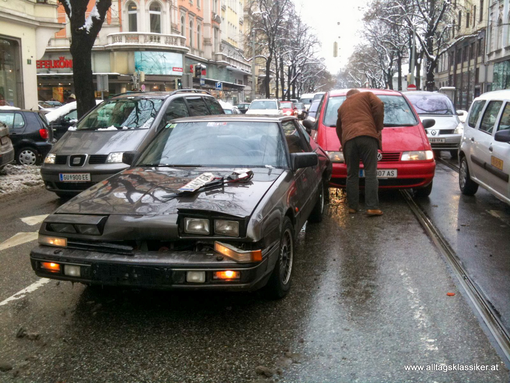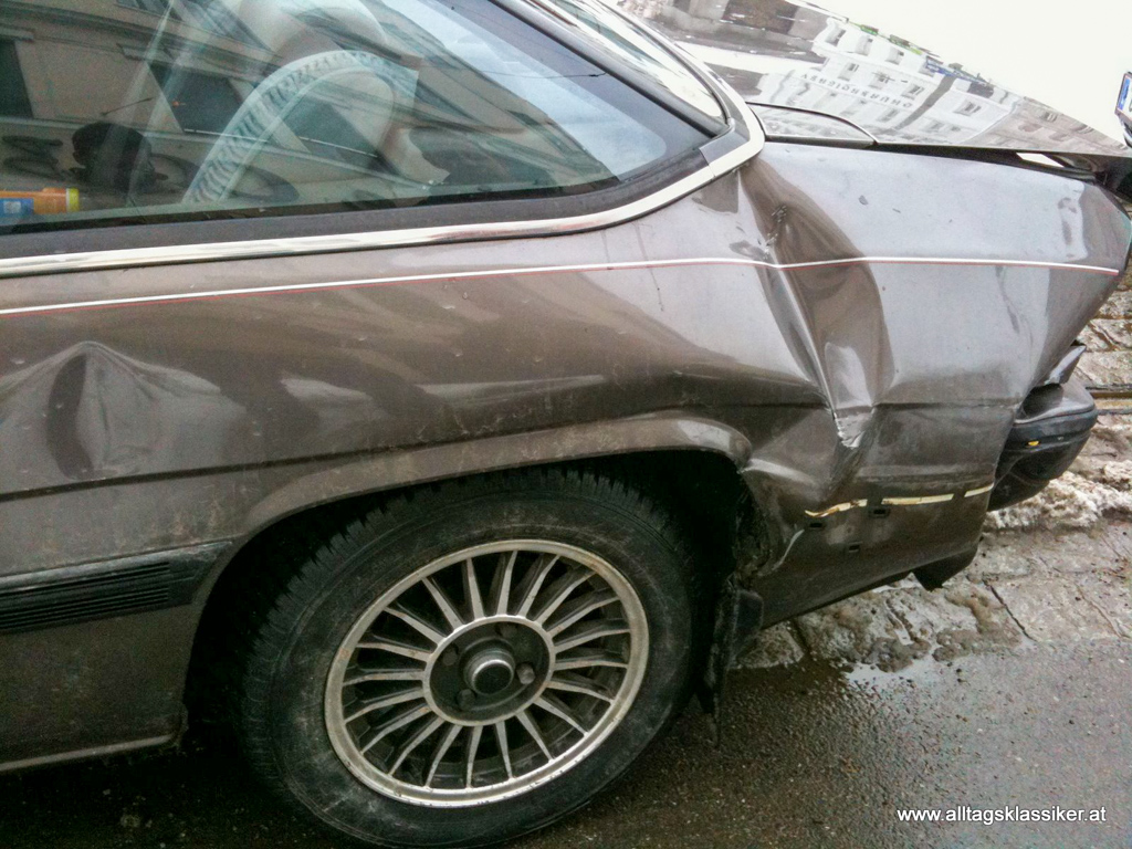 An einem Freitagnachmittag im Februar 2010 am Heimweg von einer harten Arbeitswoche, die Temperaturen deutlich unter dem Nullpunkt, hatte leichter Schneefall eingesetzt. Das Tempo den Straßengegebenheiten angepasst ging es am Joanneumring der Heimat entgegen. Nicht rechnen konnte man mit einem roten VW Sharan, der hinter mir in Ping-Pong-Manier die Spuren wechselte und das abbremsen der vor ihm fahrenden vor der eben rot gewordenen Ampel scheinbar nicht gecheckt hatte. Er schob mich, den an die Kolonne zurollenden, auf den Vordermann mit Wucht auf. Das Ergebnis ist deutlich an Front und Heck des braunen zu erkennen. Mehr als Schleudertrauma erlitt ich damals nicht, das noch dazu charmant von einer netten Sanitäterin versorgt wurde und im UKH mit einer Halskrause und Schmerzmitteln behandelt wurde. Schlimmer war da schon der Verlust des ans Herz gewachsenen Coupes.