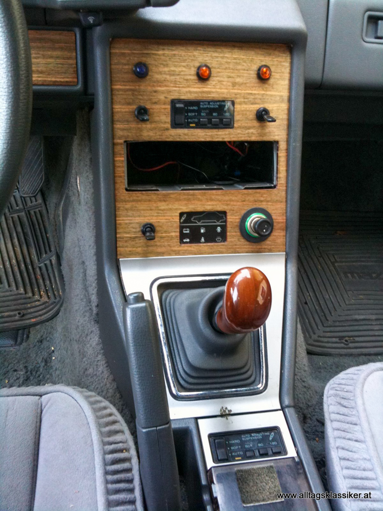 Der Vor-Vorbesitzer hatte wohl einen englischen Klassikerfimmel und war der Meinung, das auch Holzblenden dem spacigen Interieur des 84er Mazda Coupes gut stehen würde. Ebenso war ein Holzlenkrad und ein Schaltknauf aus Holz verbaut. Mit dieser speziellen Vorstellung von klassischer Optik stand er wohl recht alleine da. Ich konnte einstweilen damit Leben, die chronische Bindehautentzündung vom täglichen Anblick hielt sich noch in Grenzen. Es würden ja sowieso die originalen Teile von blau auf grau getauscht werden, sobald der nahende Winter vorbei wäre und mehr Zeit für den neuen alten Dailydriver wäre. Raus mit den billigen nachgerüsteten Kippschaltern, rein mit dem Originallook, so war der Plan.