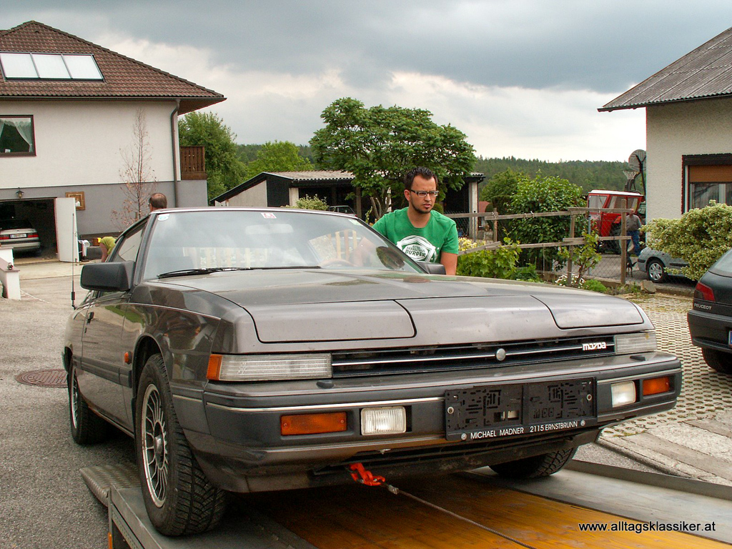 Der 929 in Taubenblau-Metallic (V3) war mit der einzigen in Österreich verfügbaren Innenausstattung Stoff grau (C2) ausgestattet, wurde nach jahrelangem Koma in einem Hühnerstall aus selbigem befreit, das Stroh im Motorraum zeugte noch von diesem langjährigem Standplatz. Der Besitzer hatte ihn in der Weststeiermark gekauft, nicht lange bewegt und während der Schaffung des Eigenheims und der Familiengründung weggestellt. 75.000 Kilometer zeugten von wenig Betrieb während seiner 23 Jahre. Mit frischer Batterie lief das Coupe wie ein Glöckerl, die Probefahrt verlief recht zufriedenstellend. Einzig eine leicht blockierende Bremse trübte den Fahrgenuss ein wenig. Das Problem wurde an Ort und Stelle behoben. Ein wenig noch den schon niedrig aufgerufenen Preis gedrückt und abging es im Mazda-Konvoi über die Bundesstraße via Soboth zurück ins steirische.