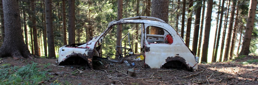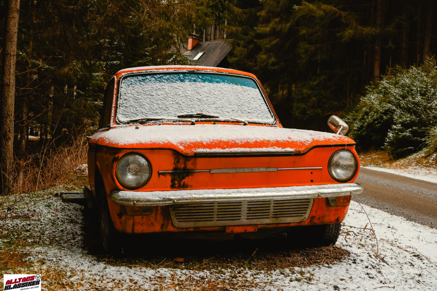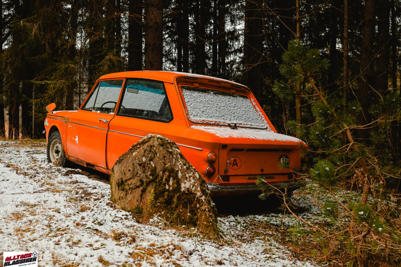 Auf den Imp bin ich gekommen, nachdem ich in der Instagram-Story einige Bilder gepostet hatte, die den Waldfund des Moretti 1300 Coupés dokumentierten, den ich vor einigen Jahren entdeckt habe. Auf solche Posts kommen immer wieder mal Infos zu anderen, irgendwo im Wald, auf verlassenen Bauernhöfen oder in Werkstätten zurückgelassenen Fahrzeugen. Im konkreten Fall hat mir Linde geschrieben – und gleich ein Bild mitgeschickt. Danke, Linde!