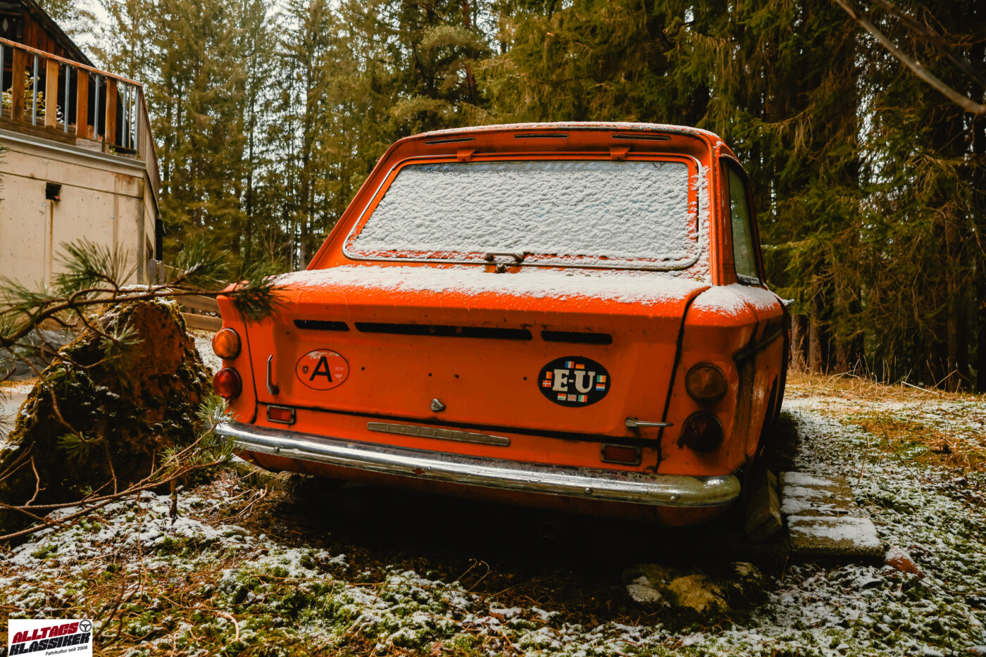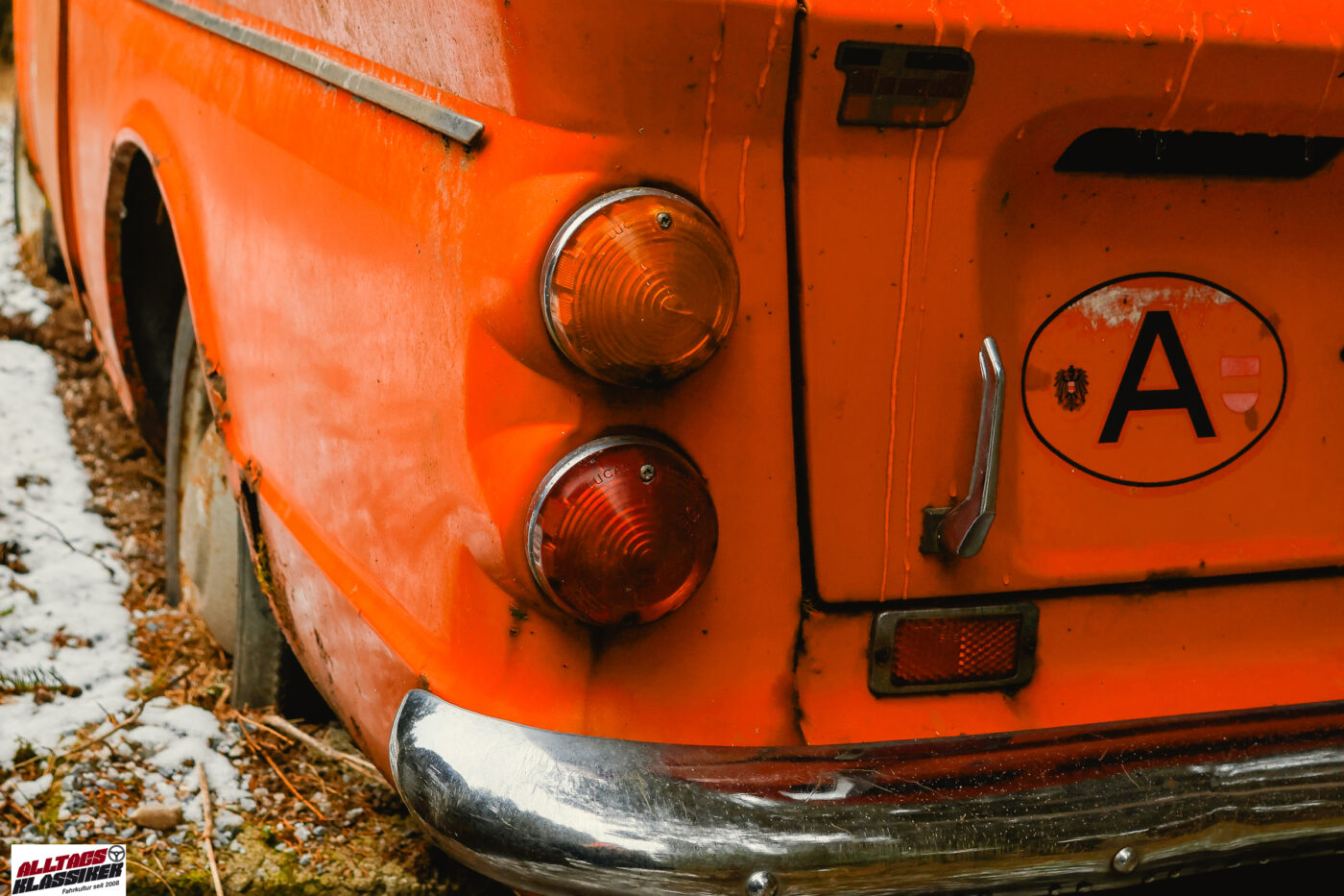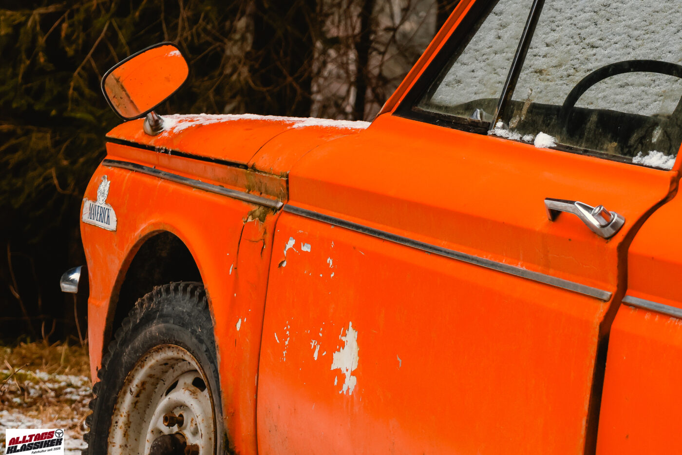 In der Nacht vor meinem Besuch muss es leicht geschneit haben, denn die Fahrzeuge haben einen Hauch von Schnee auf ihren Karosserien liegen. Das macht es mir nicht leicht herauszufinden, wie lange der kleine Kobold (die deutsche Übersetzung von „Imp“) schon an den Gestaden des Stausees verweilt. Dank der auf der Windschutzscheibe angebrachten §57a-Plakette – vulgo „Pickerl“ – lässt sich der Zeitraum aber eingrenzen: Irgendwann zwischen 1987 und 1993 wurde die Plakette zum letzten Mal erneuert, was auf eine über 30-jährige Standzeit schließen lässt.