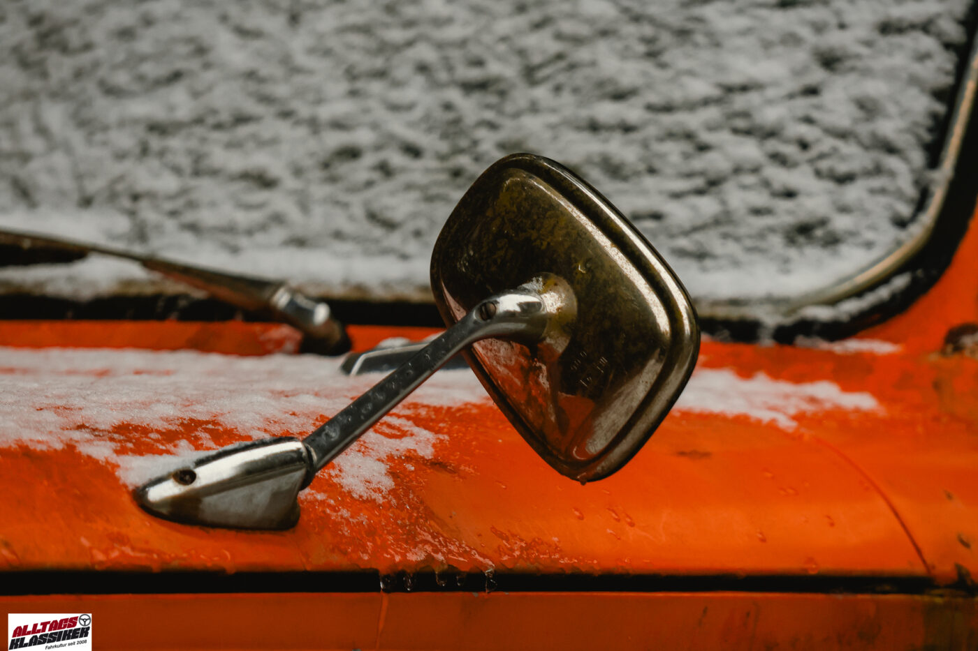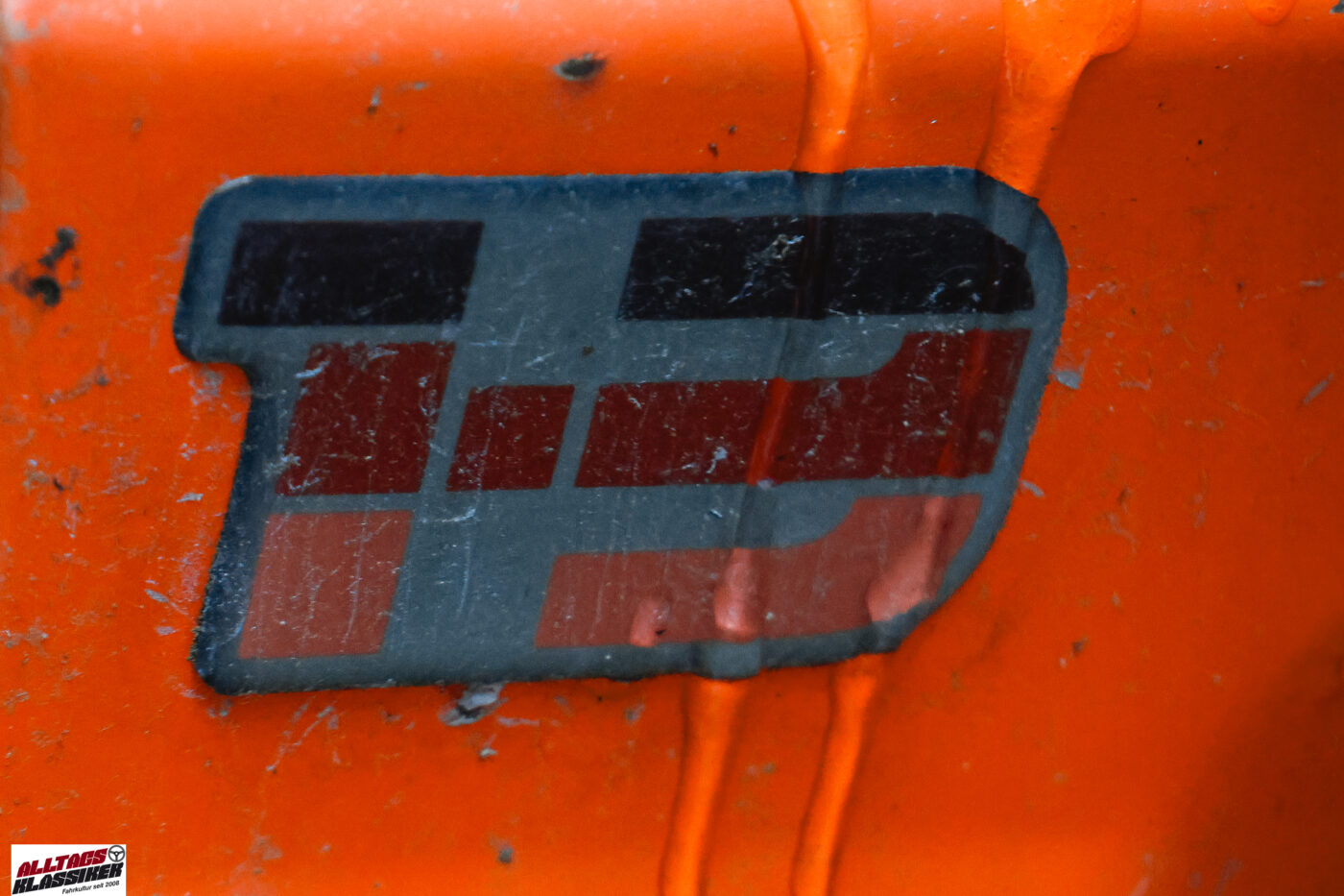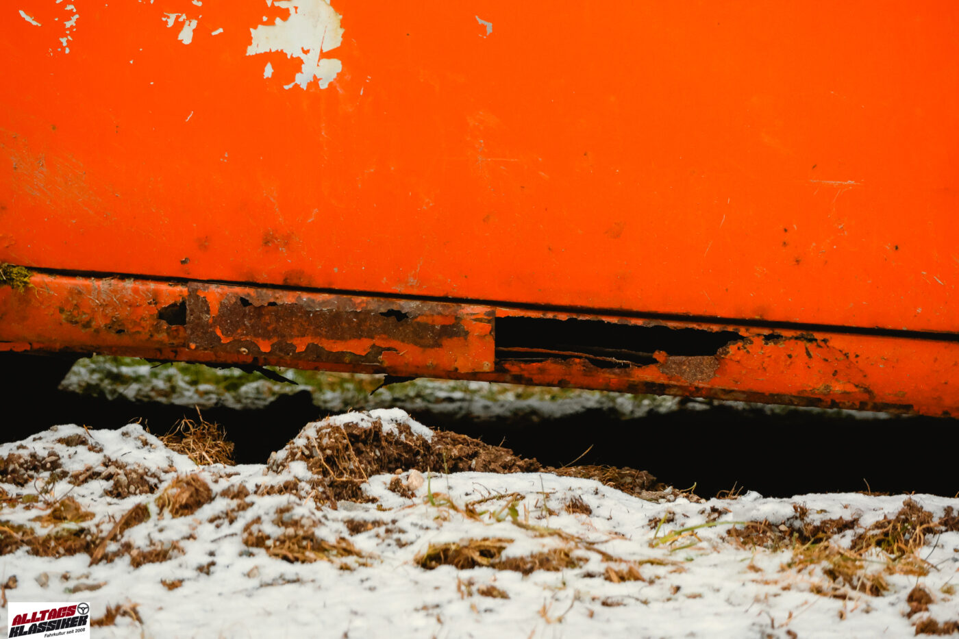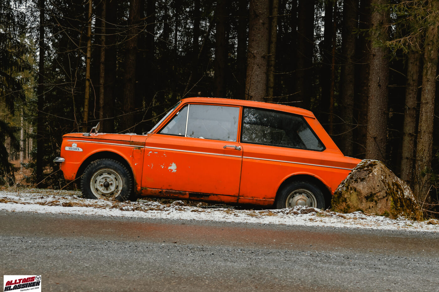 In der Nacht vor meinem Besuch muss es leicht geschneit haben, denn die Fahrzeuge haben einen Hauch von Schnee auf ihren Karosserien liegen. Das macht es mir nicht leicht herauszufinden, wie lange der kleine Kobold (die deutsche Übersetzung von „Imp“) schon an den Gestaden des Stausees verweilt. Dank der auf der Windschutzscheibe angebrachten §57a-Plakette – vulgo „Pickerl“ – lässt sich der Zeitraum aber eingrenzen: Irgendwann zwischen 1987 und 1993 wurde die Plakette zum letzten Mal erneuert, was auf eine über 30-jährige Standzeit schließen lässt.