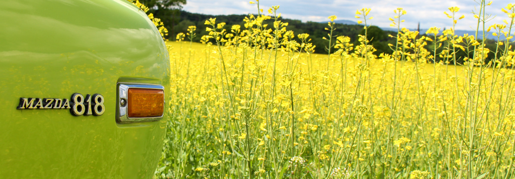 Raus damit und auf das Garagentor! So führten wir am Wochenende erstmals die Erbse (Mazda 818 Sedan de Luxe) aus. Viel Vorbereitung war dazu nicht notwendig, das Prüfen von Ölstand und Kühlwasser ist obligat, ebenso das Checken des Reifenluftdrucks. Die frisch geladene Batterie ist mit wenigen Handgriffen eingebaut und beim dritten Startversuch ist der 1300er Motor zur Mitarbeit bereit, ein wenig ruckeln und hantieren mit dem Choke später, läuft die kleine Limousine rund. Ein wenig Kosmetik und Pflege am Lackkleid und eine Innenreinigung der Scheiben sorgt für Glanz und klare Sicht.