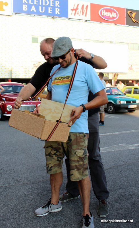 Volvi klärte ihn auf, hängte ihm den Bauchladen um überraschte auch noch mich mit einem Geschenk. Da die Aktion ein Dankeschön für Mickys Einsatz für Alltagsklassiker ist, da er sich um alles kümmert und alles organisiert. Da darf man (laut Volvi) mich nicht vergessen. Ich lasse ihm den nötigen Freiraum und unterstütze ihn auch dabei. Und das Geheimprojekt Kork hätte mich einiges an Nerven gekostet. Letzteres stimmt auch 😉