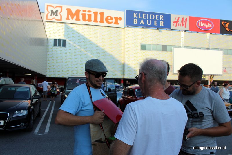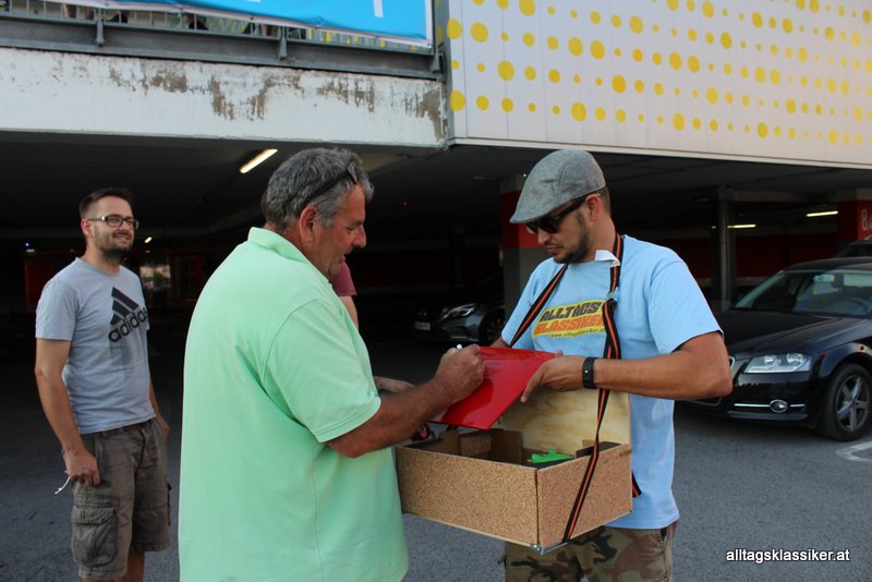 Claus kam mit der Idee an Micky ein Dankeschön zukommen zu lassen. Aufgrund der Tatsache das er seit Jahren unermüdlich Zeit und auch Geld in Alltagsklassiker investiert. Das ich nur bestätigen kann: neben eines Vollzeit-Jobs und familiären Verpflichtungen werden Oldtimertreffen besucht, Fotos gemacht und bearbeitet, Blogbeiträge geschrieben, die Alltagsklassiker-Facebookseite und das Forum betreut, Routen für das Cruise´n´Grill ausgetestet, etc. Ich unterstütze ihn natürlich bei Allem und versuche so viel es geht zu übernehmen, dennoch bleibt sehr viel für ihn zu tun.