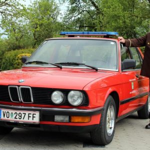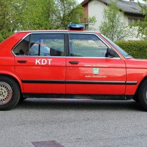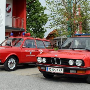 Der zweite Klassiker im Dienste der FF Mooskirchen, der BMW 520i war teil einer Sammelbestellung für alle steirischen Bezirksfeuerwehrkommandanten und somit Dienstfahrzeug für Erwin Draxler Senior, der ihn auch auf eigener Achse aus dem deutschen Ulm in seinen steirisches Dienstbezirk überstellt hat. Nach dem Ausscheiden aus dem Dienst 2002, wurde der BMW von Erwin Draxler privat angekauft und der FF Mooskirchen geschenkt. Die Limousine der Modellreihe E28, aus dem letzten Jahr seiner Bauzeit, glänzt mit seinem seidig weichen M20 Reihensechszylindermotor, der in der Österreichausführung 120 PS leistet. Interessant ist die geringe Kilometerleistung von knapp über 100.000 Kilometern, die Innenausstattung mit zwei Innenspiegeln, sowie die Sitzbezüge: Vorne Stoff, hinten Leder. Auch hier wird seitens der FF Mooskirchen stark auf den Erhalt des Originalzustand geachtet, einzig die ab Werk bestellbaren BBS Kreuzspeichen-Alufelgen gehen als zeitgemäßes Zubehör und sympathische Aufwertung durch. Das originale Blaulicht wird gerade überarbeitet, da wird mangels Ersatzteilen an einer eleganten praktikablen Lösung gefeilt um die blinden, korrodierten Reflektoren zu erhalten. Das Blechkleid verträgt auch immer wieder ein wenig Zuwendung, befindet sich aber in guten heilenden Händen.