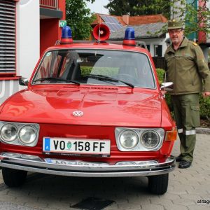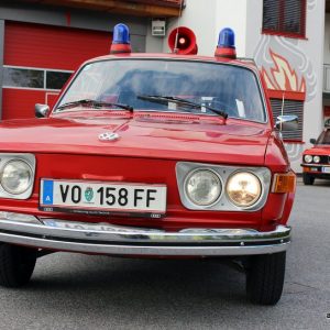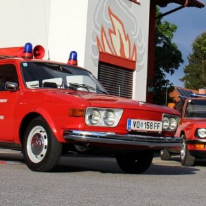 Der VW 412S Variant der FF Mooskirchen ist das ehemalige Fahrzeug des Bezirksfeuerwehrkommandanten, das nach der Ausmusterung aus dem offiziellen Dienst von den Mooskirchnern angekauft wurde und seitdem liebevoll erhalten wird. Erst im letzten Jahr hat er zeitgemäße pulverbeschichtete Stahlfelgen erhalten. Der Innenraum zeigt sich im prächtig patinierten Zustand inklusive dem Feuerwehrdienst geschuldeten Ergänzungen wie Funkgerät, Blaulicht- und Folgetonhornsteuerung. Die typischen 70er Ingredienzien wie Kunstleder auf den Sitzen, sowie Holzfolie auf der Armaturentafel zieren auch den 412S, wie so viele Fahrzeuge aus jener Ära. Der Boxersound ist unverkennbar, auch wenn er hier aus 1,8 Litern Hubraum kommt. Klingt gut, zieht kräftig an, hat seinen sehr eigenen Charme, ein Blickfang ist man damit auf jeden Fall – nicht nur im vollen Feuerwehrtrimm.