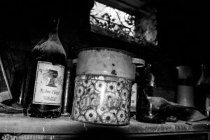 Nicht unweit davon lehnt ein Fahrrad, dick überzogen mit Spinnweben. Wandert man in das Erstgeschoss, findet man jede Menge Unordnung. Aufgerissene Schubladen, offenstehende Kastentüren, lose herumliegenden Hausrat. Dazu jede Menge Bücher, Zeitungsschnipsel, Spirituosenflaschen, uralte Bierkisten, Kochtöpfe, Spraydosen, eine mechanische Nähmaschine, ein Rasierapparat aus weststeirischer Produktion, , Werkzeugkisten, eine Rodel, Benzinkanister, Reifen, ausgelatschte Schuhe, Reiseführer, und Konservendosen vom Konsum. Dazu jede Menge persönliche Dokumente des ehemaligen Bewohners, aus denen man, zumindest teilweise, das Leben nachvollziehen kann.